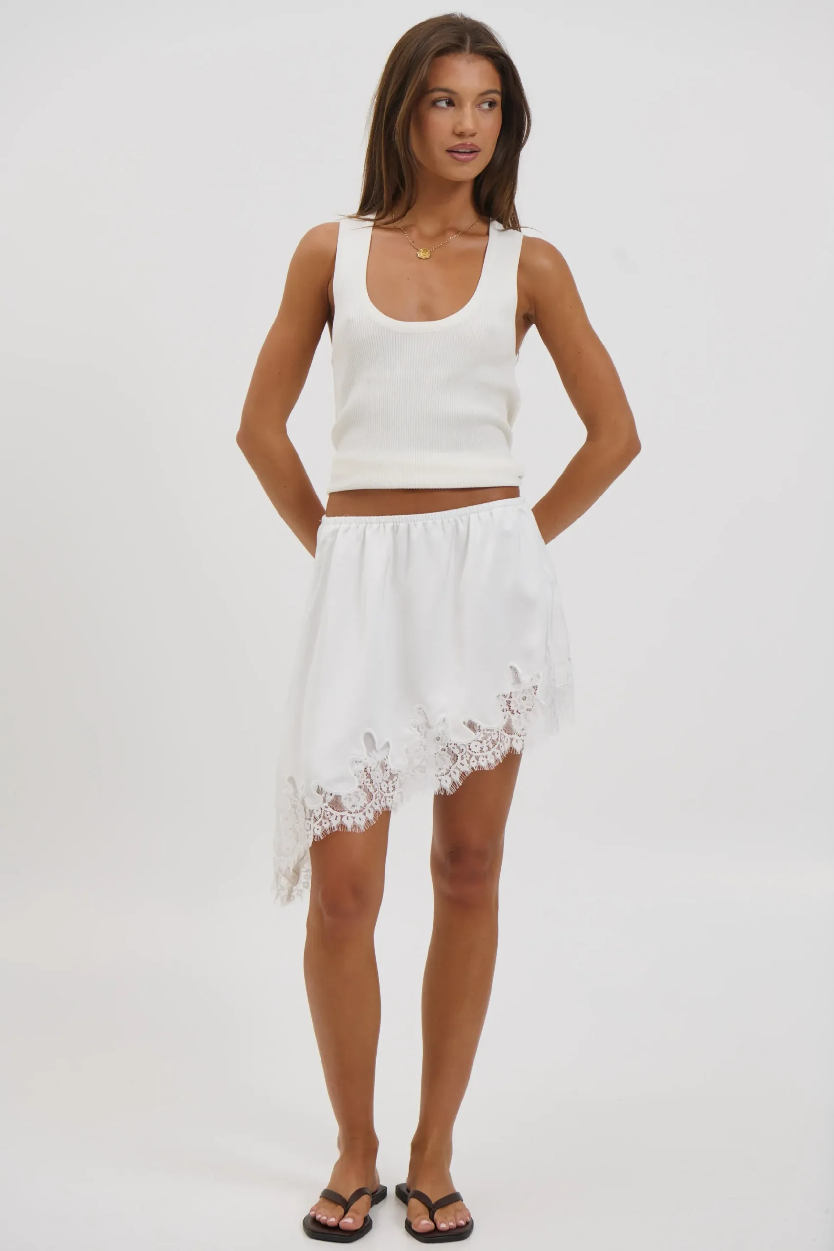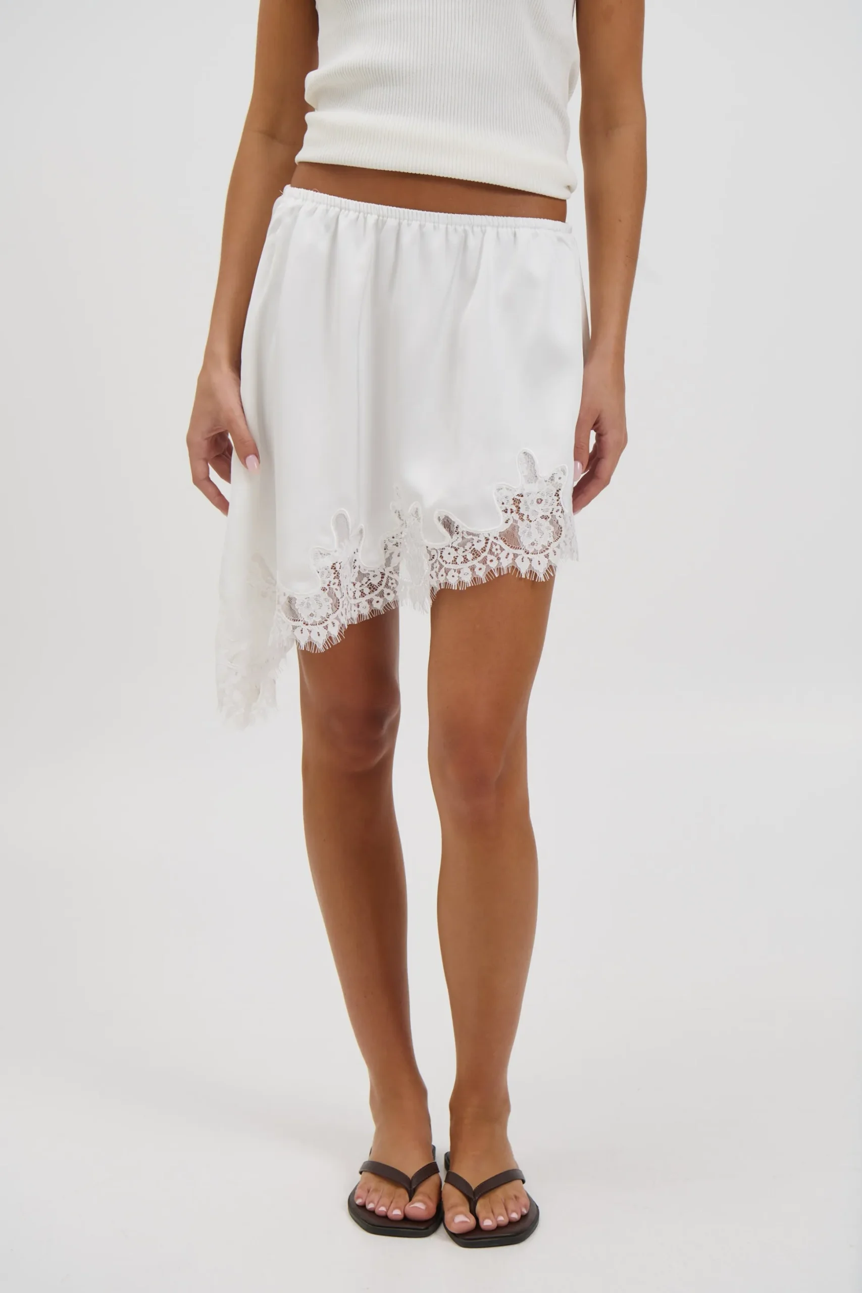 Meet the Sammi Lace Mini Skirt, Featuring a mini length with an asymmetric lace-trimmed hem, this skirt brings a delicate yet modern edge. Crafted from a silky-look fabric that drapes beautifully, it’s fully lined for comfort and coverage. Finished with an elasticated waistband for an easy, flattering fit.