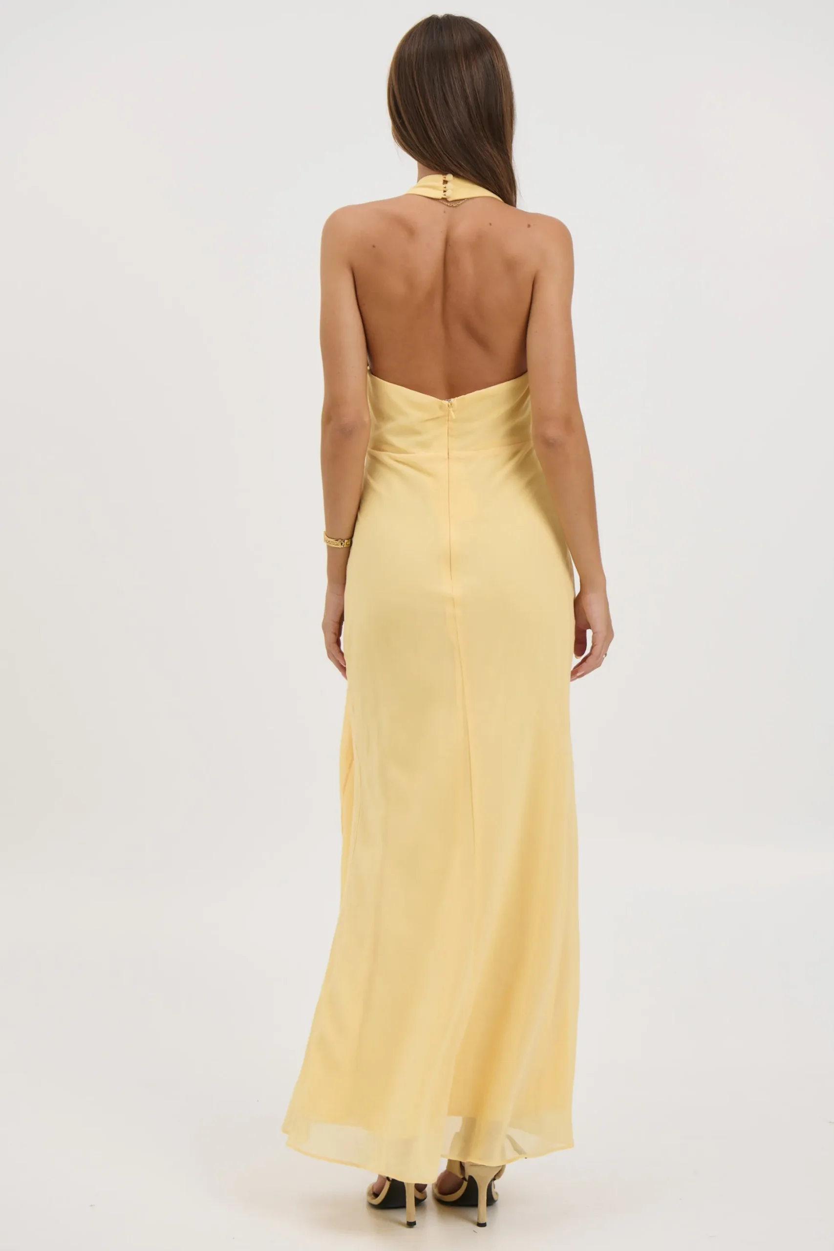 Meet the Sarena Midi Dress, designed with a flattering halter neckline and a feminine V neckline that enhances the silhouette. The midi length offers an elegant, modern feel, while a back zip closure provides a smooth, secure fit.