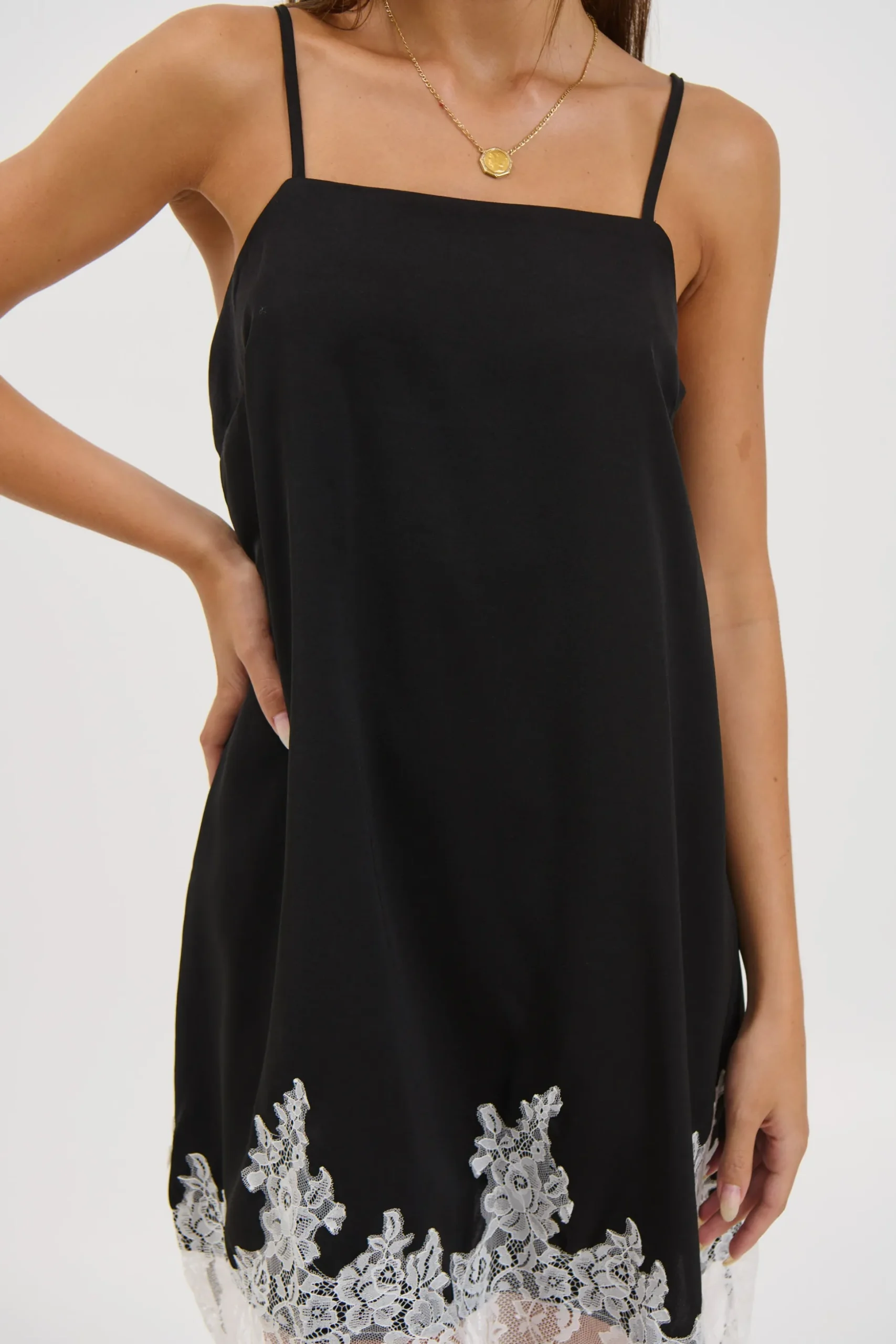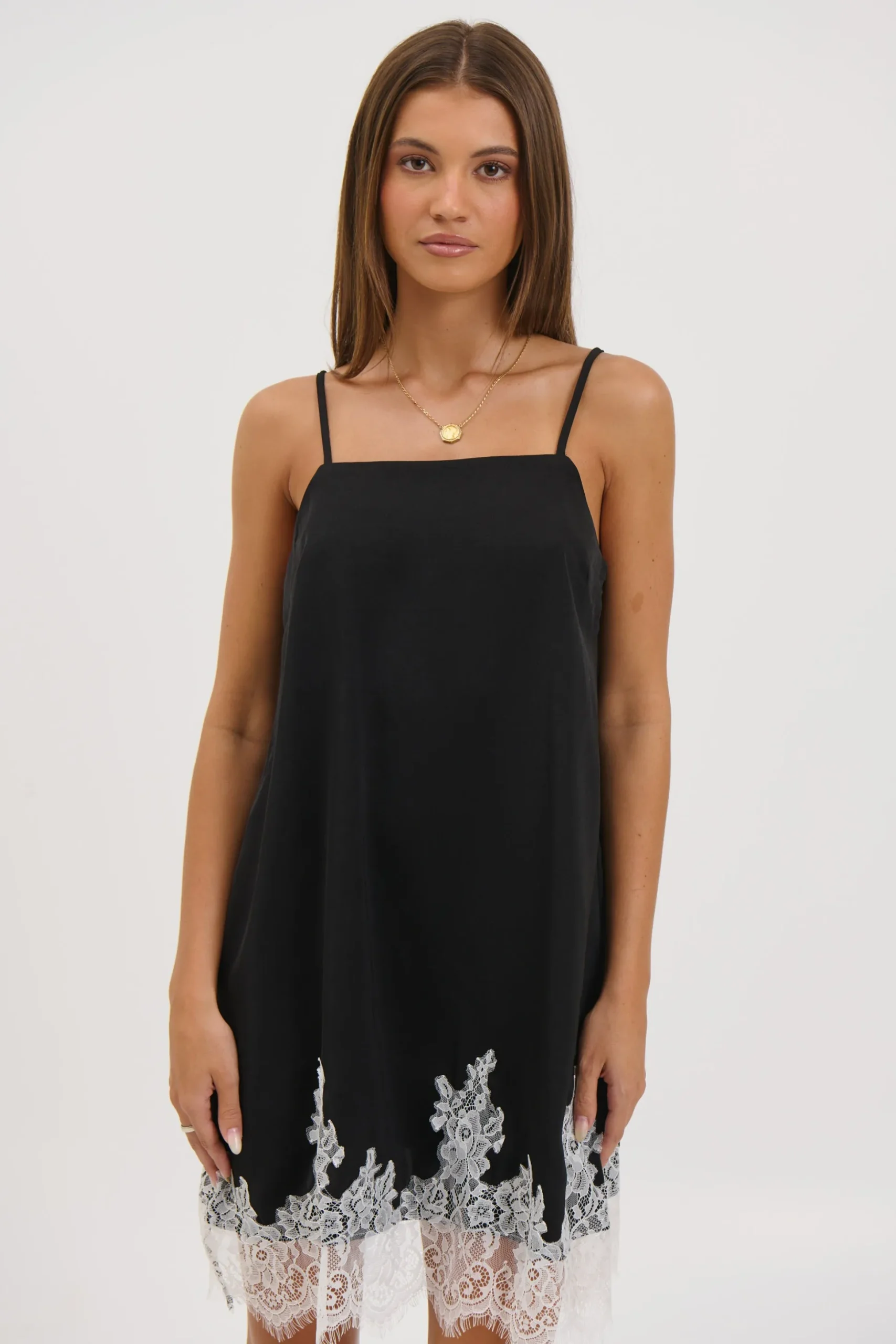 Meet the Sarita Mini Dress, features a relaxed, loose-fitting silhouette that drapes comfortably on the body. Designed with a clean square neckline for a contemporary touch, it’s finished with a delicate contrasting lace hem that adds softness and subtle detail.
