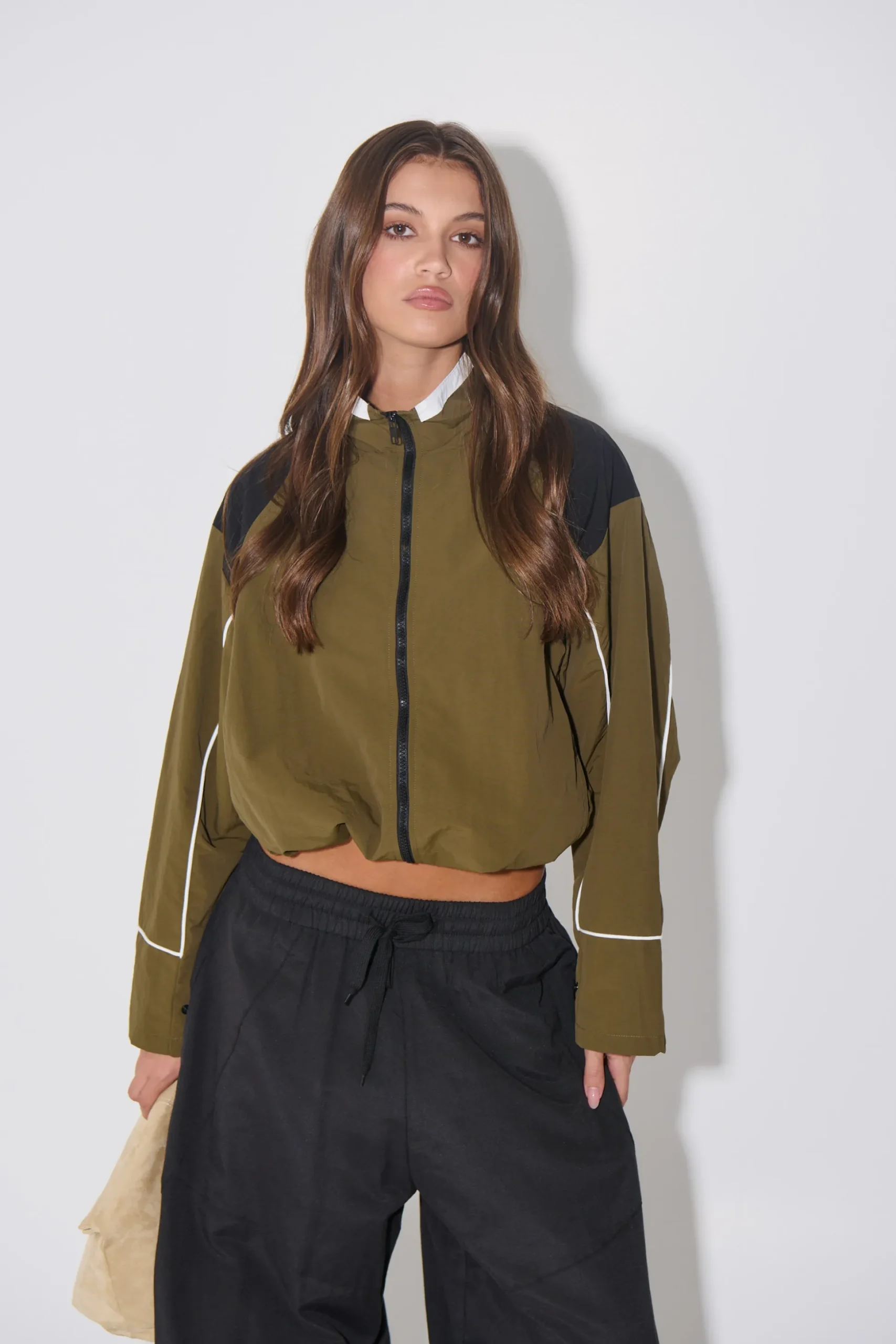 The Shoreline Windbreaker is designed to fit true to size, featuring a high neckline, zip closure with a storm flap, and an adjustable hem. Its slightly cropped silhouette is crafted entirely from 100% cotton for comfort and durability.