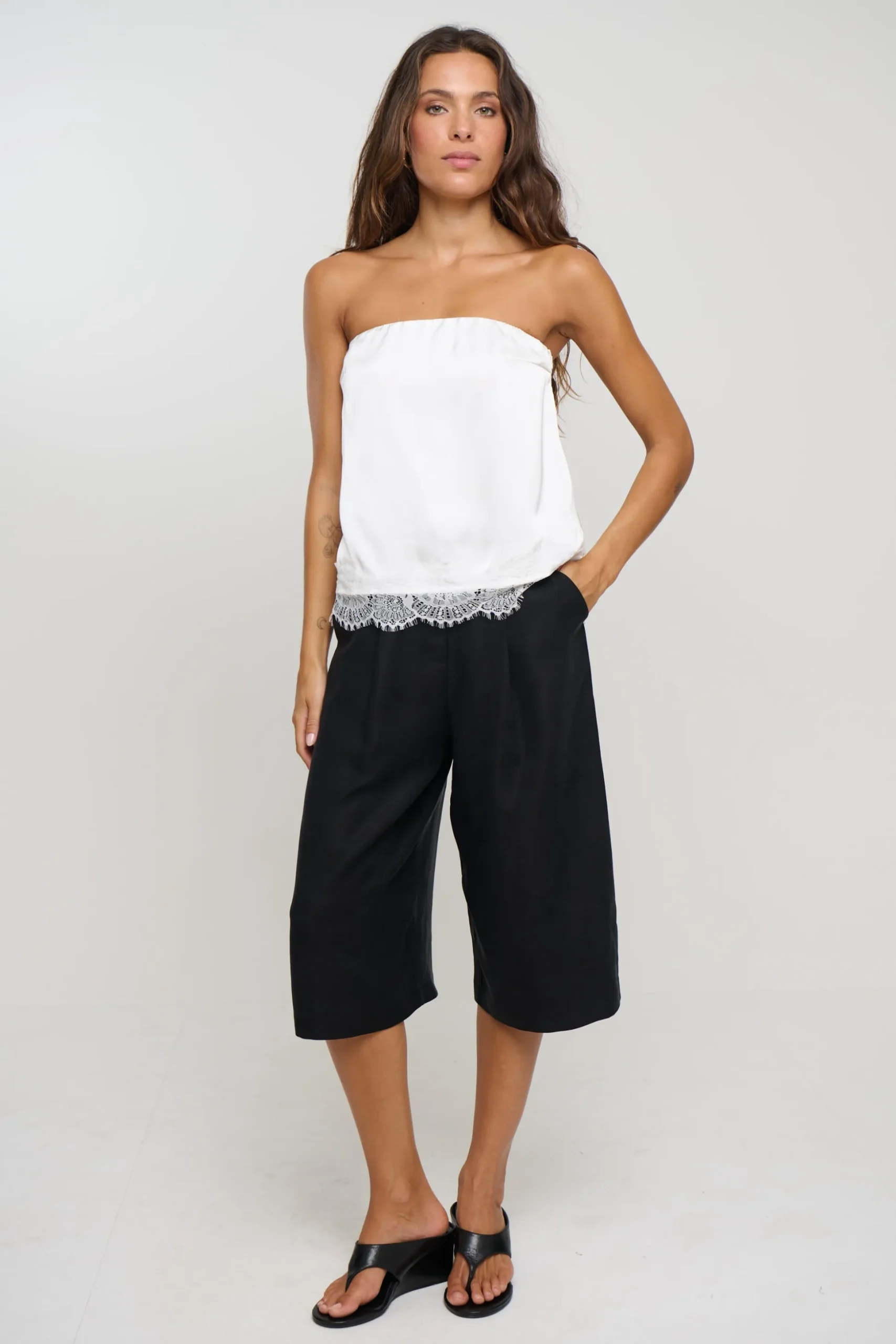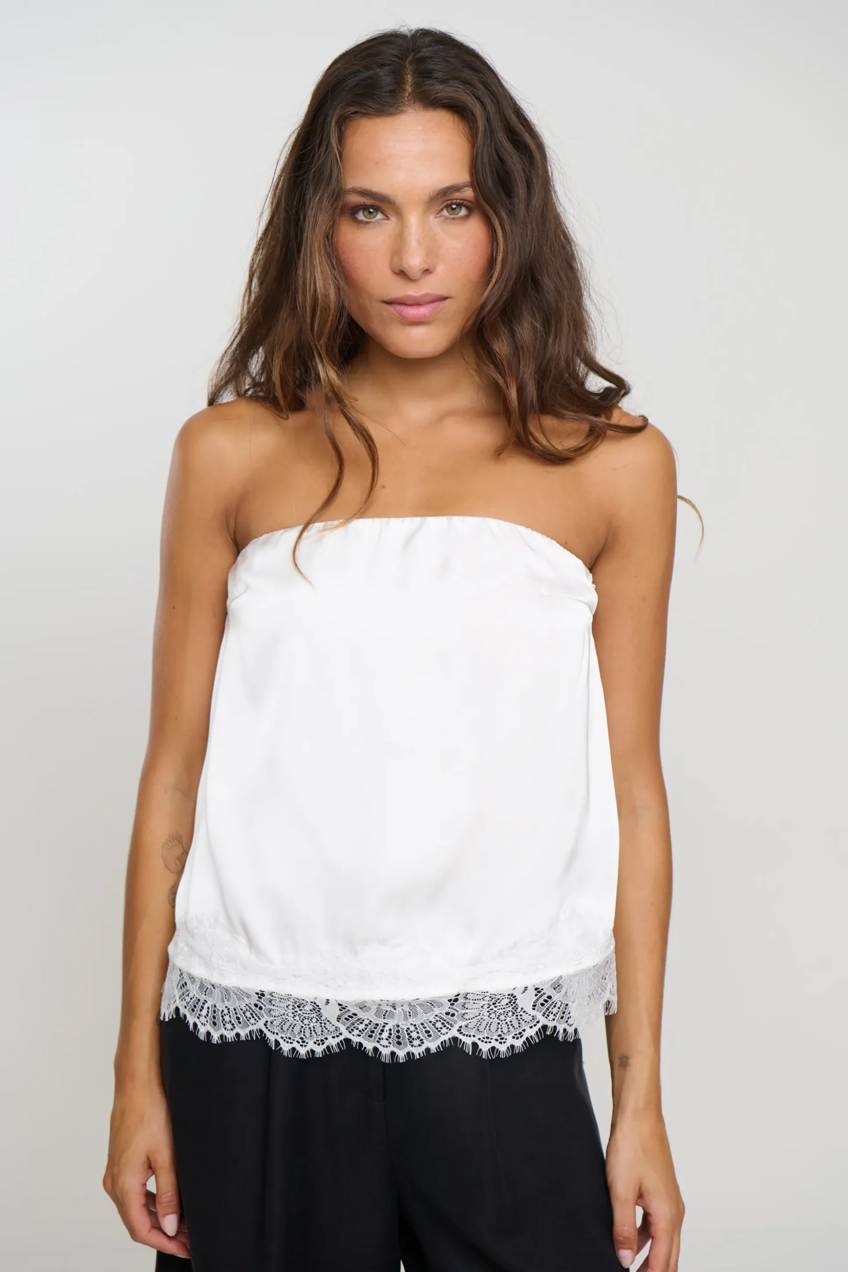 Meet the Stassie Strapless Top, features a sleek strapless neckline for a clean, modern look. The elasticated back band offers comfort and a secure fit, while the side zip closure ensures easy wear. Cut to a flattering cropped length, it’s finished with a delicate lace hemline that adds soft texture and feminine charm.