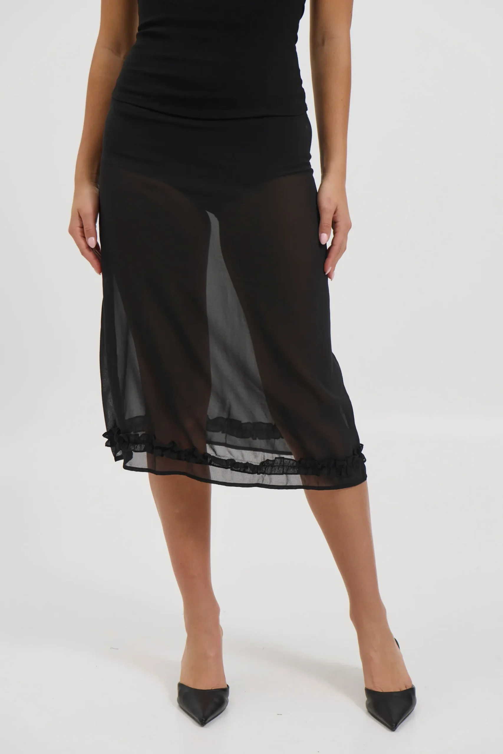 Meet the Tallulah Sheer Skirt, Featuring a midi length and crafted from sheer mesh with playful polka dots, this skirt is finished with a delicate ruffle hem and a discreet side zipper for easy wear. Elegant yet flirty, it’s perfect for layering or making a statement on its own.