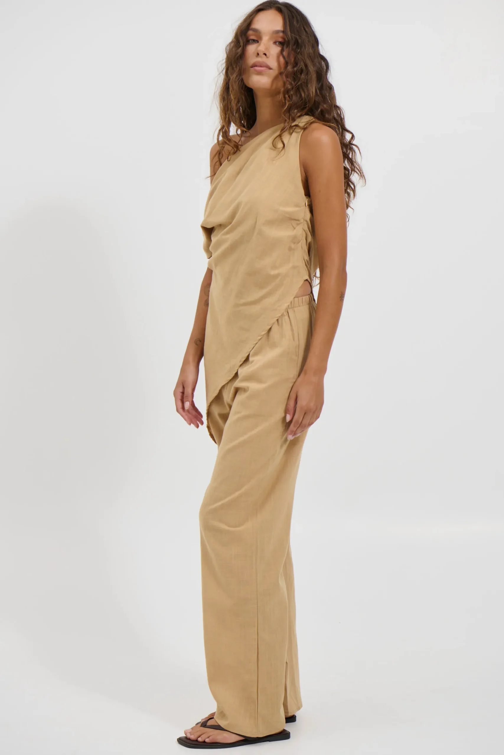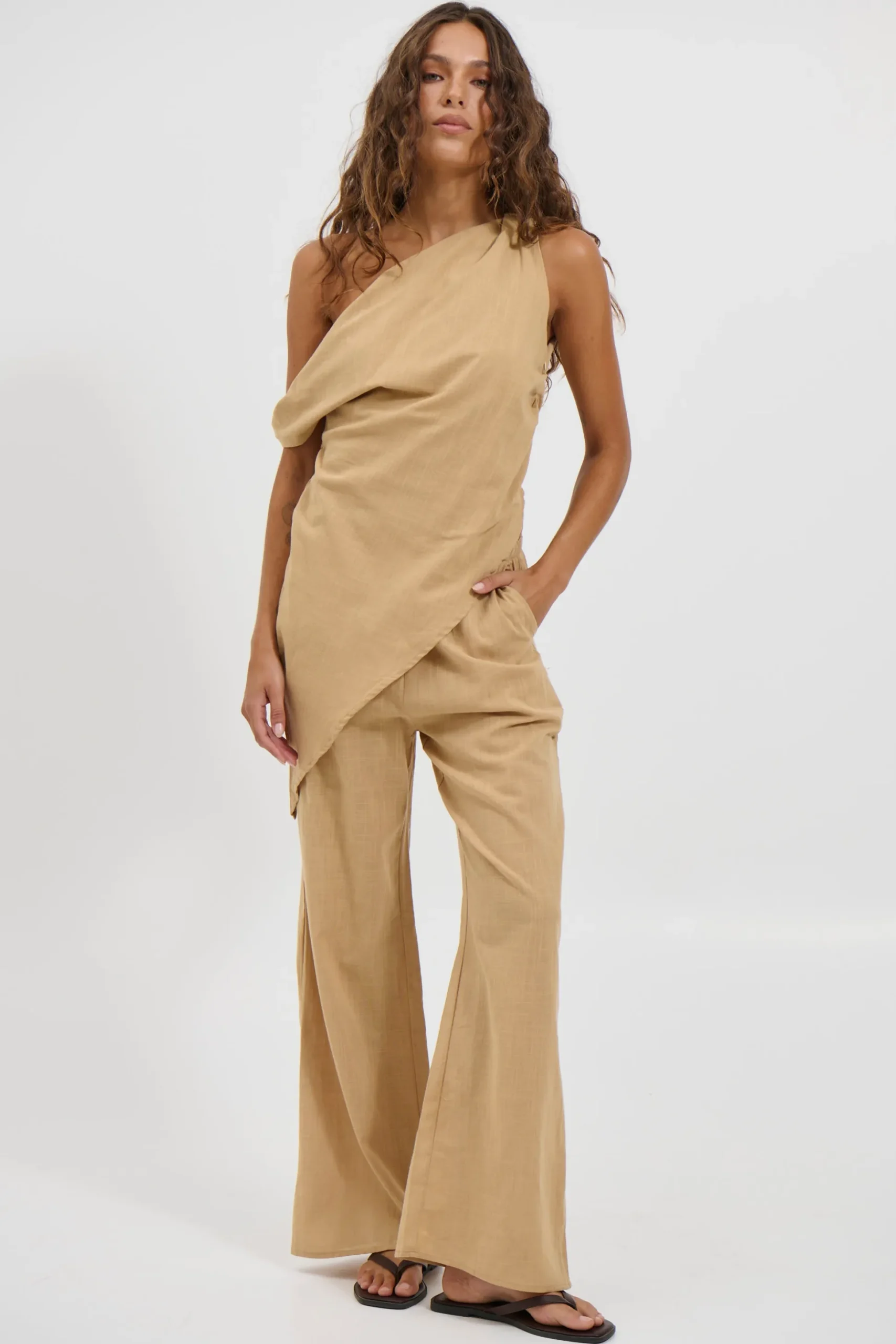 Meet the Tasi Set. This piece combines comfort and style with relaxed-fit pants and an off-the-shoulder top, both crafted from 100% cotton. The pants feature a comfortable elasticated waistband, and convenient side pockets. The top offers a modern twist with its asymmetrical, off-the-shoulder neckline and hemline, unlined for a lightweight feel and side zipper for ease. Perfect for effortless elegance and all-day wear