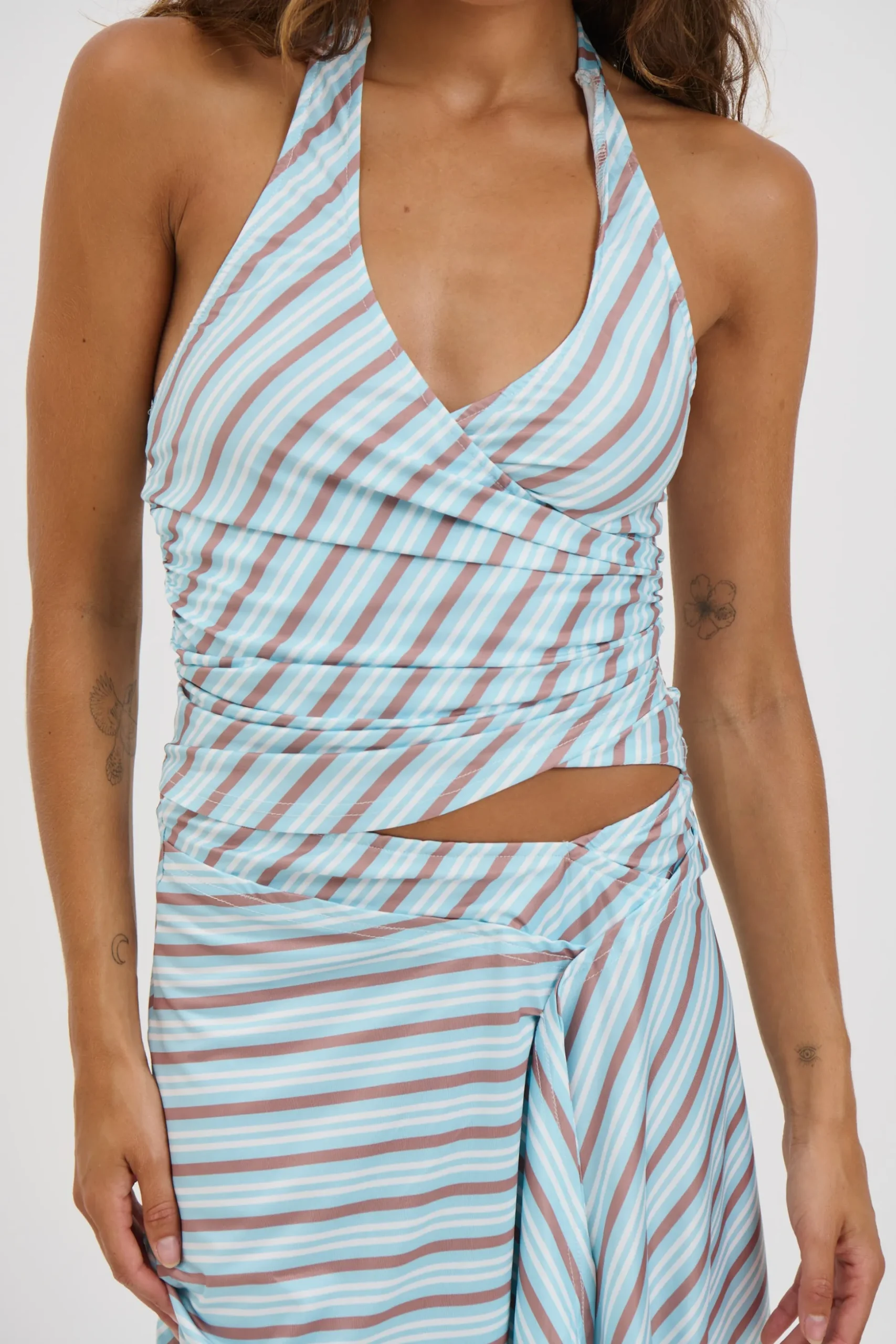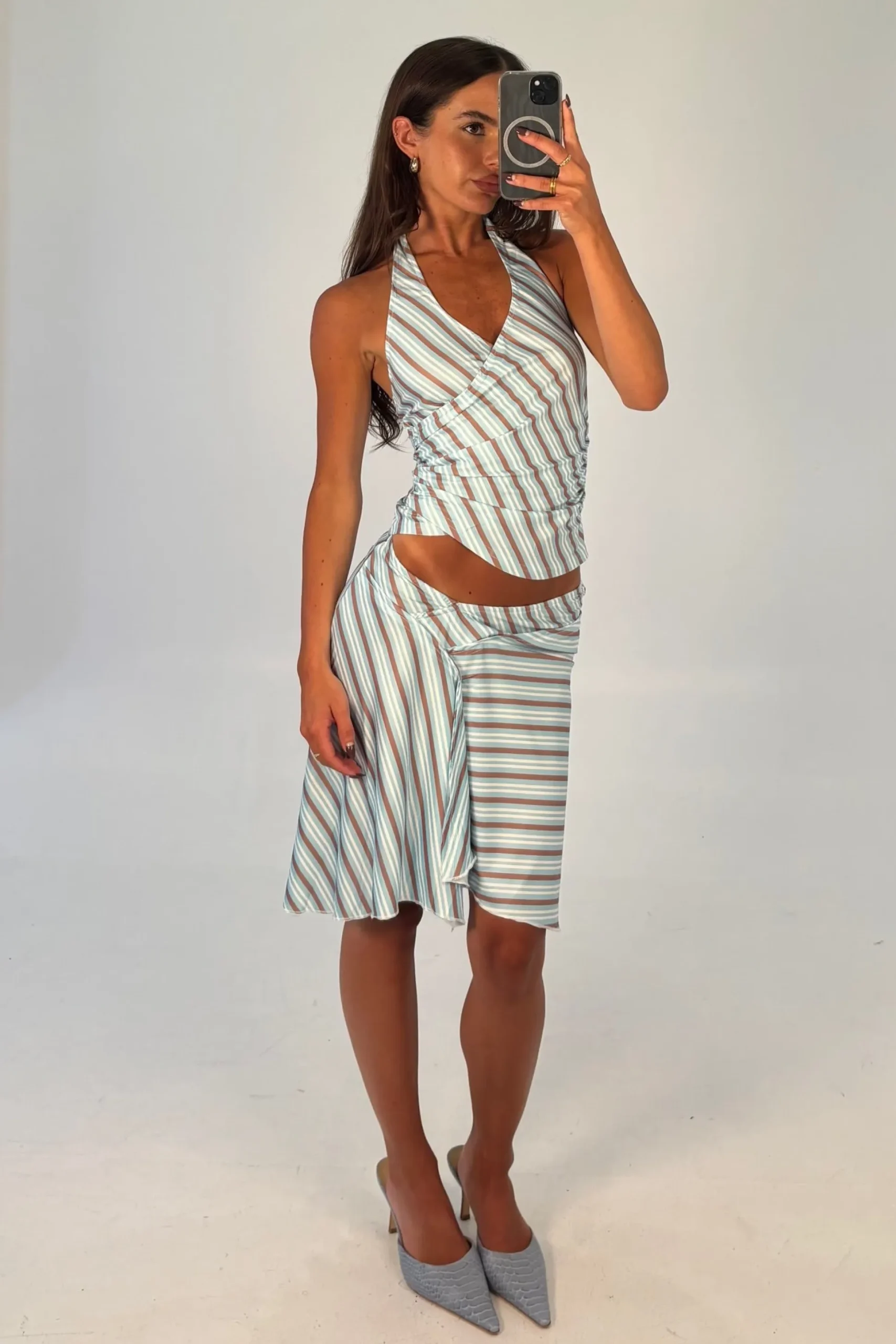 Meet the Tate Set, Featuring a coordinated top and skirt set designed to make an effortless statement. The long mini to midi skirt is cut with an asymmetric hem for fluid movement and finished with a comfortable elasticated waistband. Paired with a matching striped halter top, the silhouette is slightly cropped with a wrap-look detail that adds soft shape and interest. Easy to wear together or styled separately.