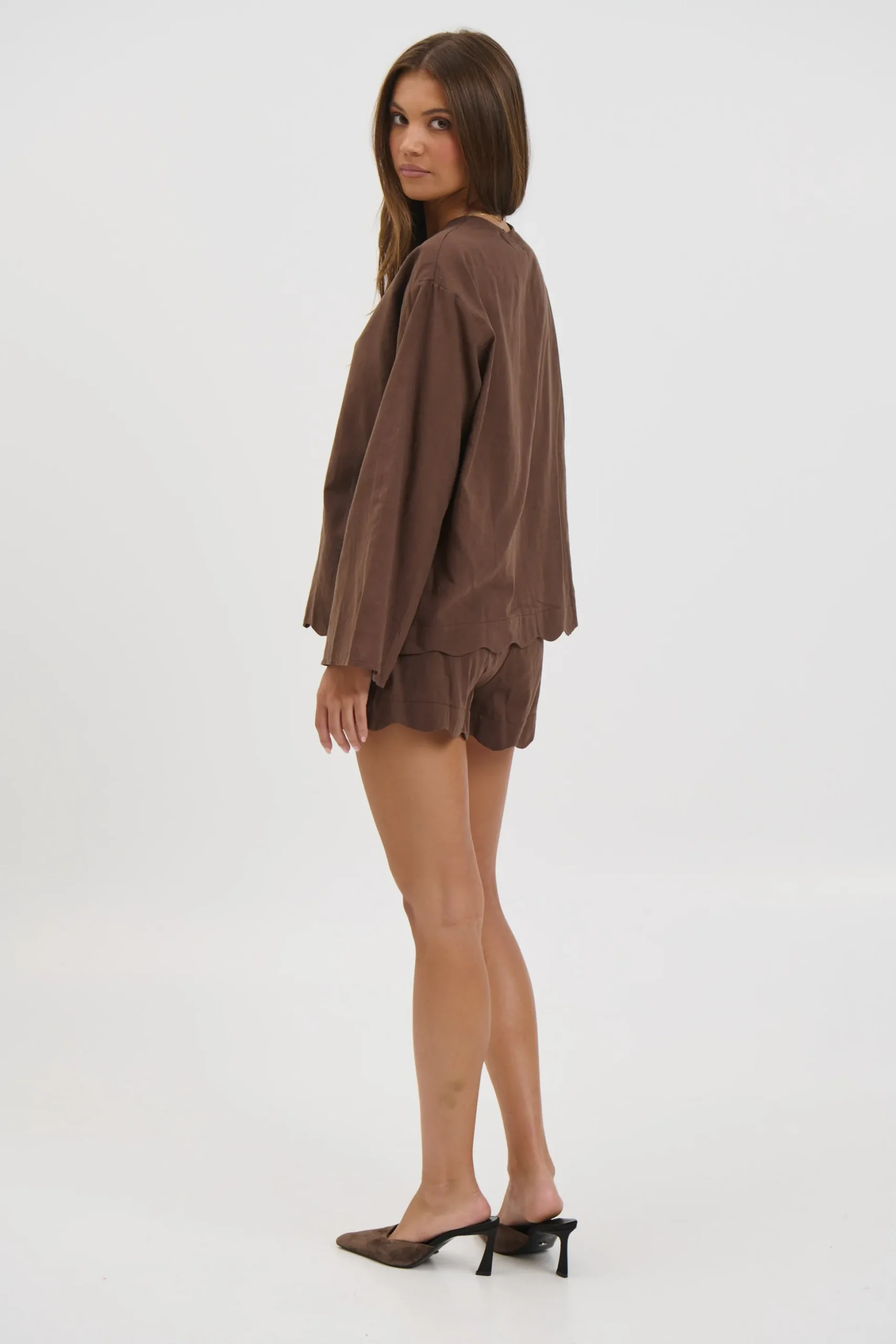 Meet the Tianna Scallop Set, The shorts feature a flattering scalloped hemline, practical side pockets, and an elasticated waistband for an easy, pull-on fit. Paired with a coordinating long sleeve shirt, the look is finished with a delicate tie-up front and matching scalloped hemline for a soft, romantic touch.