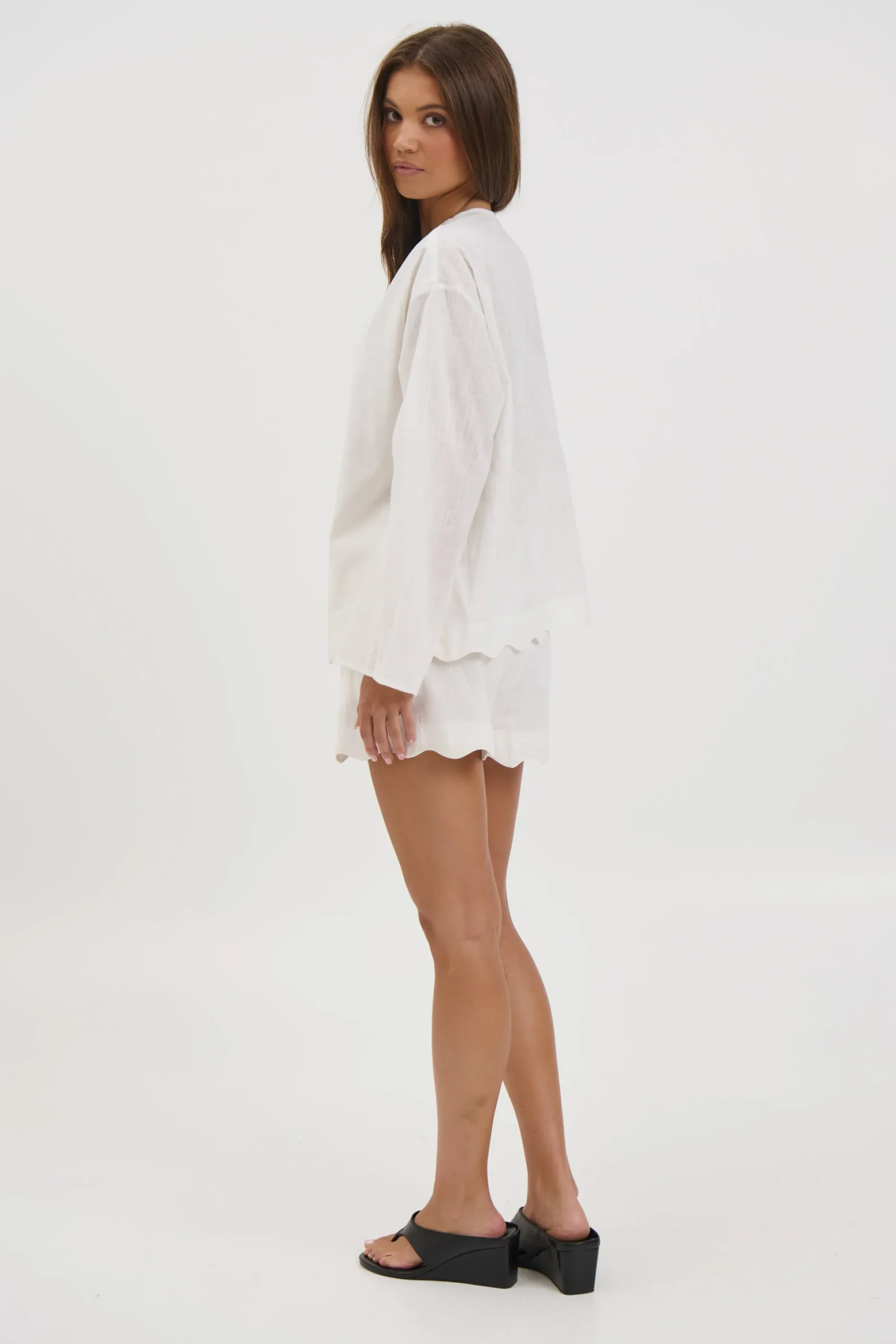 Meet the Tianna Scallop Set, The shorts feature a flattering scalloped hemline, practical side pockets, and an elasticated waistband for an easy, pull-on fit. Paired with a coordinating long sleeve shirt, the look is finished with a delicate tie-up front and matching scalloped hemline for a soft, romantic touch.