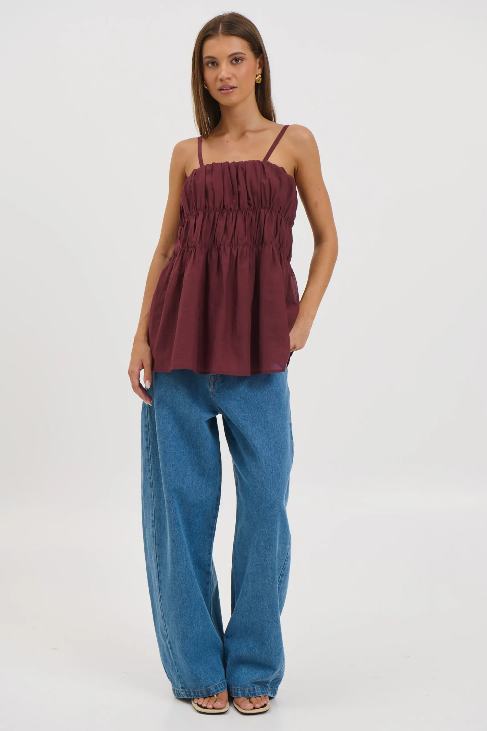 Meet the True Cami, featuring delicate adjustable spaghetti straps and a flattering tiered silhouette. The shirred detailing adds gentle texture and shape, creating an easy, flowy fit through the body. Fully lined for comfort and coverage, this piece is perfect for warm days and effortless layering.
