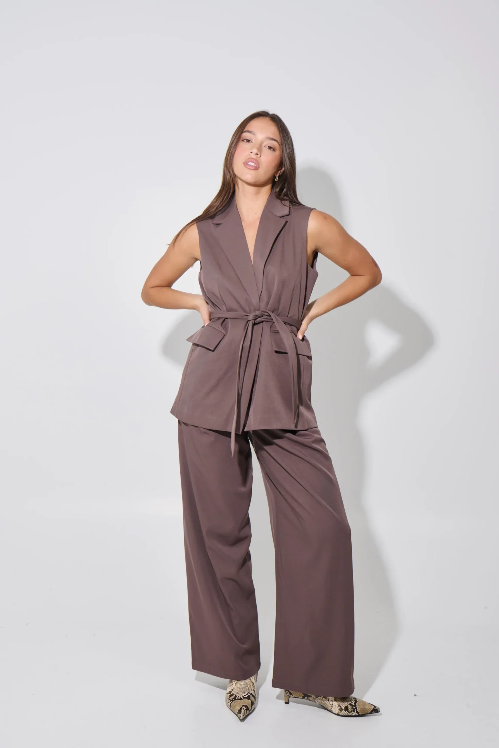 Meet the Vance Sleeveless Blazer, Featuring a tailored blazer-inspired design, this sleeveless top is complete with a sharp collar, button front closure, and a matching waist belt to cinch the silhouette. A polished yet modern piece. Pair with the Vance Pants for a sophisticated look.