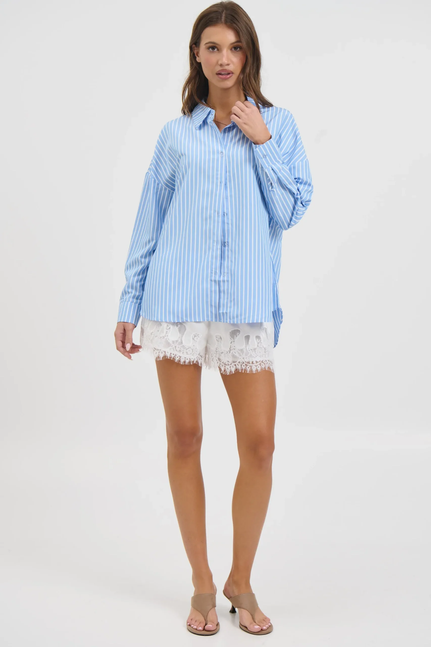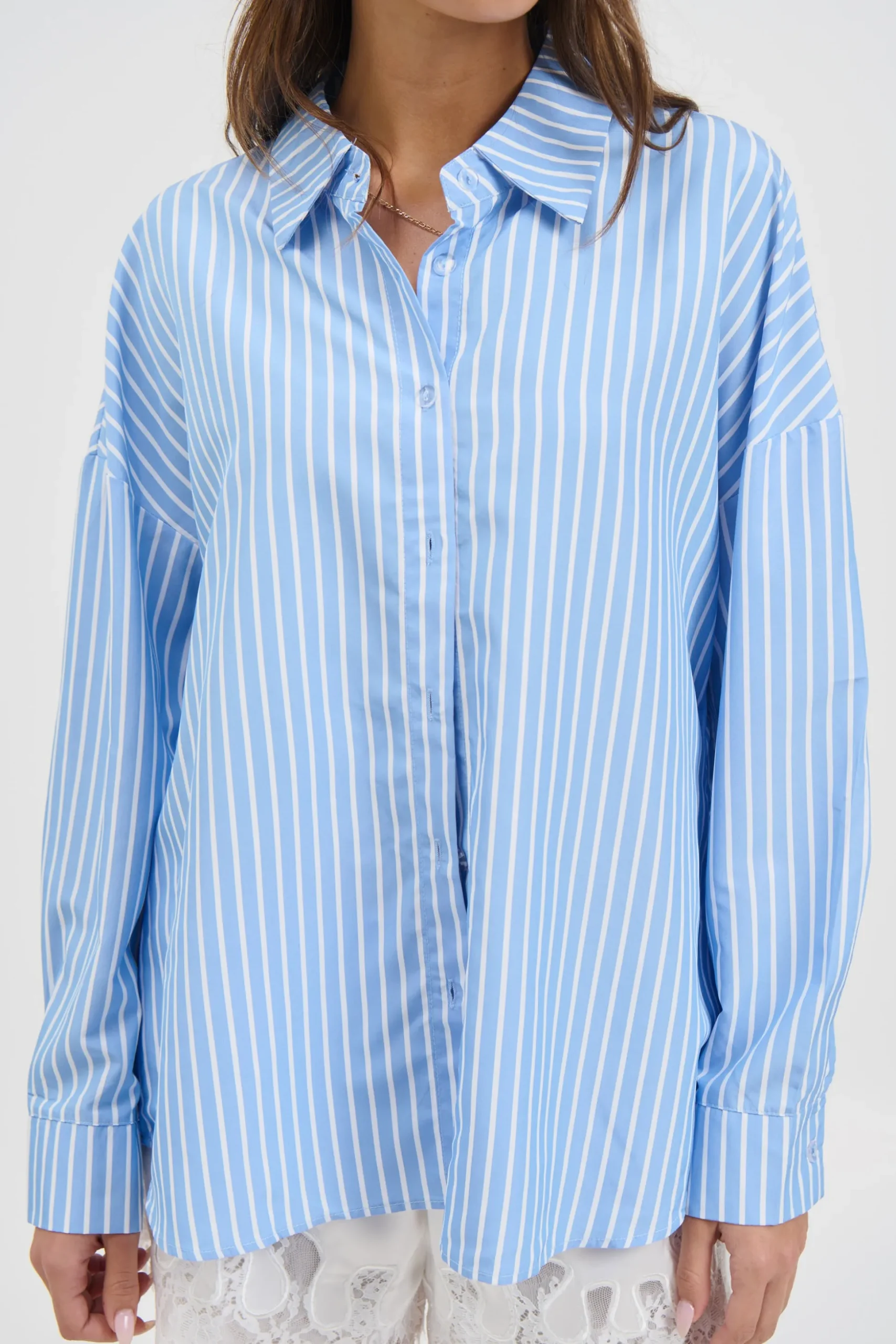 Meet the Victoria Shirt, Featuring a long sleeve shirt with a slightly oversize fit, this piece combines classic tailoring with a relaxed silhouette. The button-down front and crisp collar create a timeless look, while the subtle stripes add a touch of effortless sophistication.