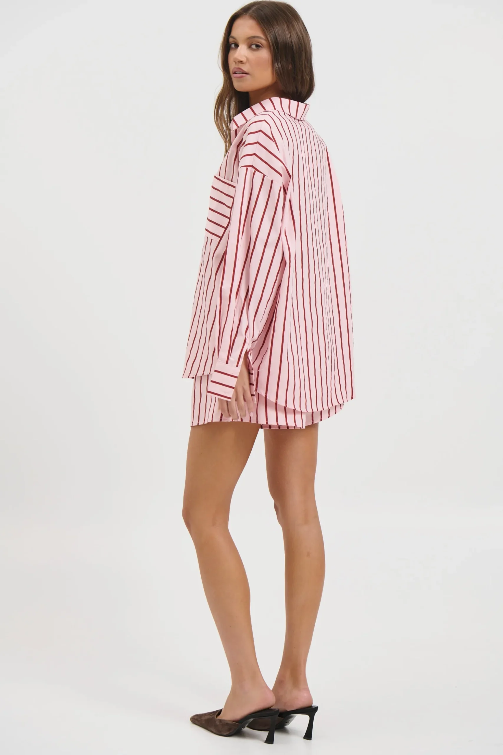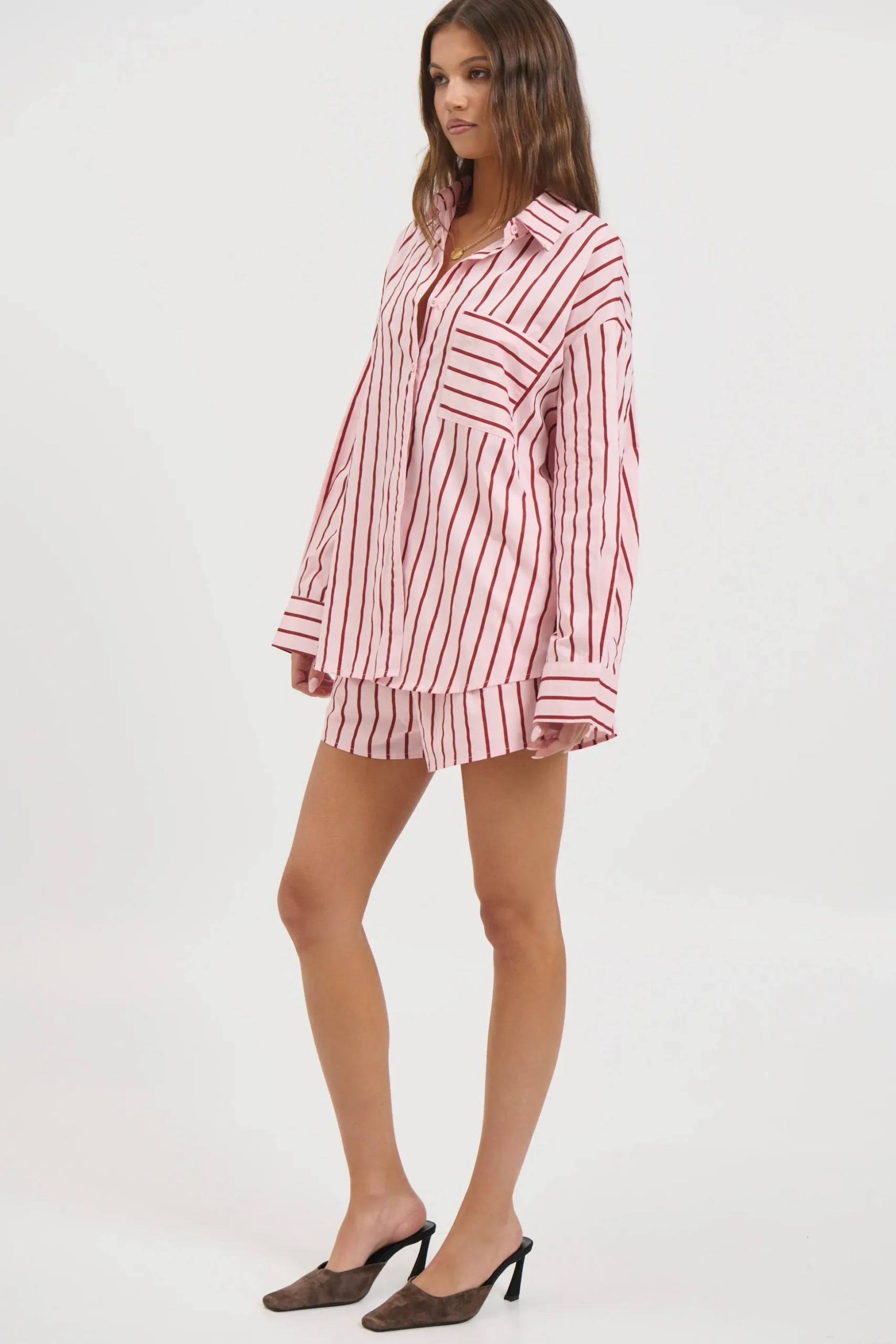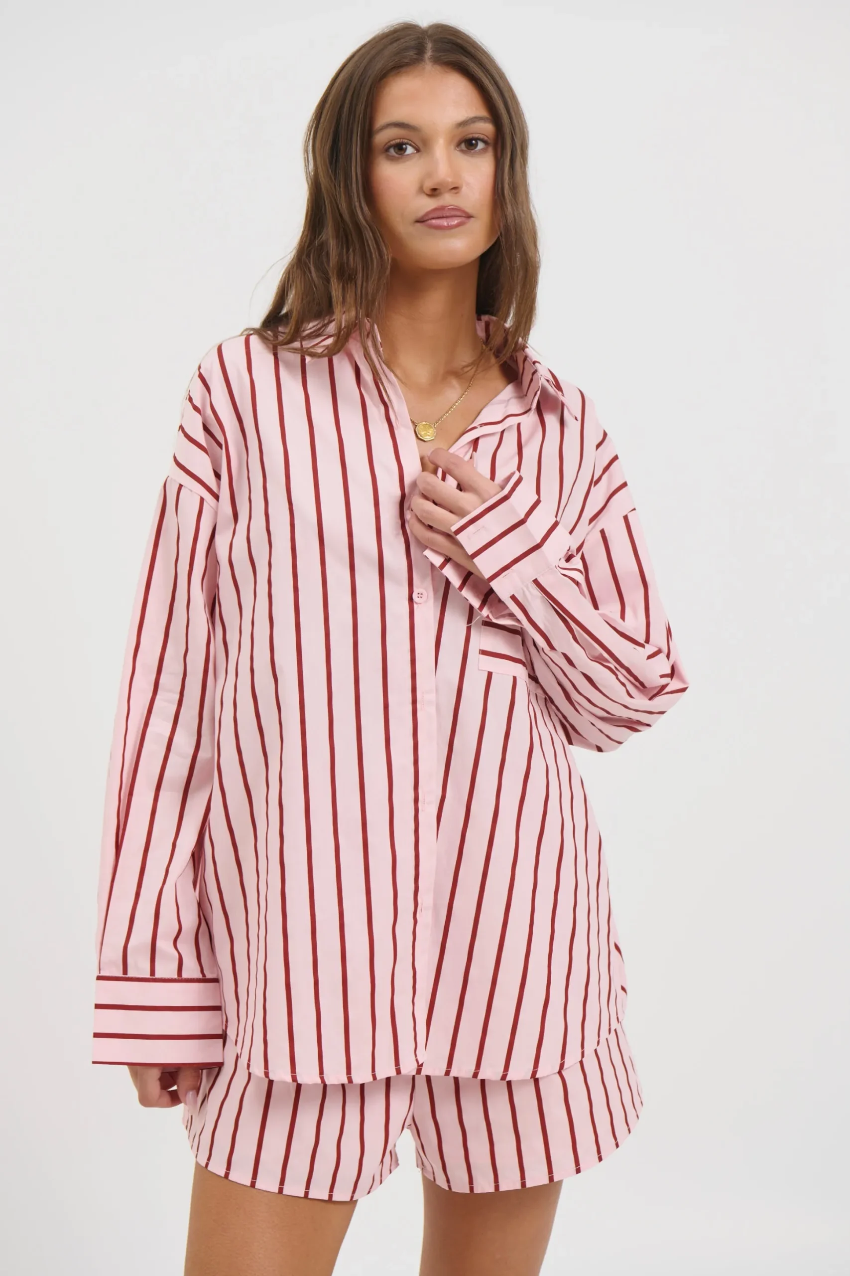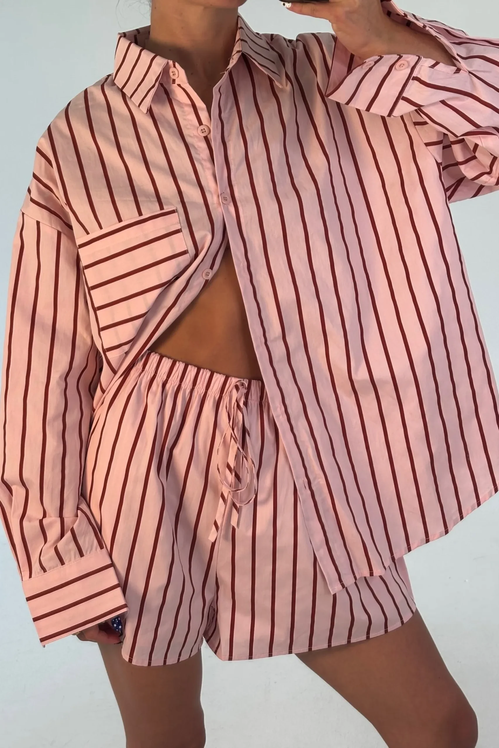 Meet the Wilson Set, Effortless and relaxed, this striped lounge set is the perfect blend of comfort and style. Featuring an oversized button down shirt with a collared neckline, dropped shoulders, and a front pocket detail, paired with matching relaxed shorts.