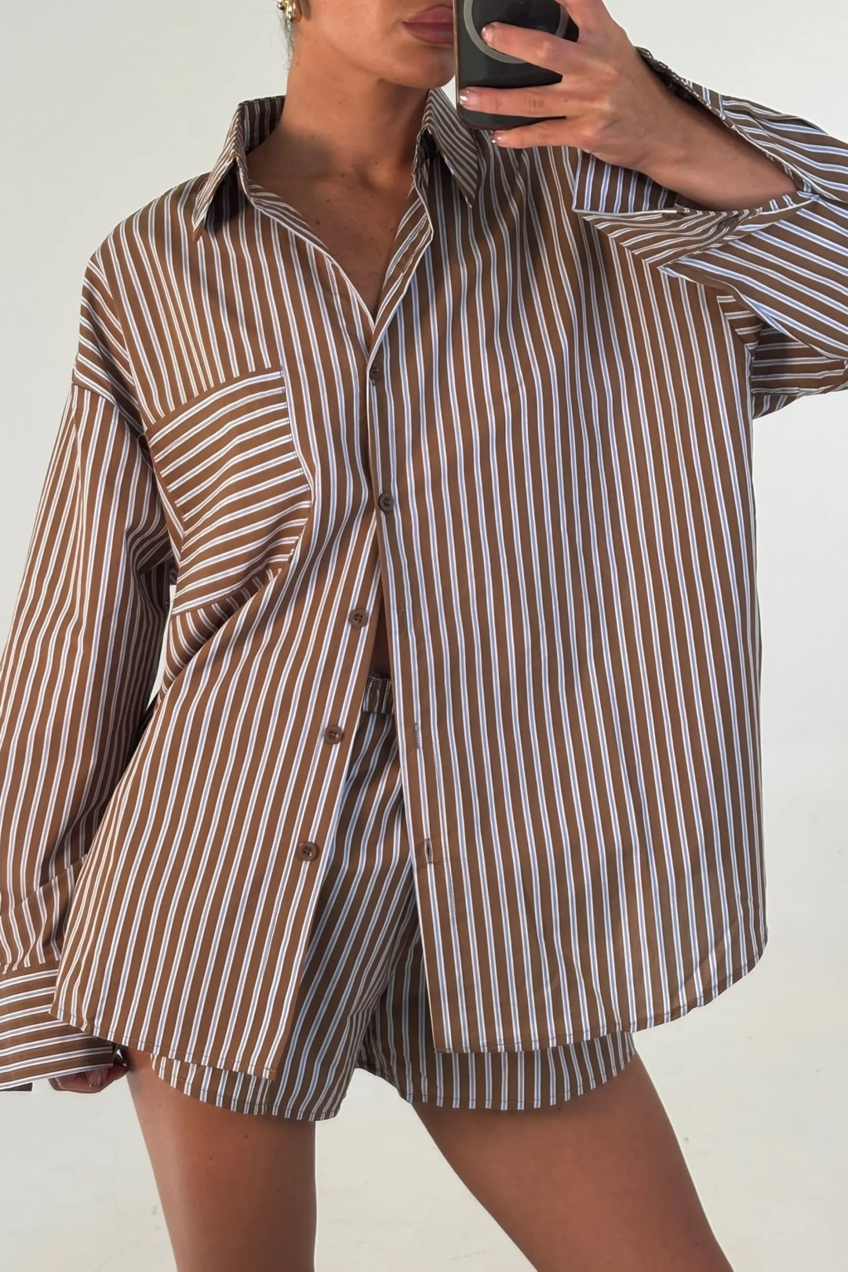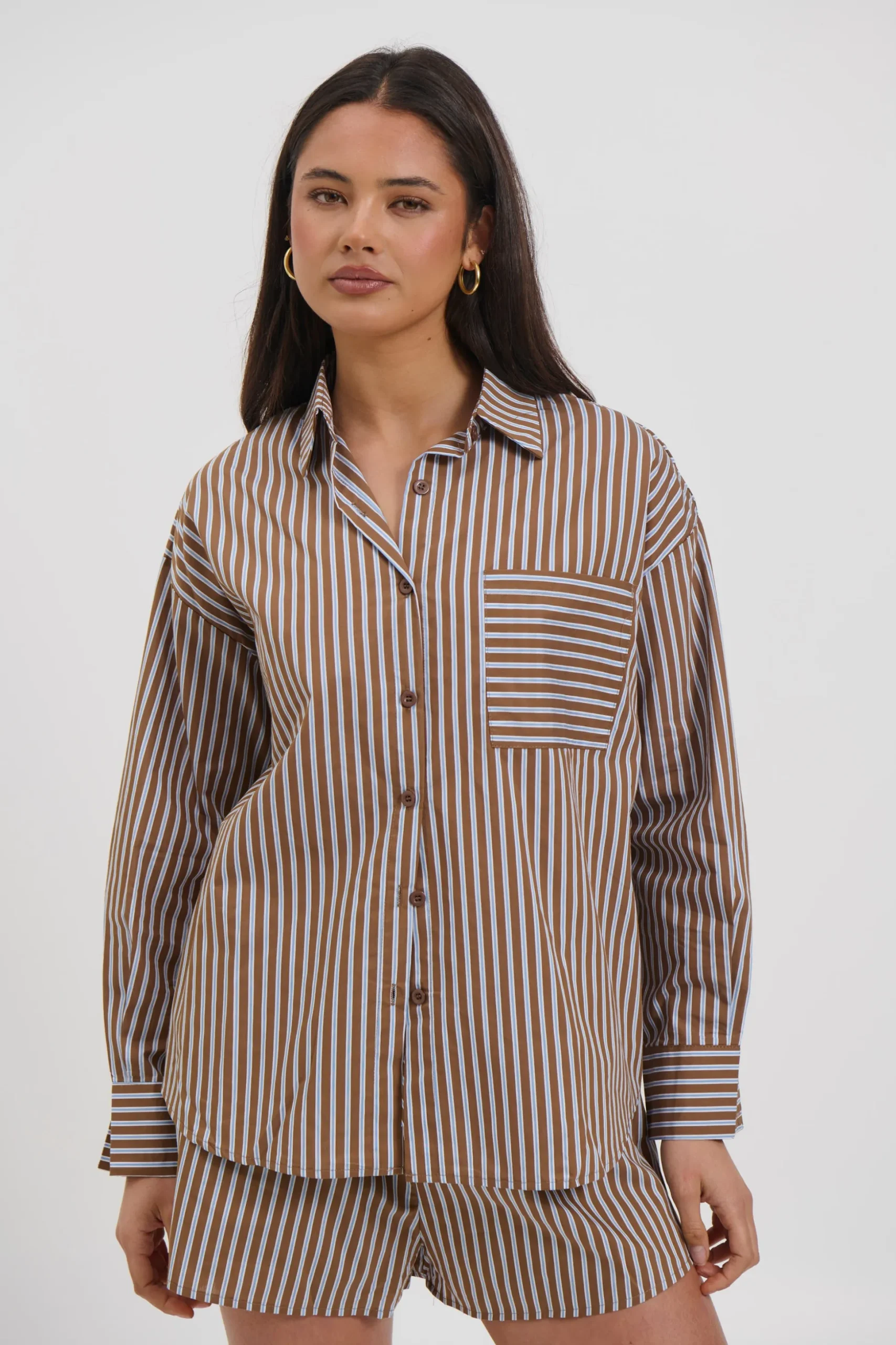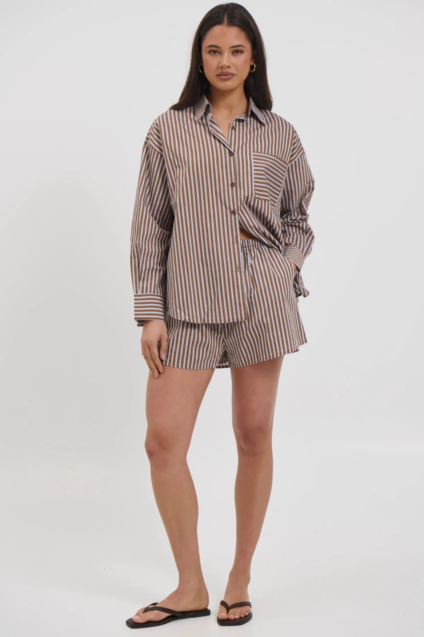 Meet the Wilson Set, Effortless and relaxed, this striped lounge set is the perfect blend of comfort and style. Featuring an oversized button down shirt with a collared neckline, dropped shoulders, and a front pocket detail, paired with matching relaxed shorts.