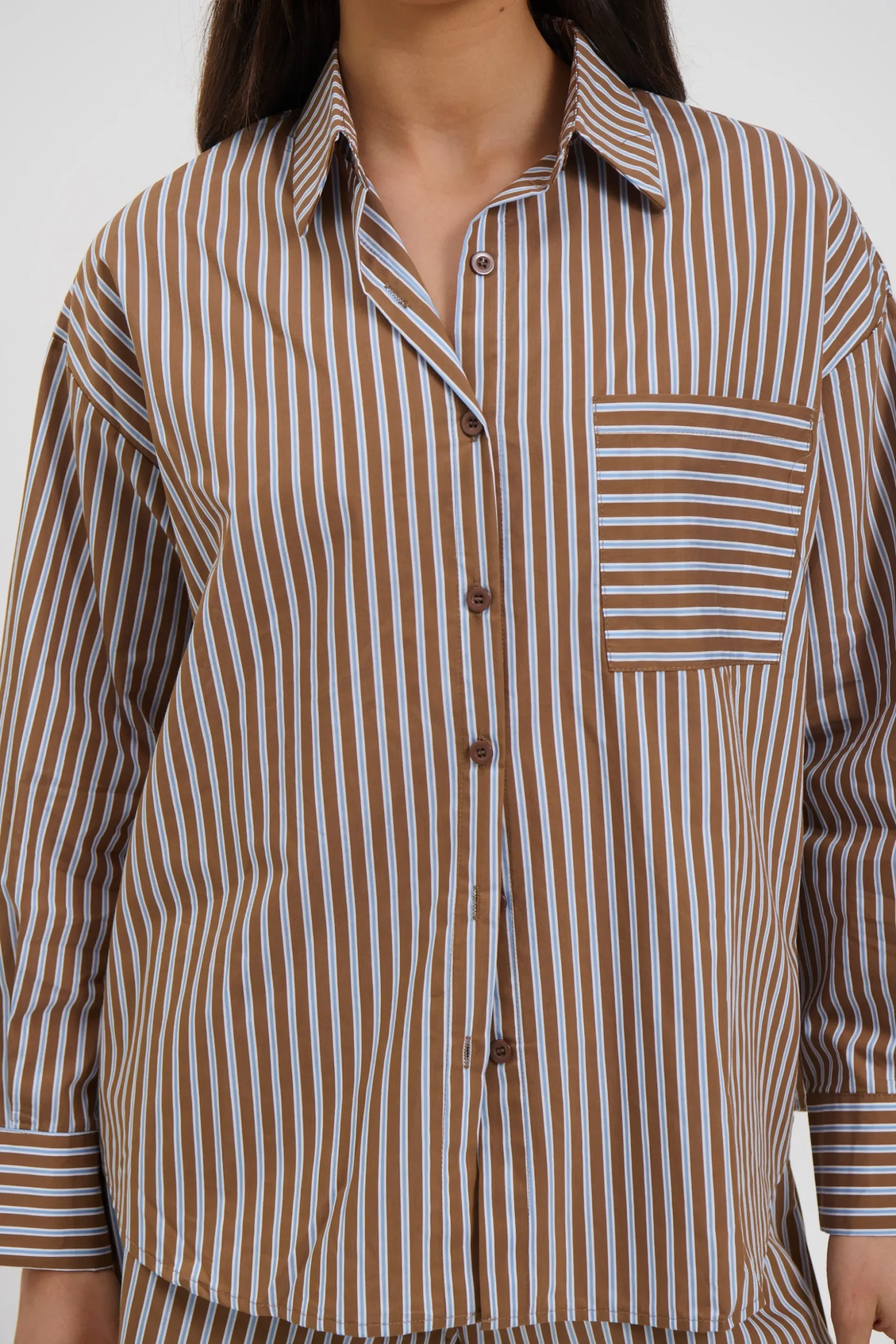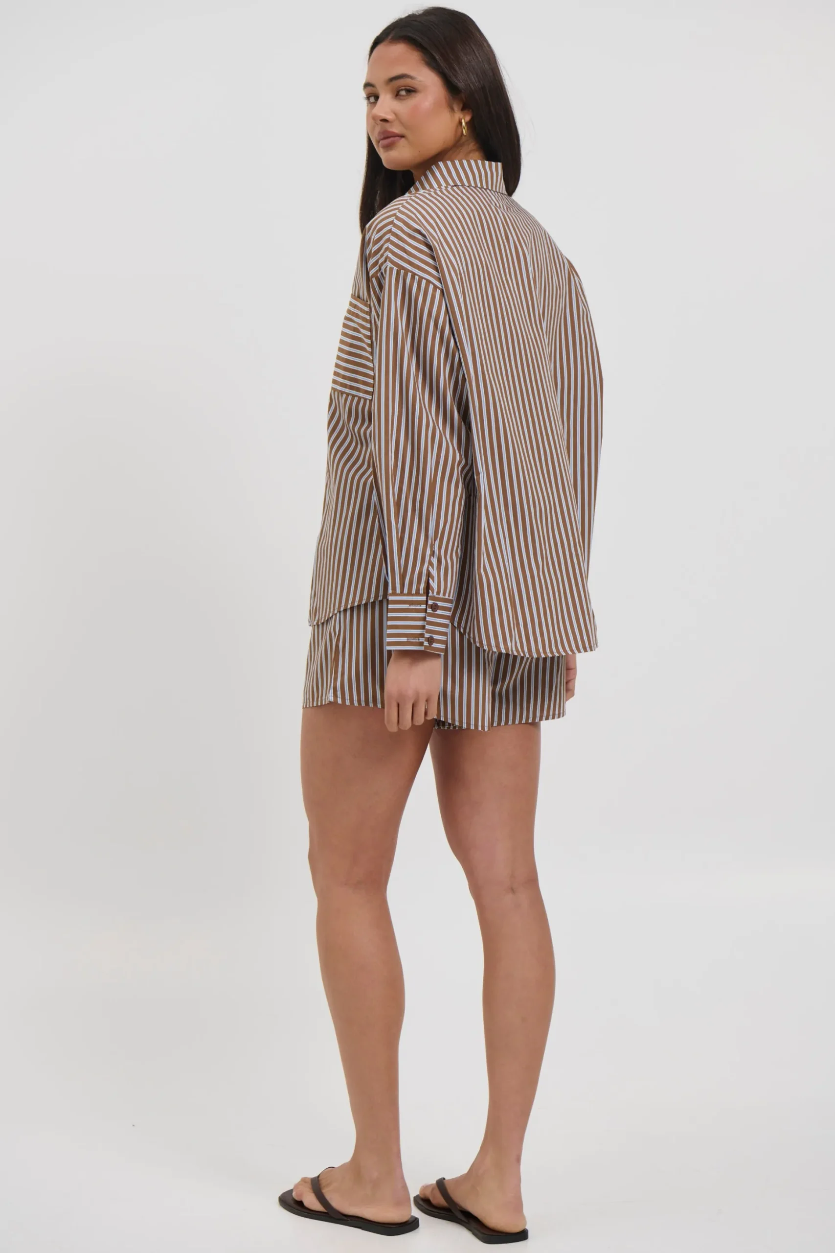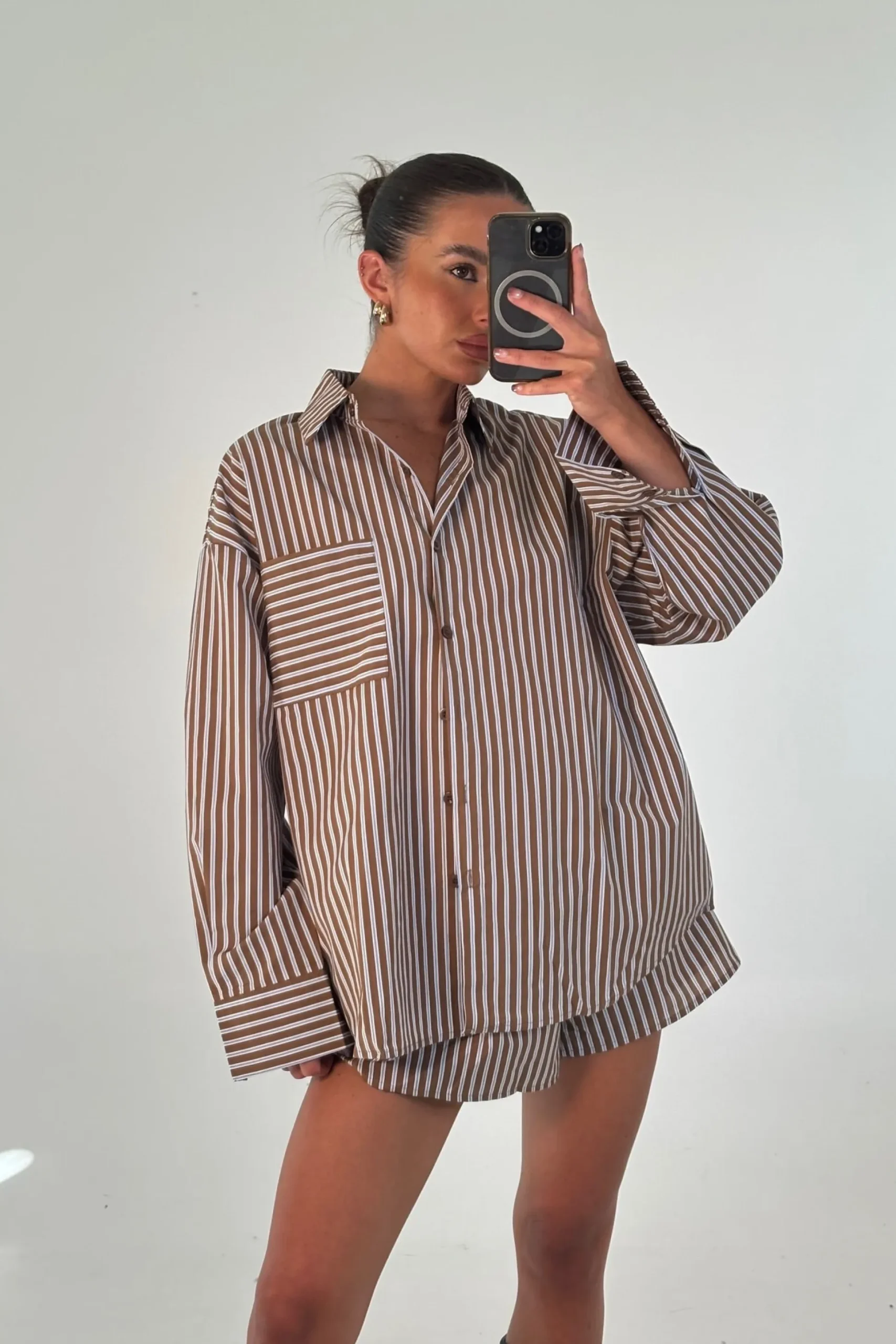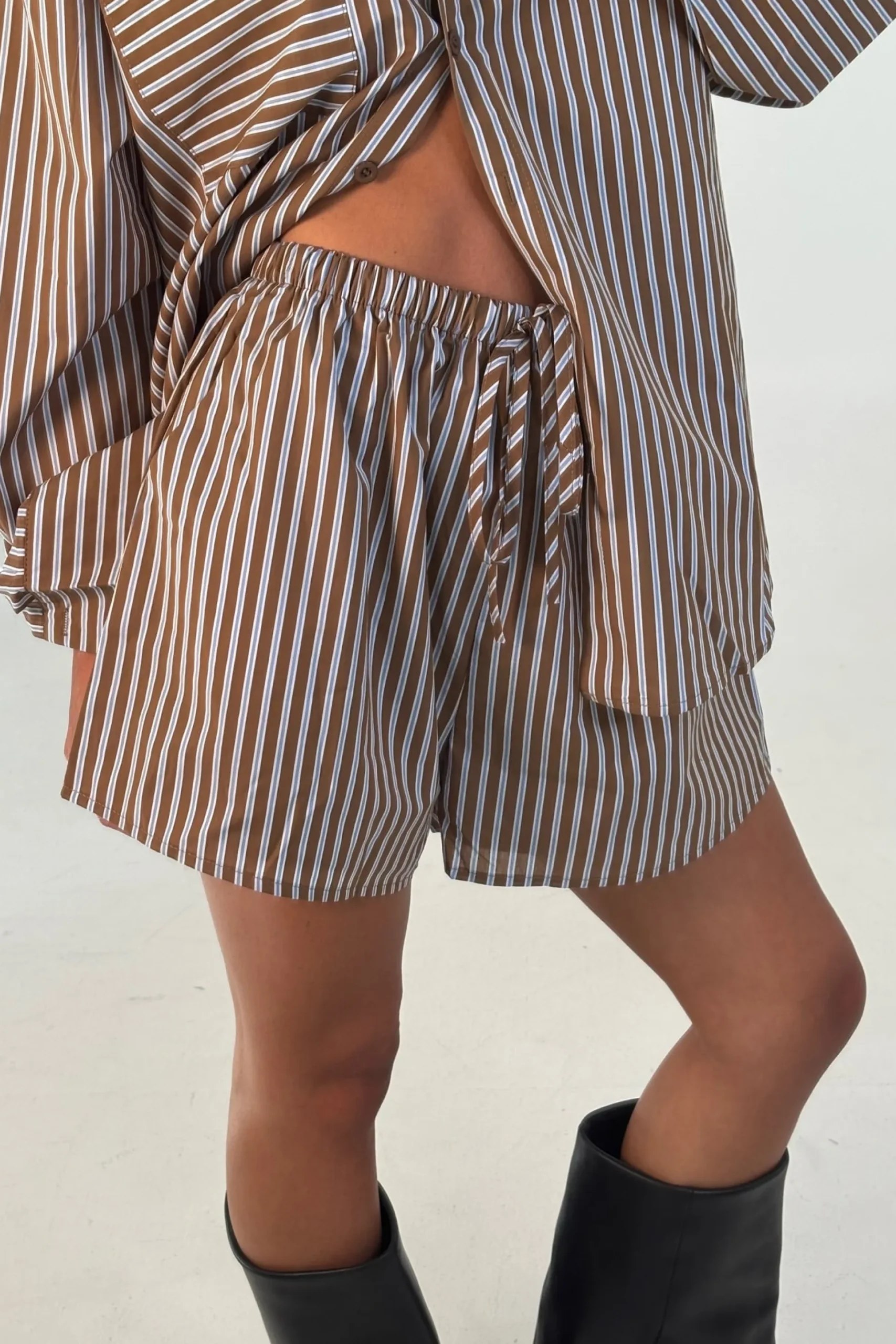 Meet the Wilson Set, Effortless and relaxed, this striped lounge set is the perfect blend of comfort and style. Featuring an oversized button down shirt with a collared neckline, dropped shoulders, and a front pocket detail, paired with matching relaxed shorts.