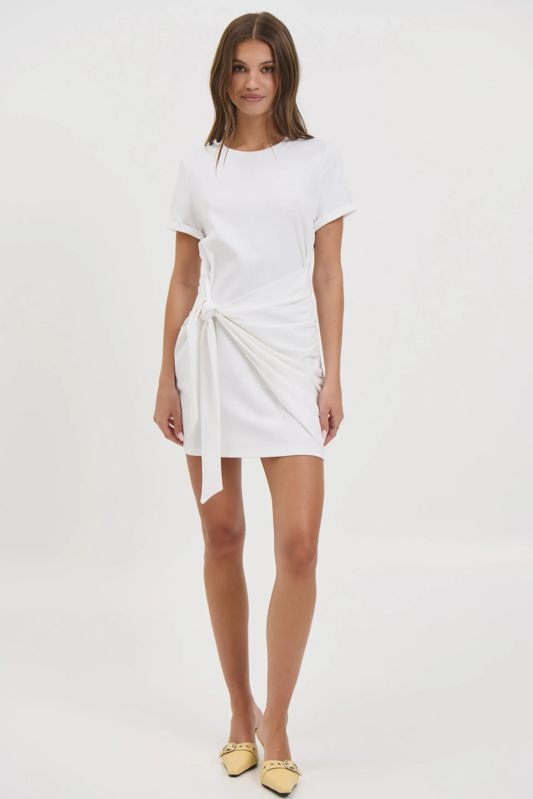 The Winnie Shirt Dress features a mini length, short cuffed sleeves, self-tie detailing at the front, a crew neckline, unlined and slightly sheer under light.