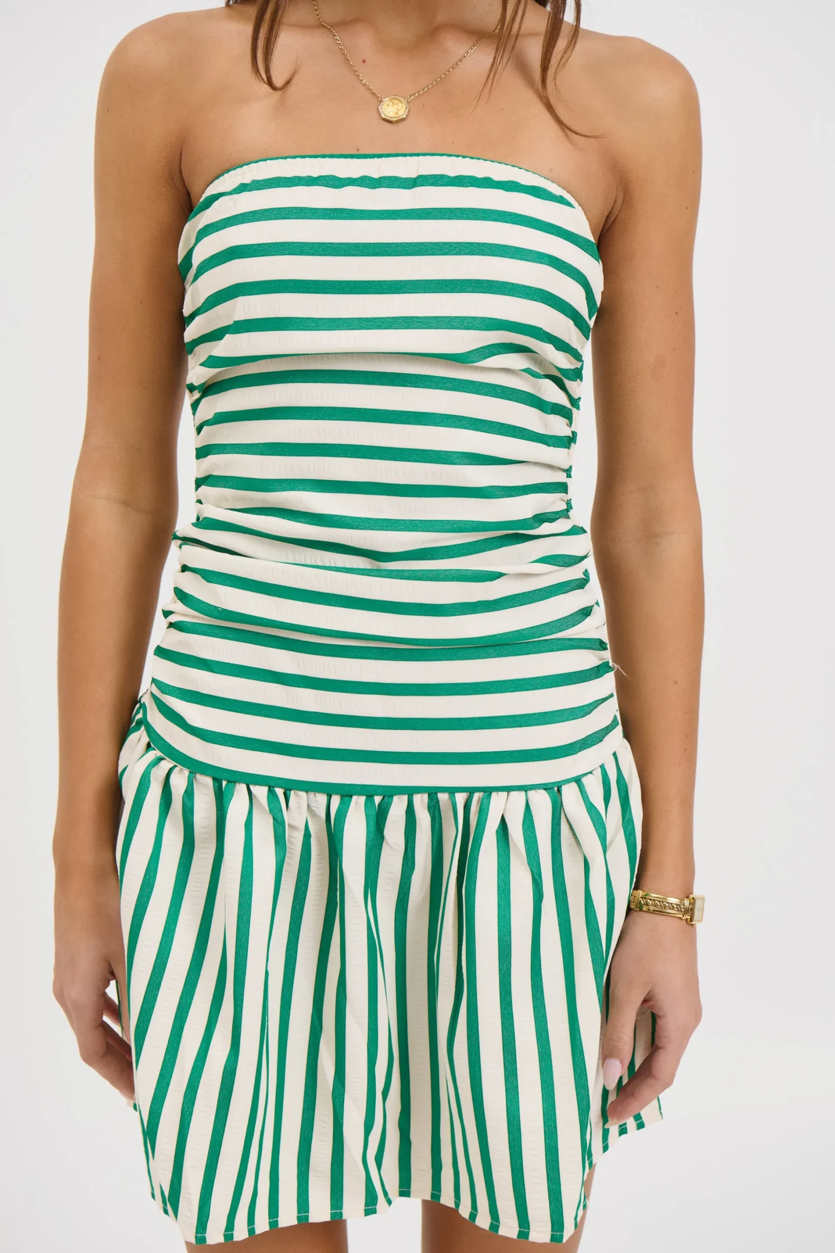 Meet the Zarella Mini Dress, Featuring a strapless design, this dress exudes effortless elegance with its pleated wrap style. The skirt flows gracefully from the hips into an A-line hem, creating a flattering silhouette that moves beautifully with every step.