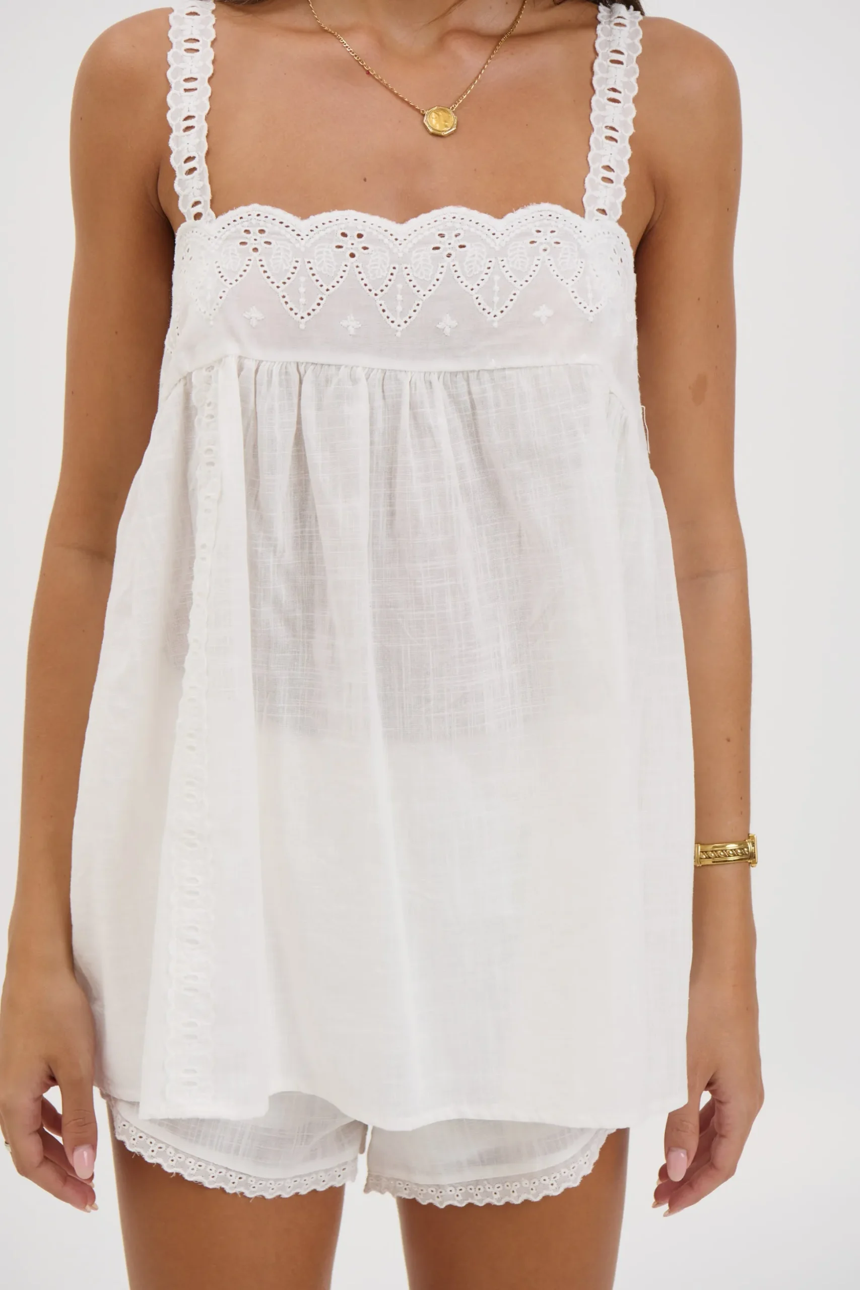 Meet the Alora Lace Set, The flowy top features thin adjustable straps and intricate lace detailing, creating a soft and romantic silhouette. Paired with matching shorts, the look is finished with a lace-trimmed hemline and an elasticated waistband for a comfortable, flattering fit.