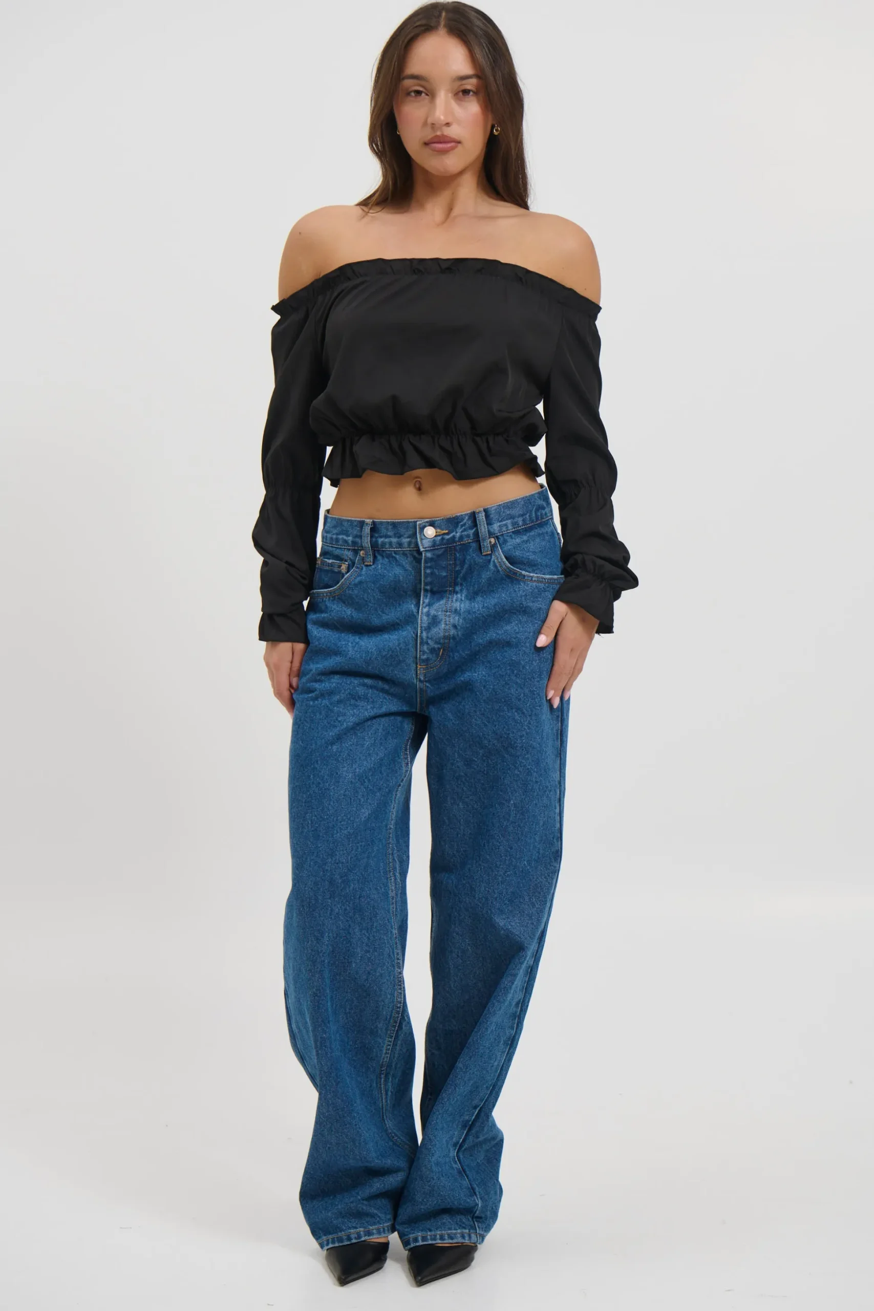 Meet the Antonia Off The Shoulder Top, A romantic top featuring a cropped silhouette with a ruched puff body and sleeves for a voluminous, feminine touch. Designed with long sleeves and playful frill hems, this off the shoulder style exudes effortless charm, perfect for pairing with high waisted skirts or jeans for day to night wear.