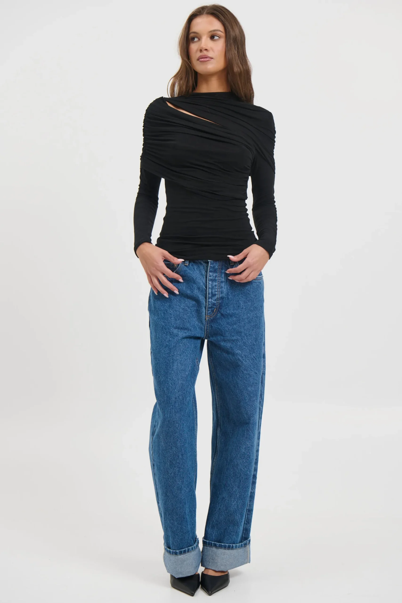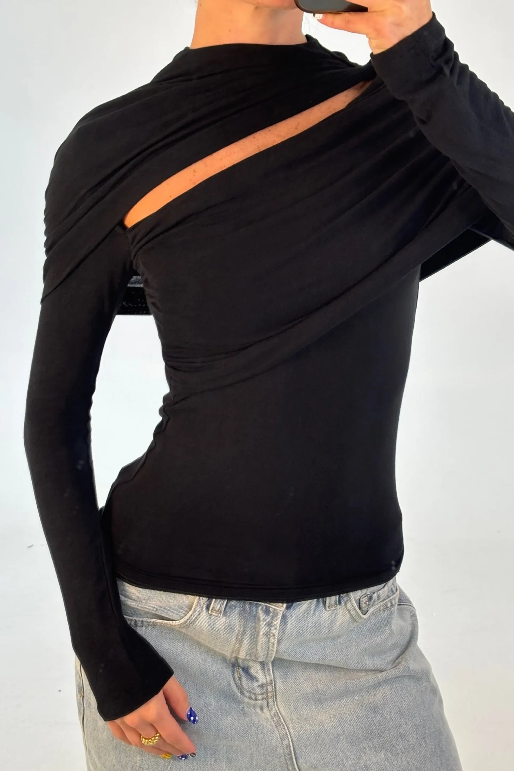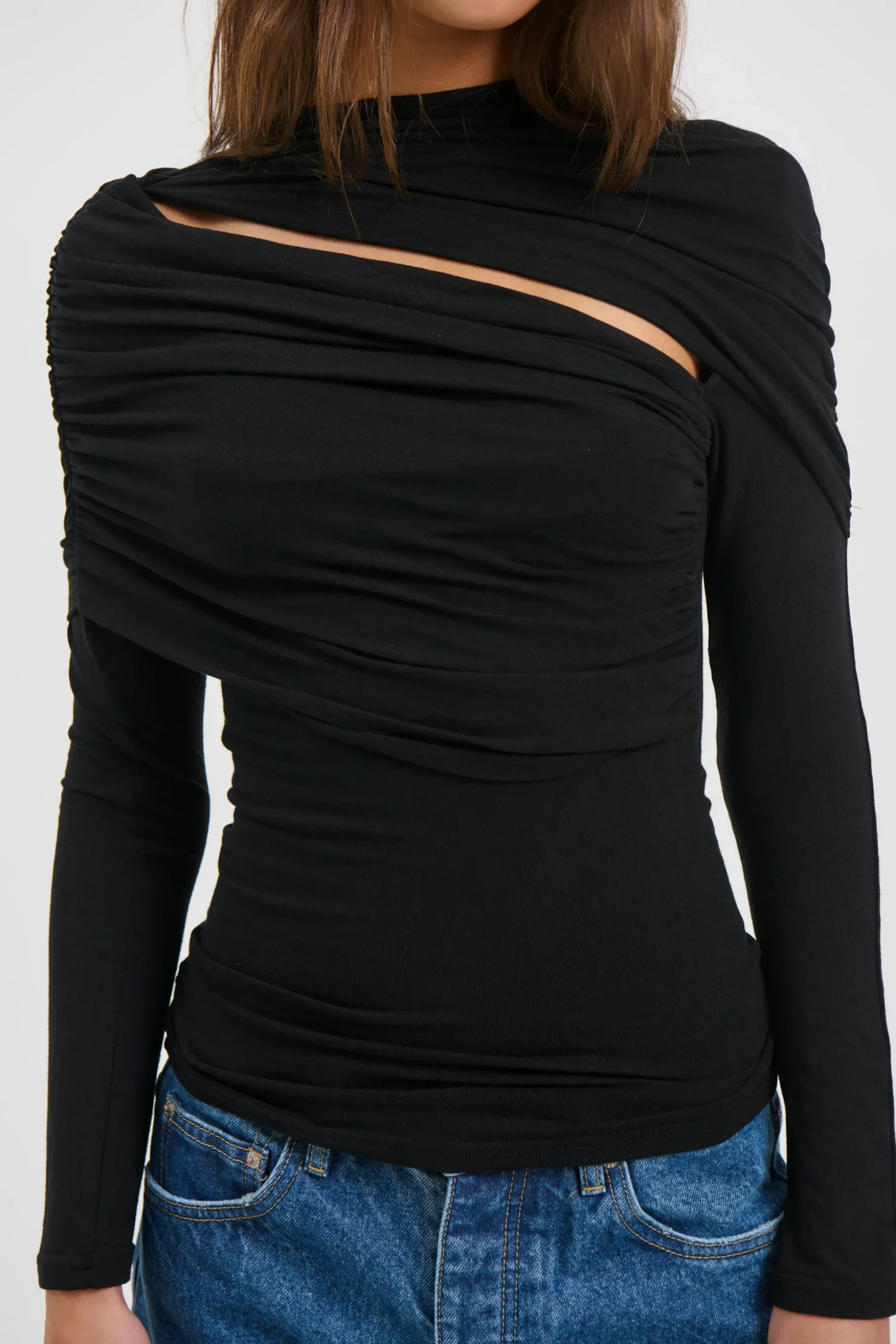 The Bambi Top showcases a sculptural draped overlay combined with a streamlined, body-hugging shape. Made from a gentle stretch fabric, it offers a high neckline, long sleeves, and an asymmetrical cut-out detail, delivering a modern and striking look.