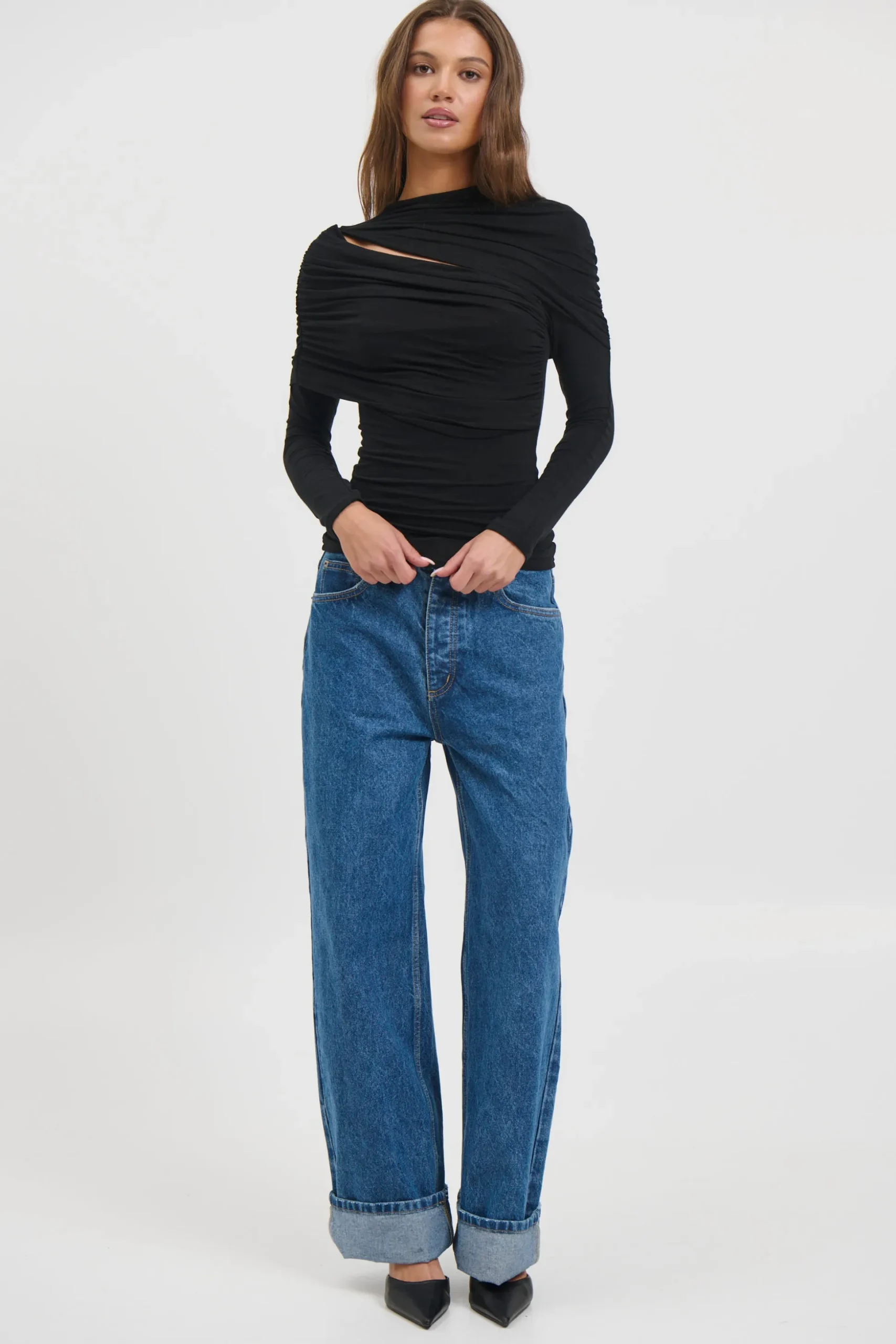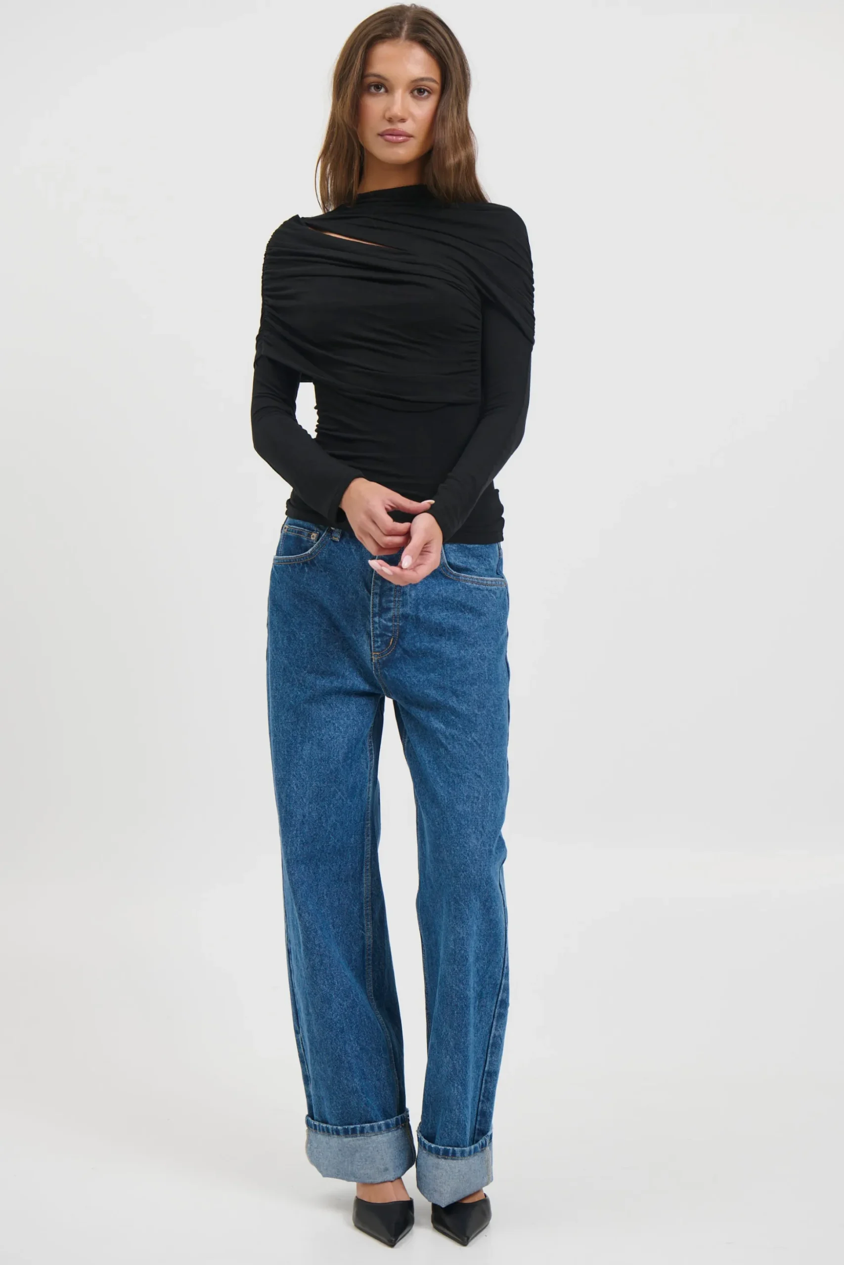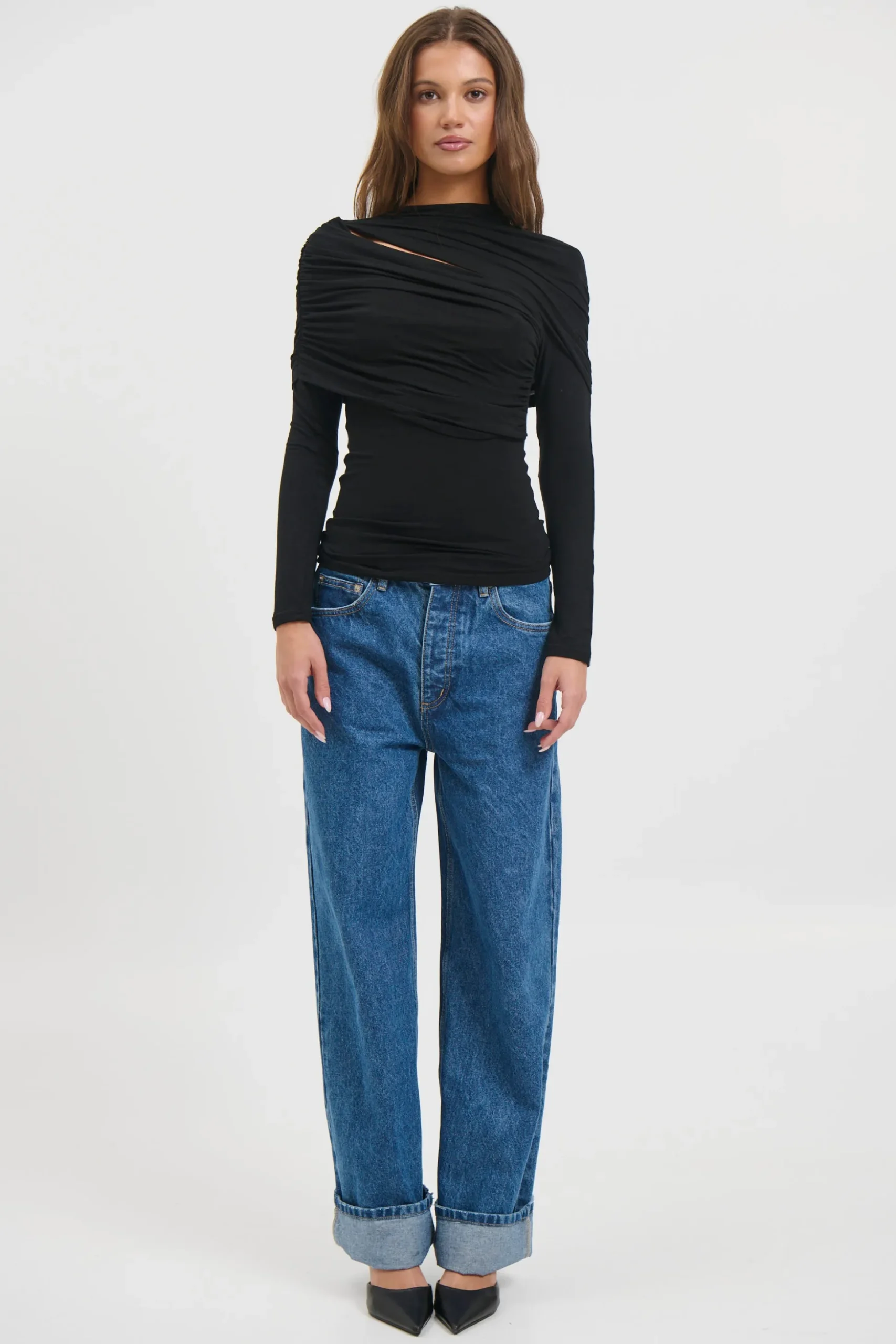 The Bambi Top showcases a sculptural draped overlay combined with a streamlined, body-hugging shape. Made from a gentle stretch fabric, it offers a high neckline, long sleeves, and an asymmetrical cut-out detail, delivering a modern and striking look.