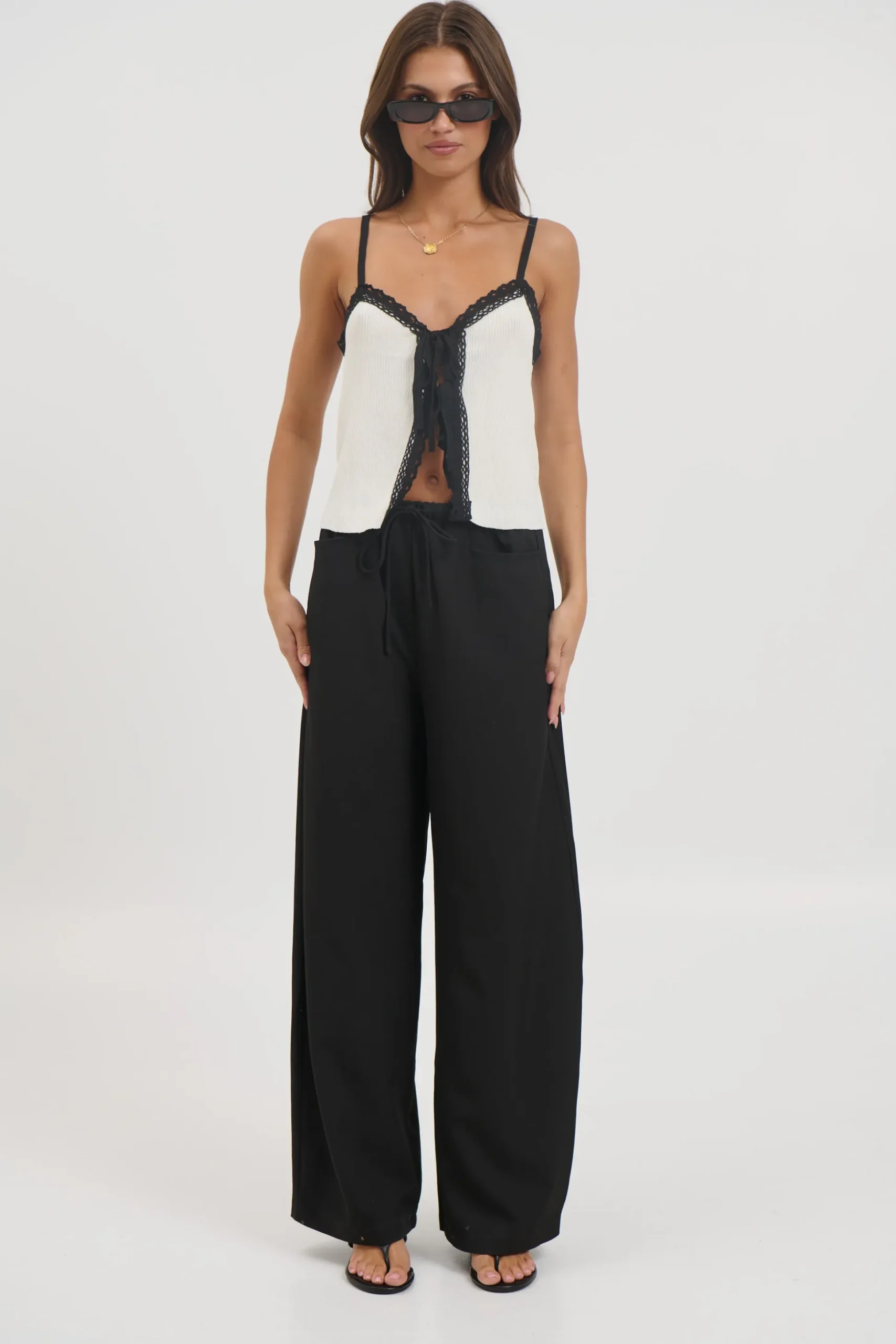 Meet the Byron Lace Cami, crafted from soft ribbed material for a flattering, comfortable fit. Featuring a chic front tie-up closure, delicate thin straps, and intricate lace detailing along the hems, this top effortlessly blends playful charm with subtle elegance.