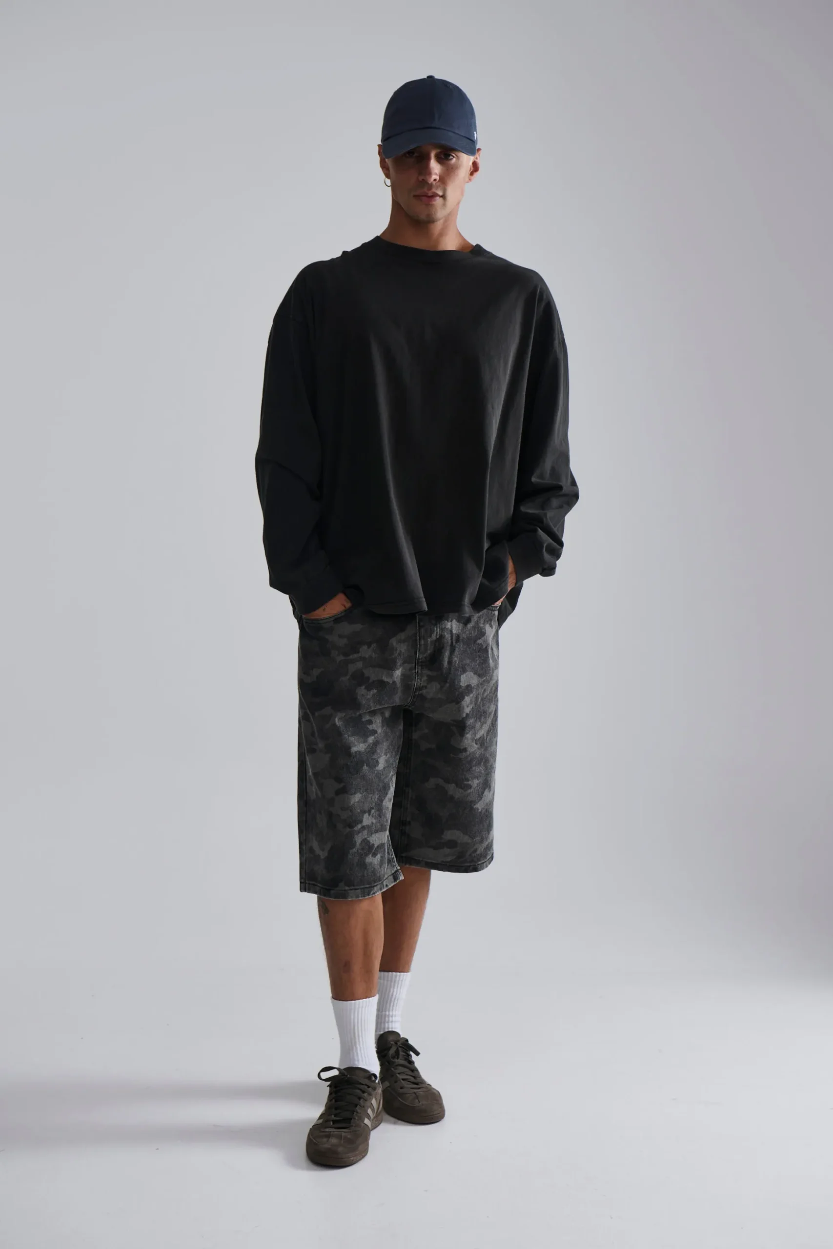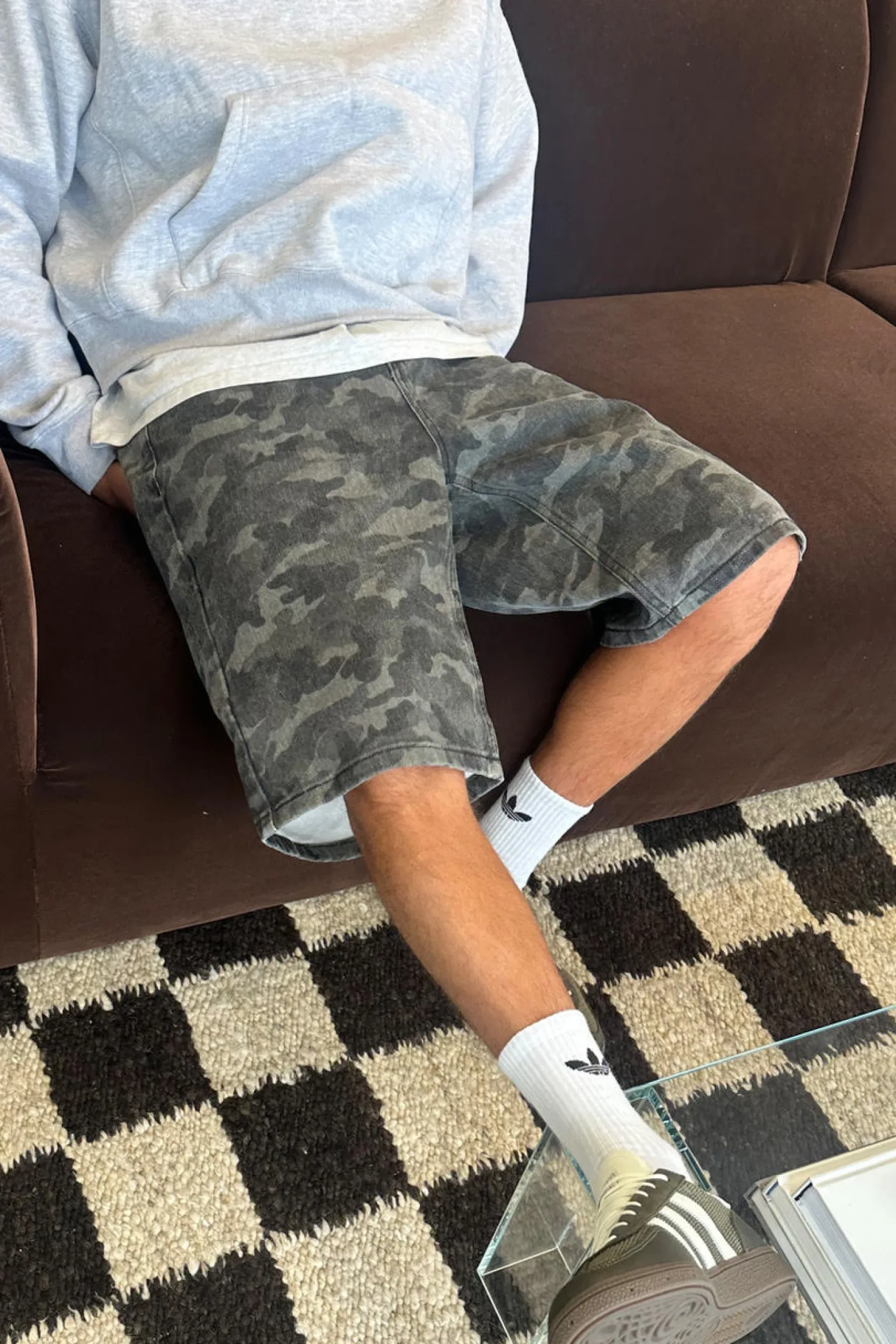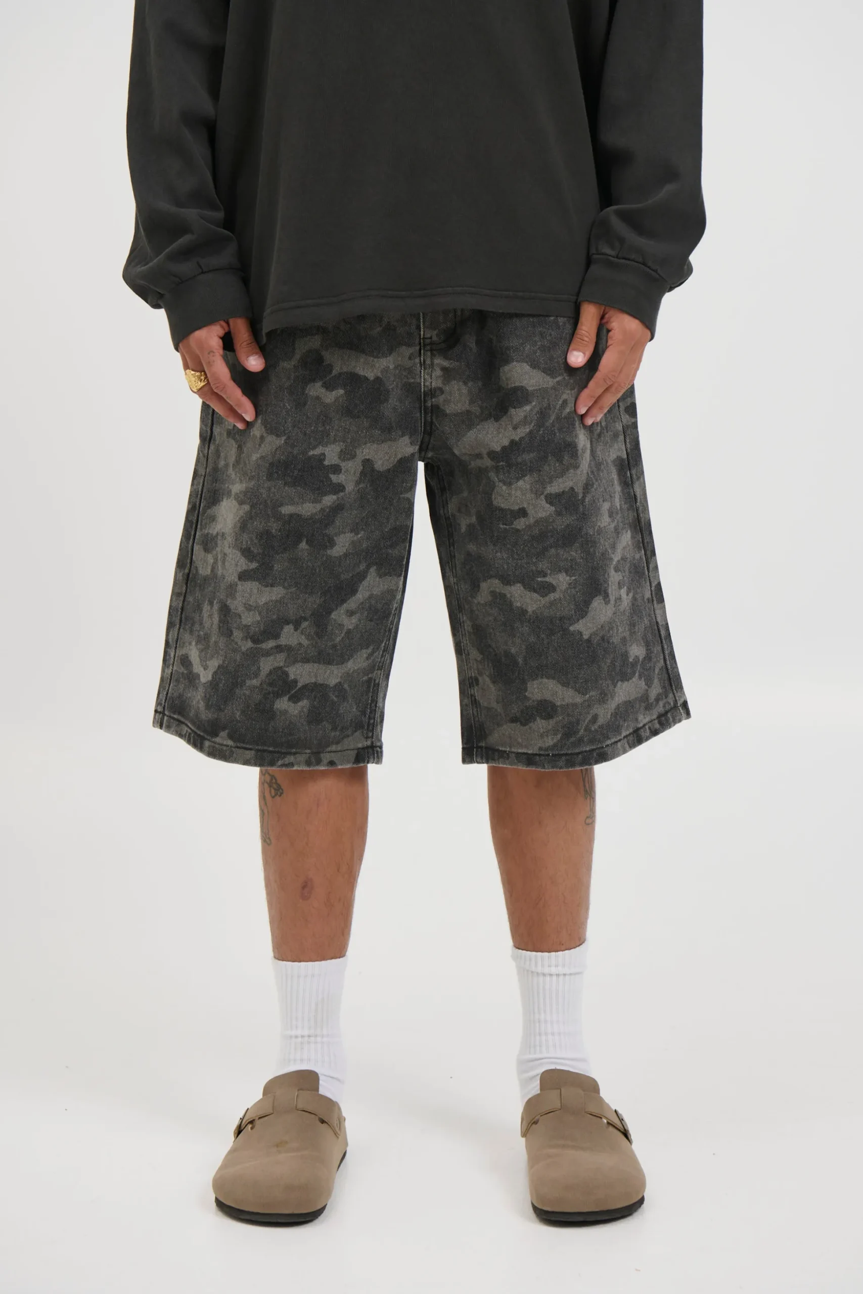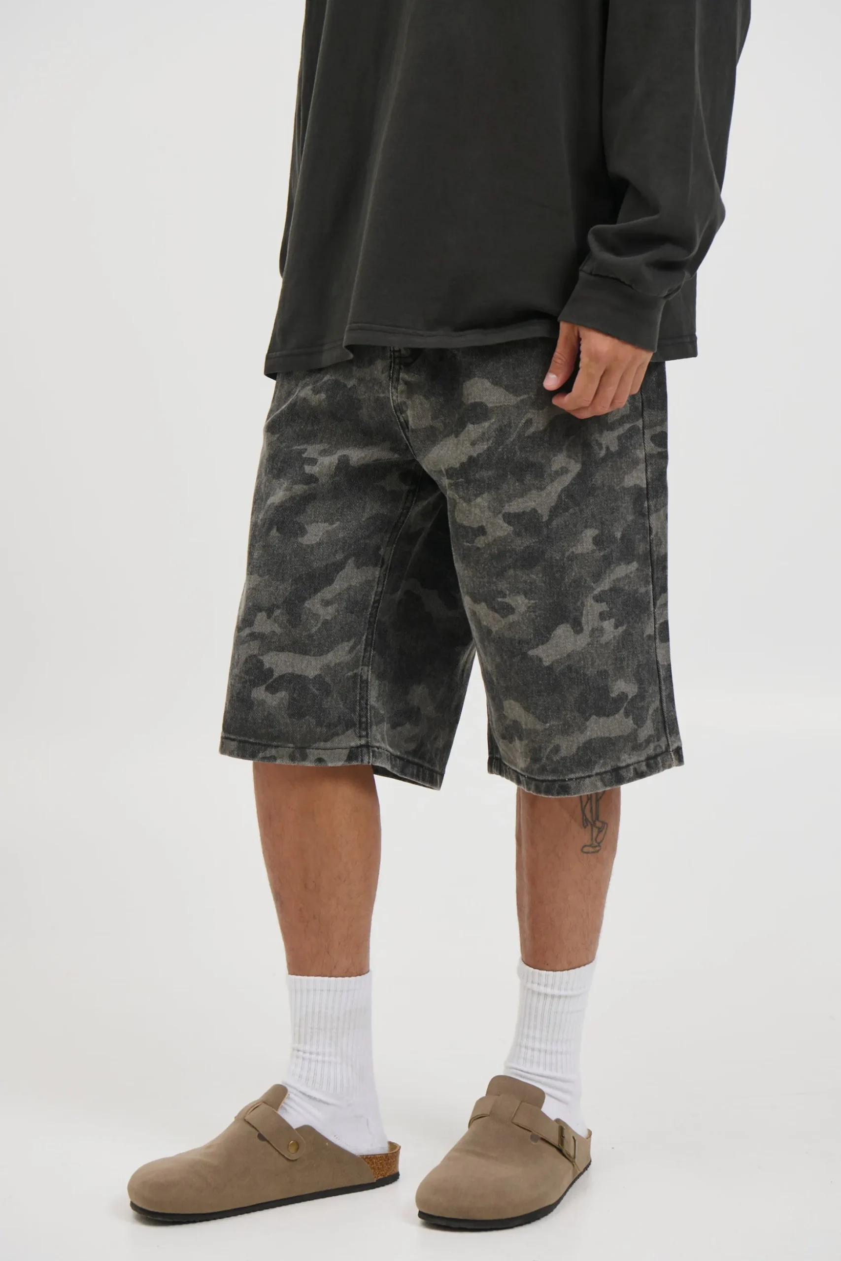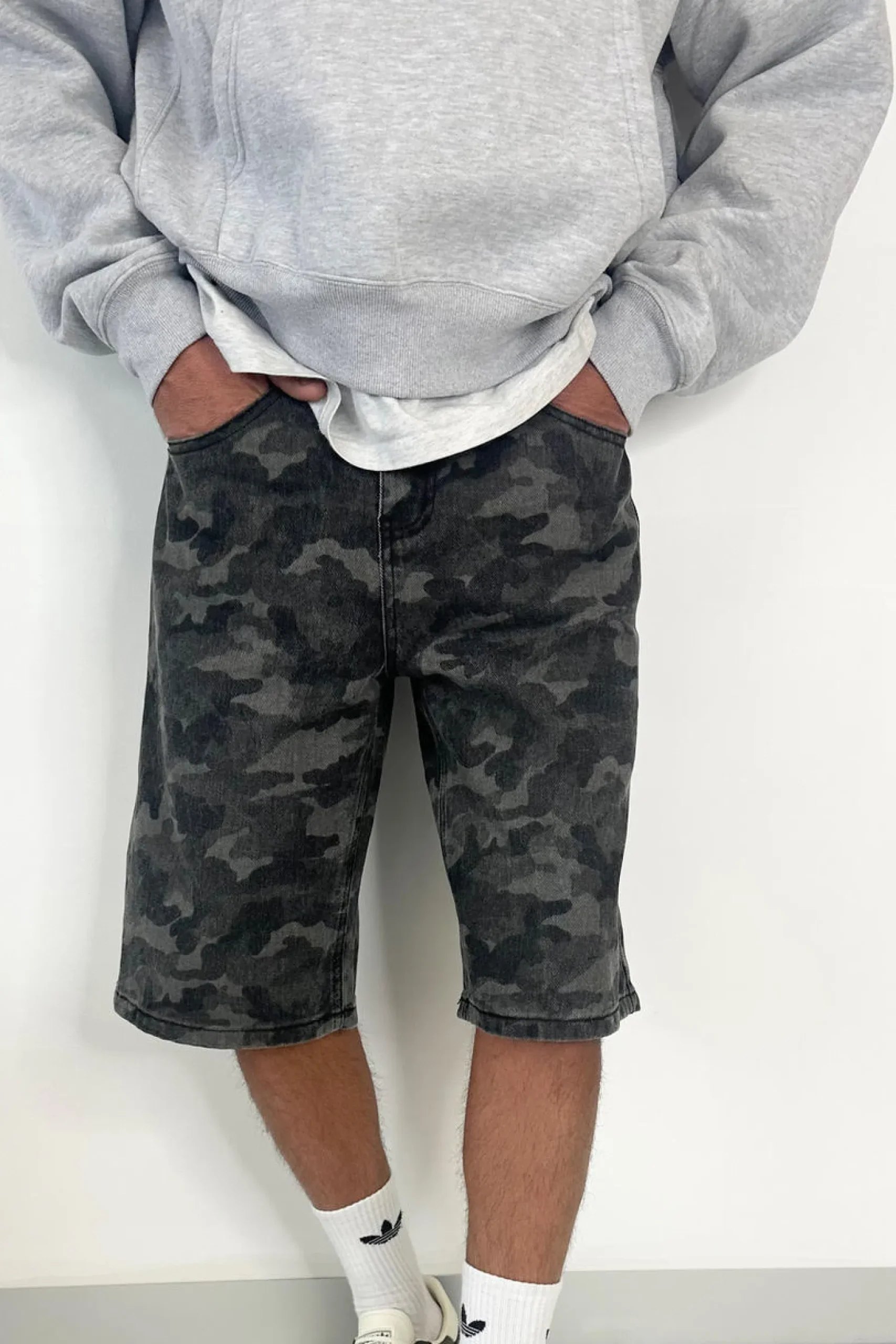 Meet the Camo Baggy Short, Featuring a washed camo print, these men’s shorts are designed with a relaxed fit and knee-length cut for everyday comfort. Crafted from durable denim, they include side and back pockets for functionality, finished with a casual raw-style hem. Perfect for laid-back streetwear styling.