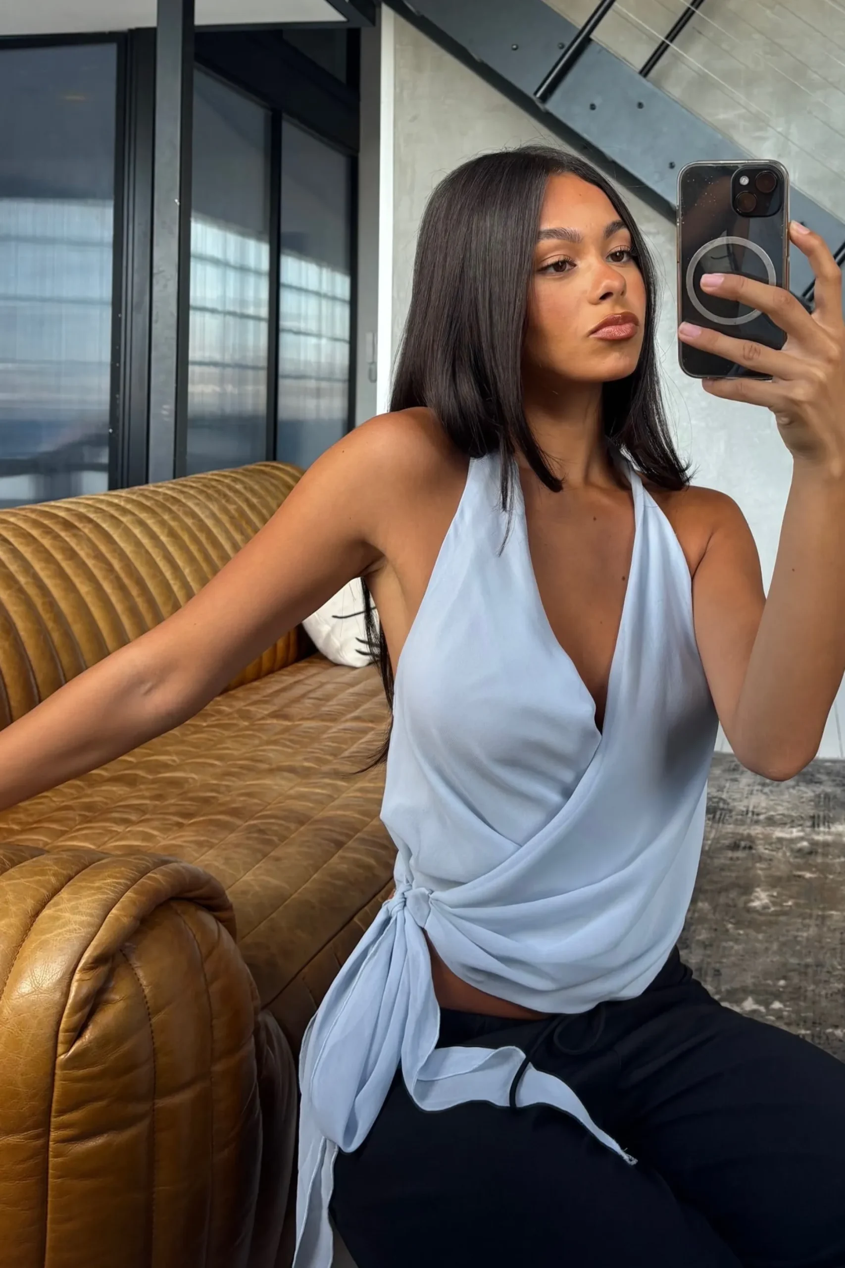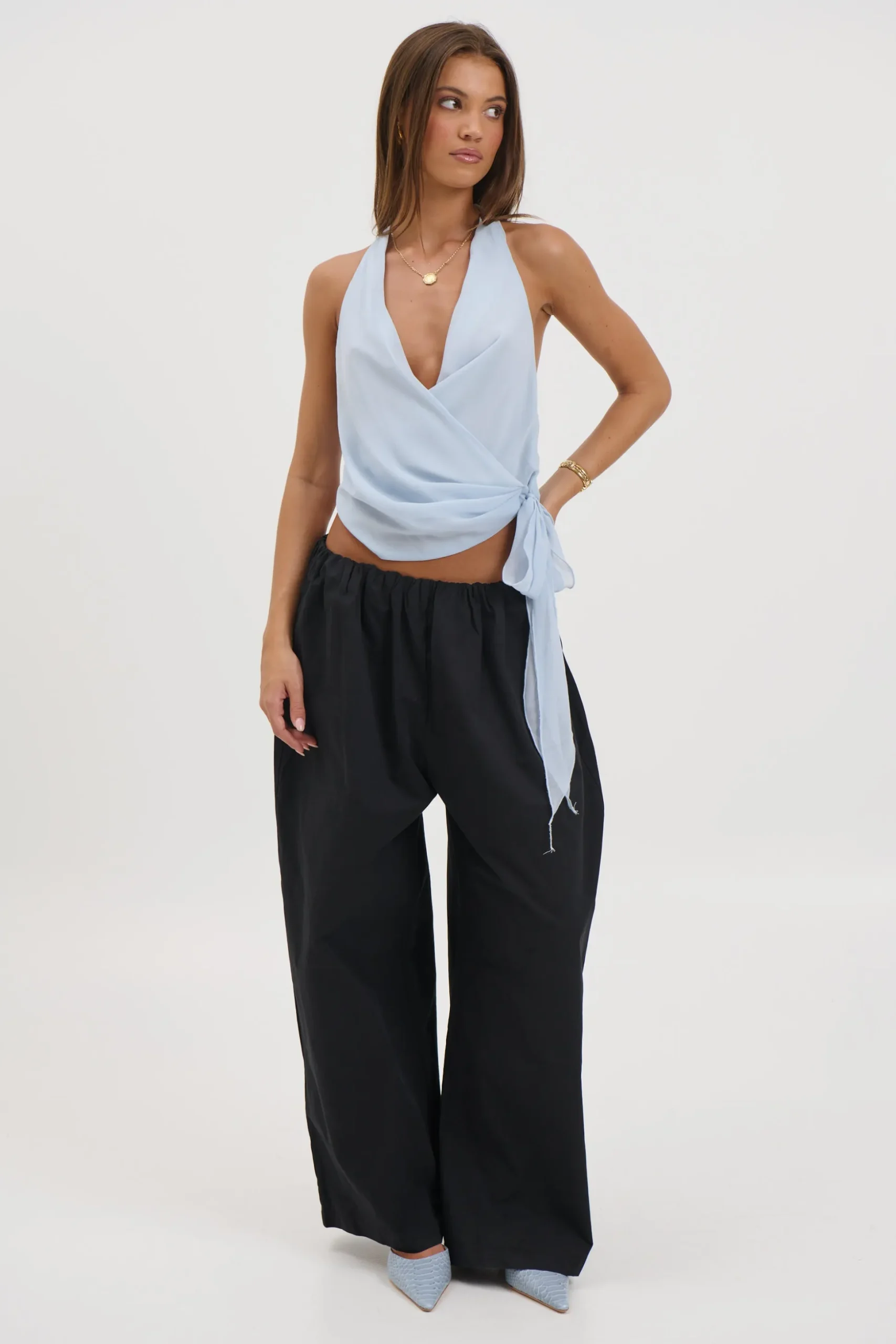Meet the Cherri Top, Featuring a flattering halter neckline and a deep V-neck, the wrap-around style creates a sculpted silhouette that enhances the waist. The cropped length adds a contemporary finish, making it perfect for pairing with high-waisted jeans, skirts, or tailored pants.