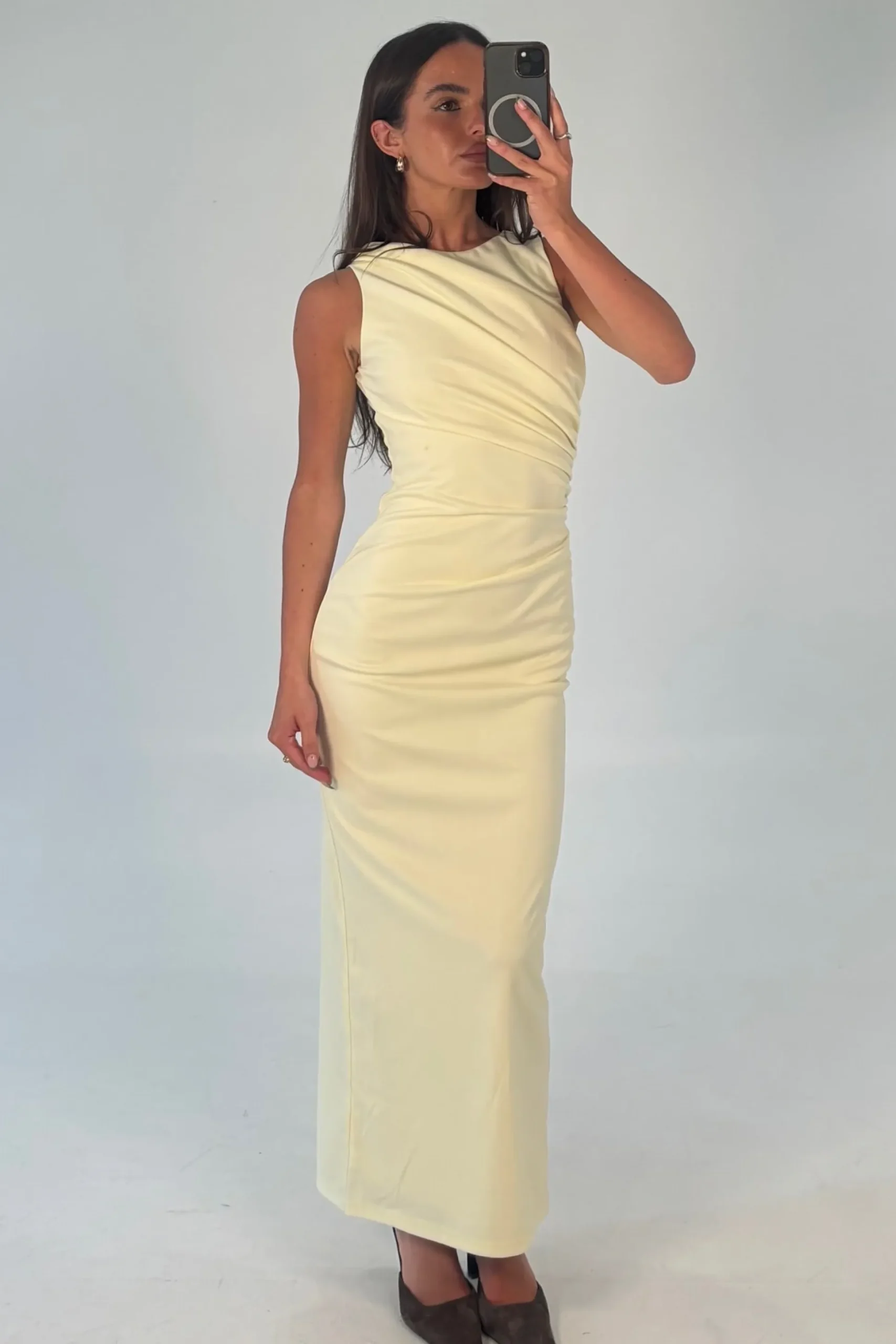 Meet the Daphne Midi Dress, designed with an elegant high neckline that exudes sophistication. The sleeveless silhouette keeps it modern and versatile, while delicate ruching detailing across the dress adds texture and a flattering finish. The fitted, straight cut skims the body for a sleek, elongated look, making it perfect for formal occasions or evening events.