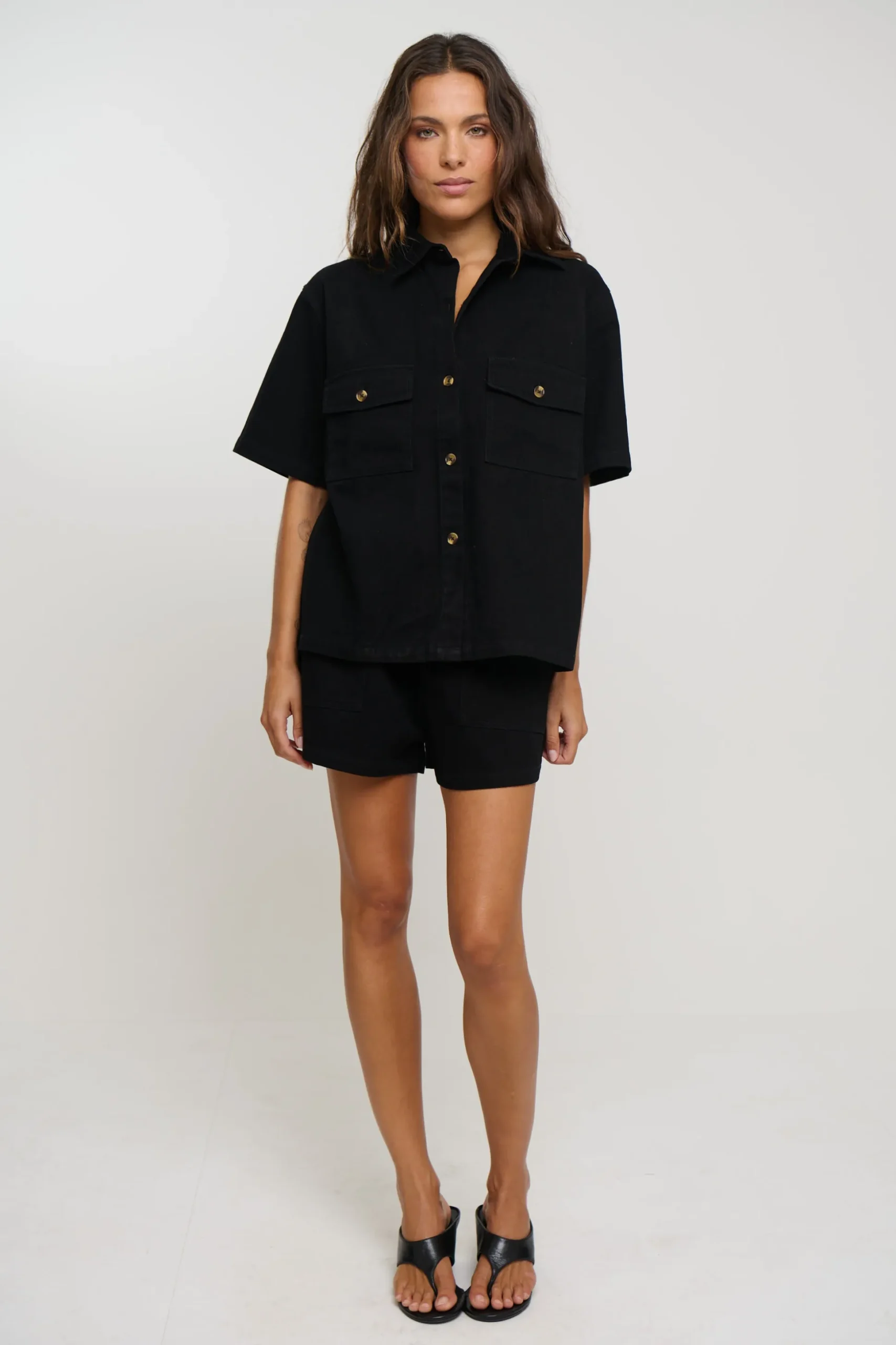 Meet the Delaney Set. Featuring a relaxed-fit collared button-down top with chest pockets and short sleeves for a laid-back vibe. Paired with matching shorts, designed with side pockets, an elasticated waistband for comfort, and a decorative waist tie for a touch of style. Perfect for easygoing, warm-weather days.