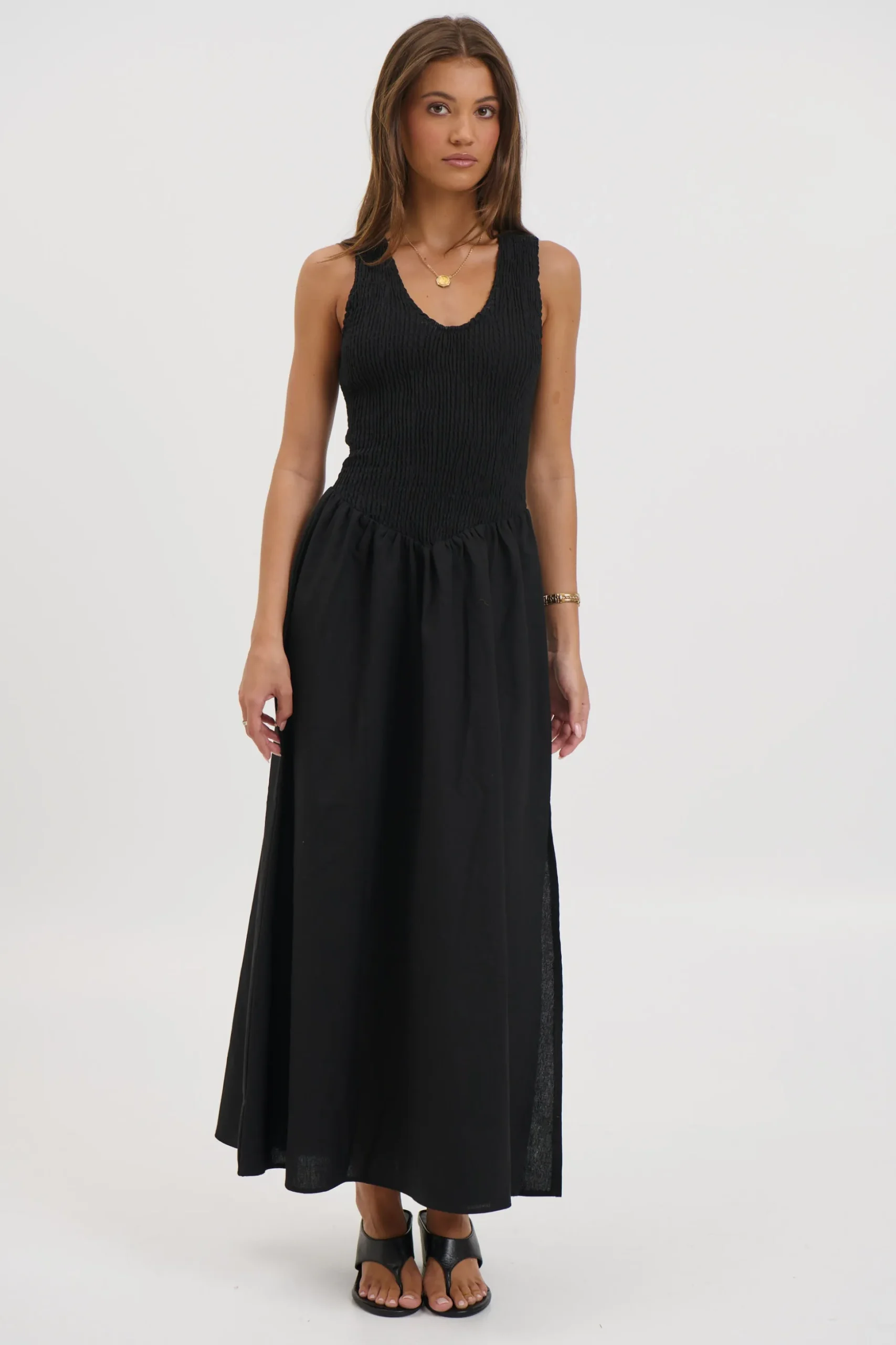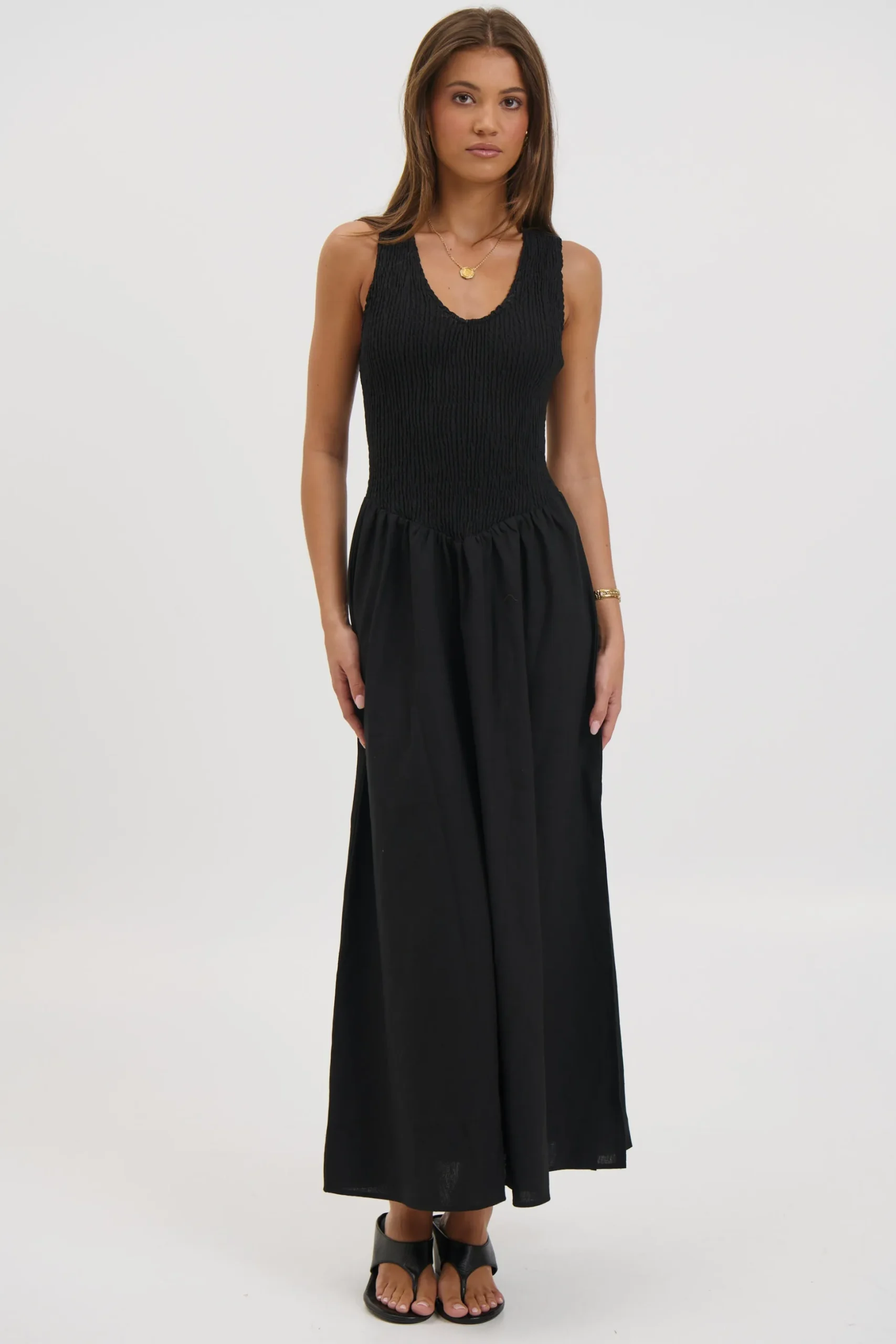 Meet the Destiny Maxi Dress, Featuring a sleeveless bodice features a shirred racer-back design that offers a comfortable, flexible fit while creating a softly structured shape through the top. Flowing seamlessly into a full-length, airy skirt, the dress drapes beautifully with every step, delivering an easy elegance that moves from day to night with ease