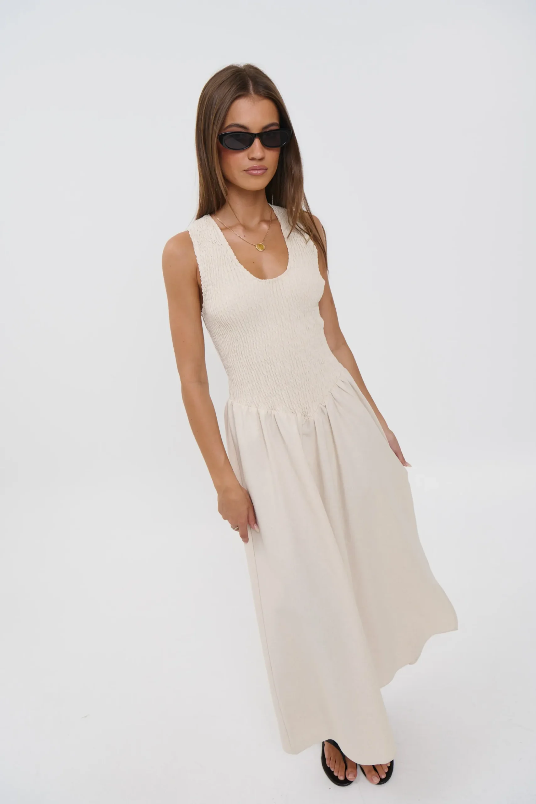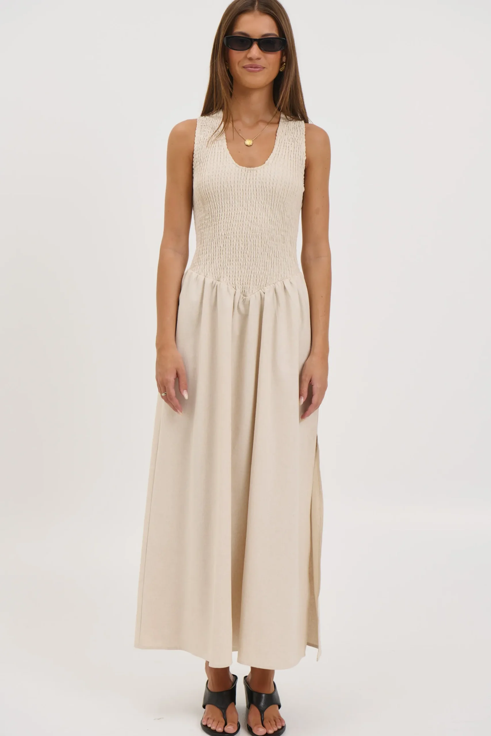 Meet the Destiny Maxi Dress, Featuring a sleeveless bodice features a shirred racer-back design that offers a comfortable, flexible fit while creating a softly structured shape through the top. Flowing seamlessly into a full-length, airy skirt, the dress drapes beautifully with every step, delivering an easy elegance that moves from day to night with ease