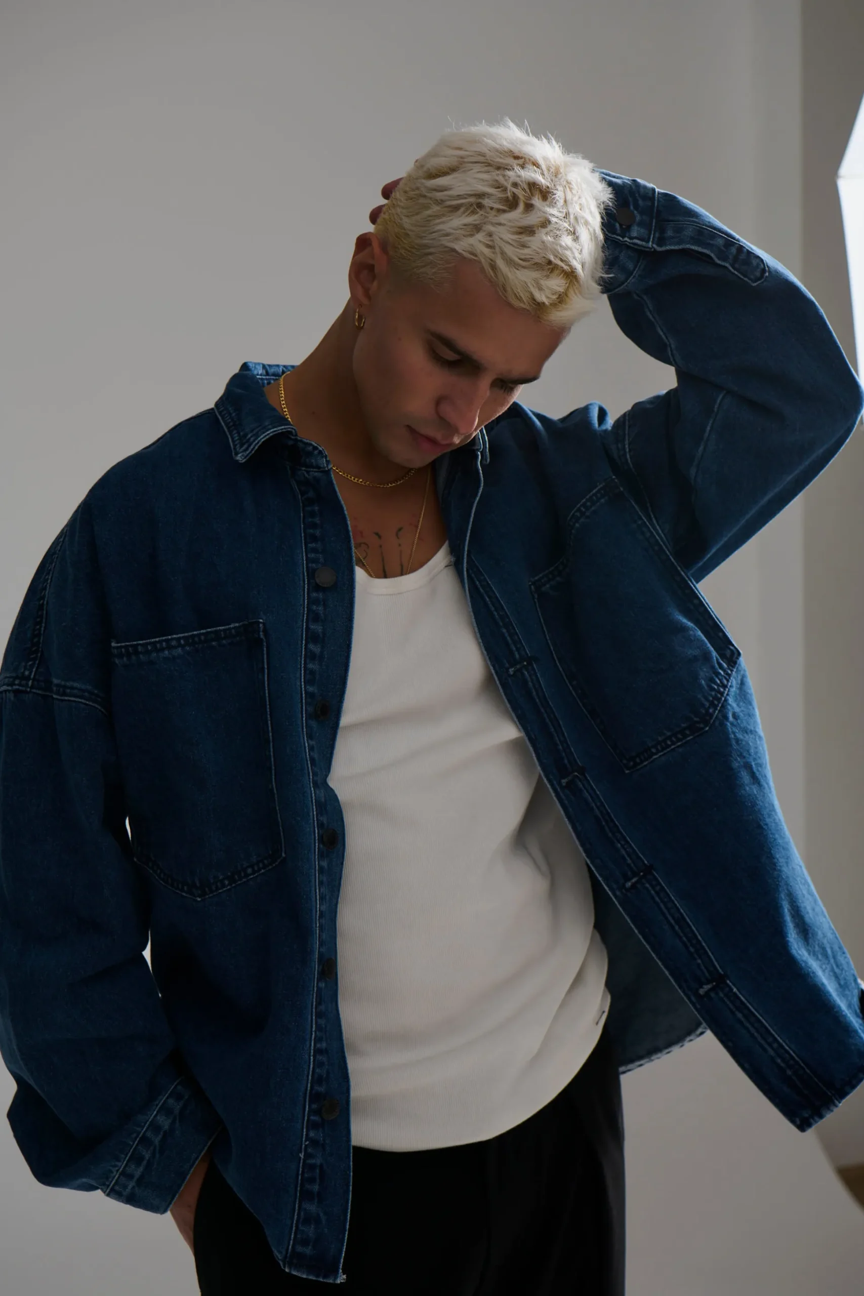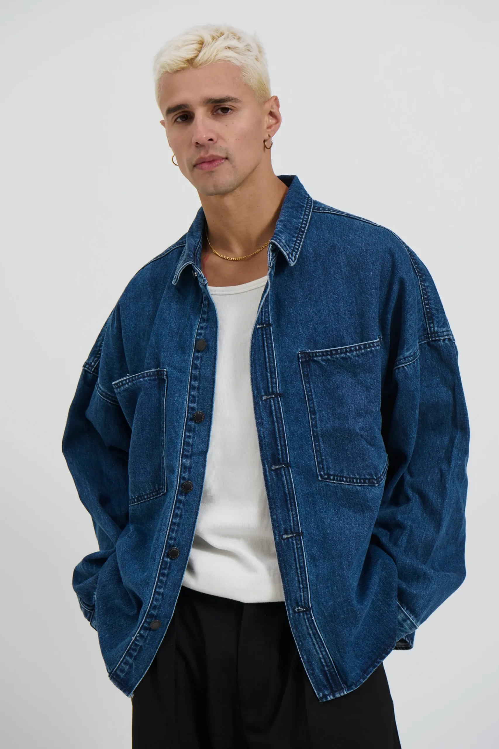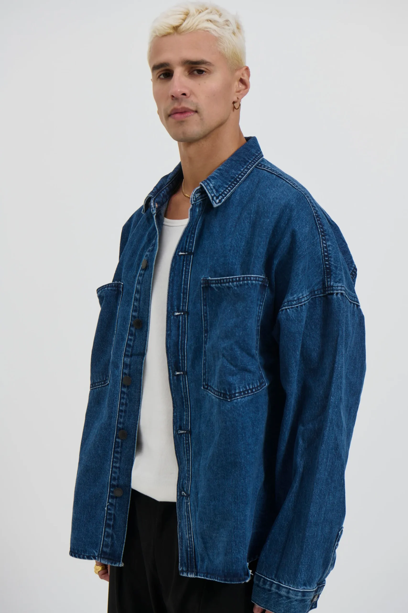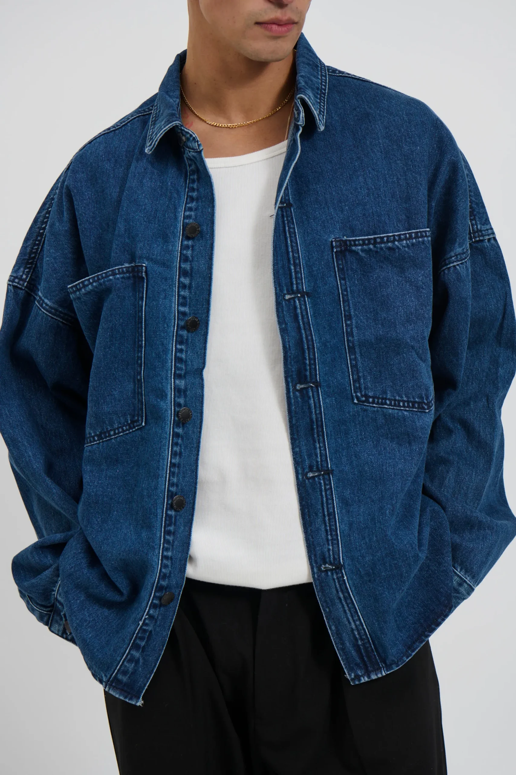 The Drop Shoulder Denim Shirt features a heavyweight design with drop shoulders and a stud press closure on the front. The double pockets at the front add functionality and a boxy fit for a stylish look.