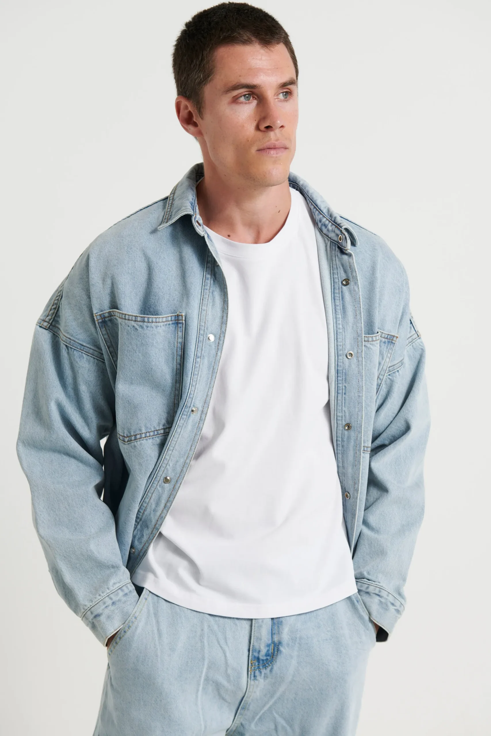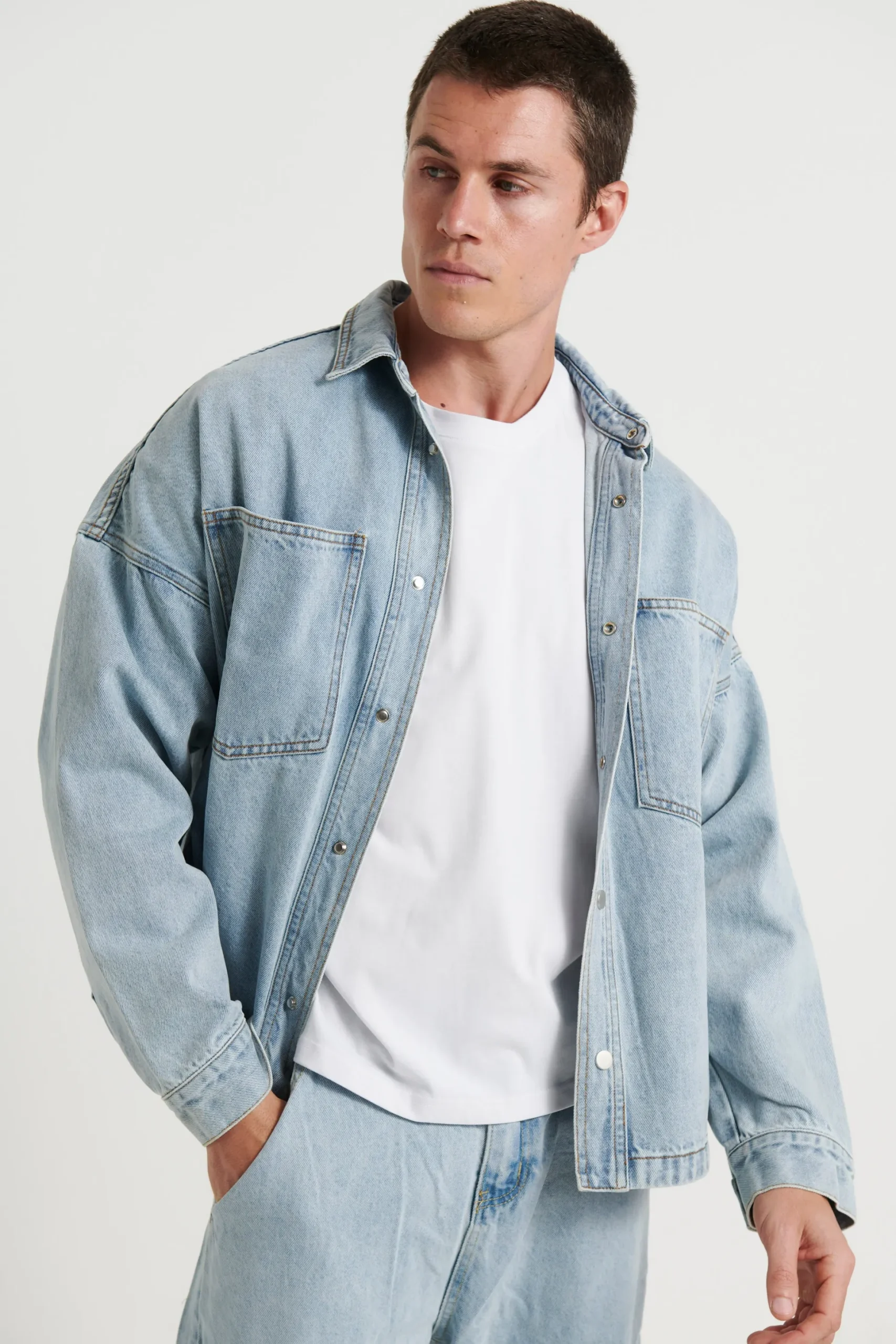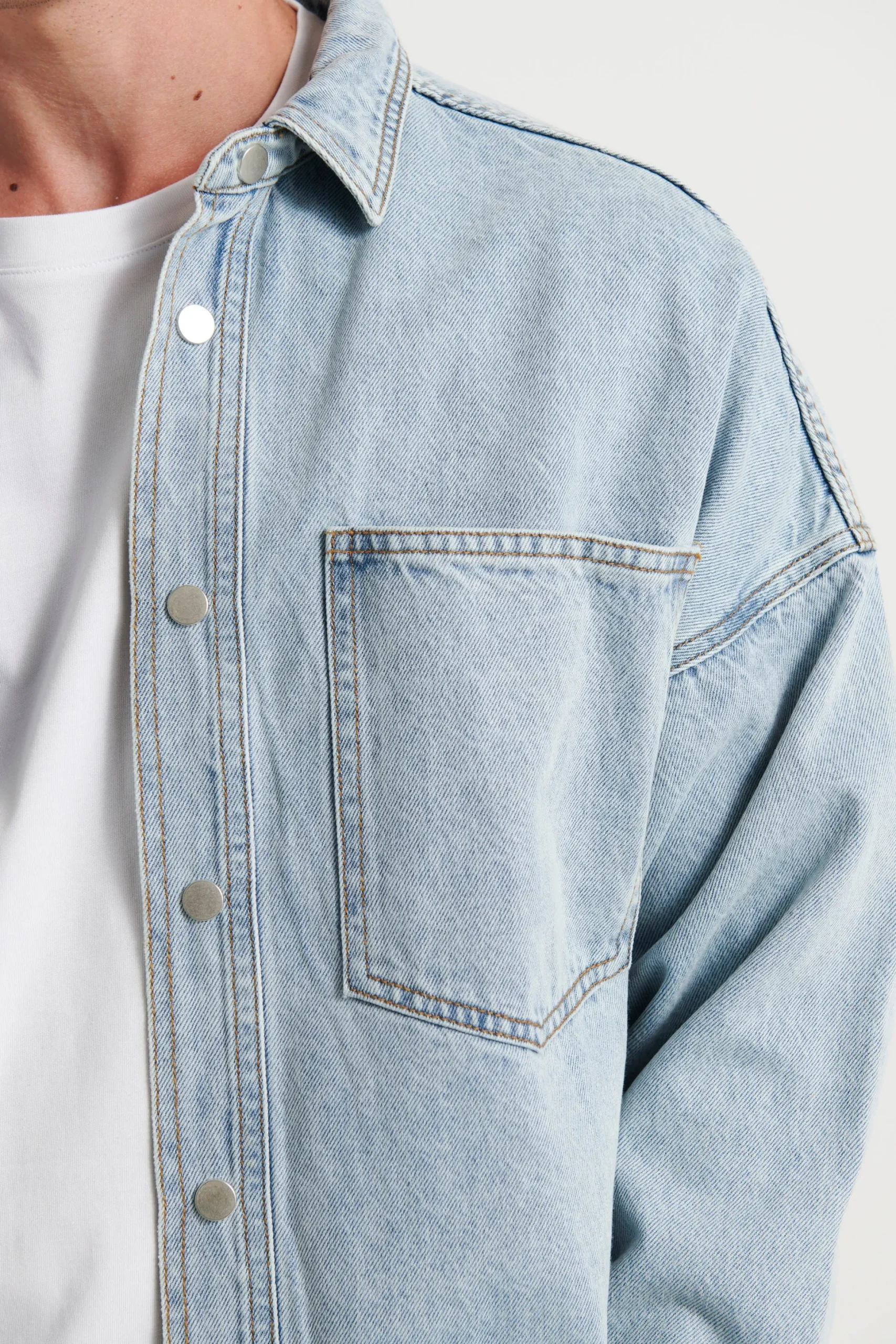 The Drop Shoulder Denim Shirt features a heavyweight design with drop shoulders and a stud press closure on the front. The double pockets at the front add functionality and a boxy fit for a stylish look.