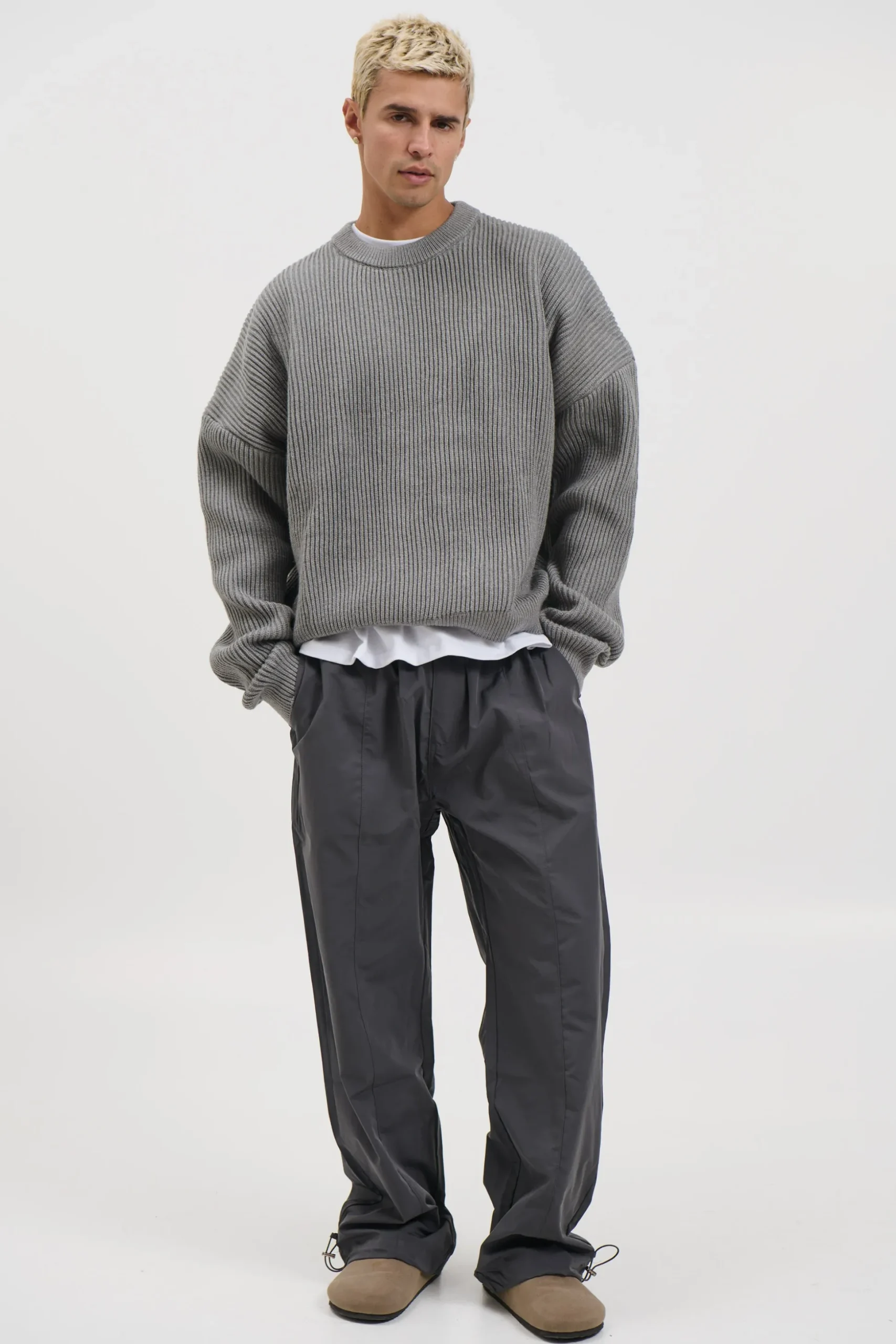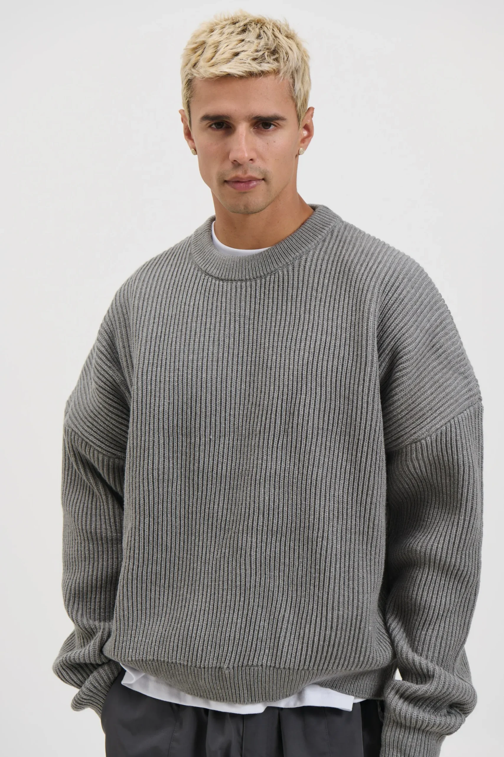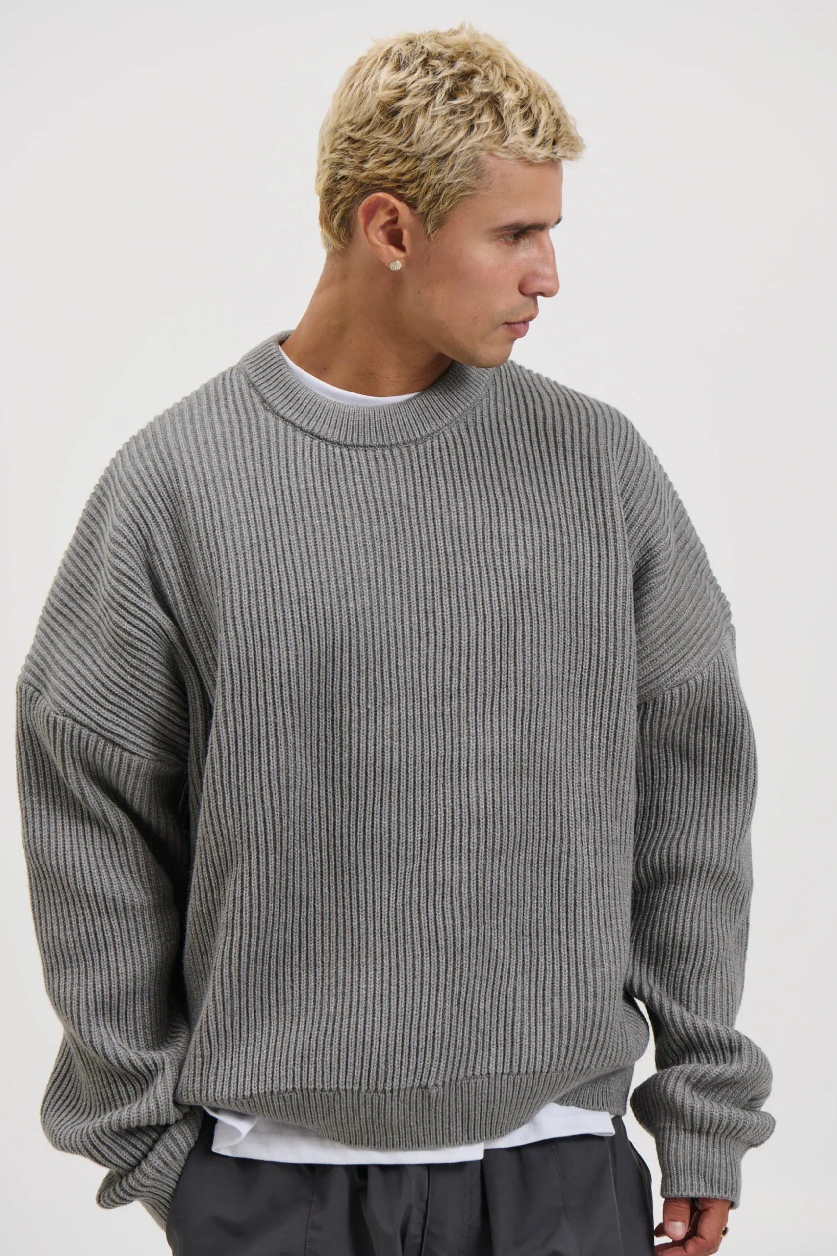 The Drop Sleeve Heavy Knit, Featuring a relaxed slouch fit and effortless drop shoulder silhouette, this knit delivers laid back comfort with a modern edge. Finished with ribbed cuffs and a classic crew neckline.