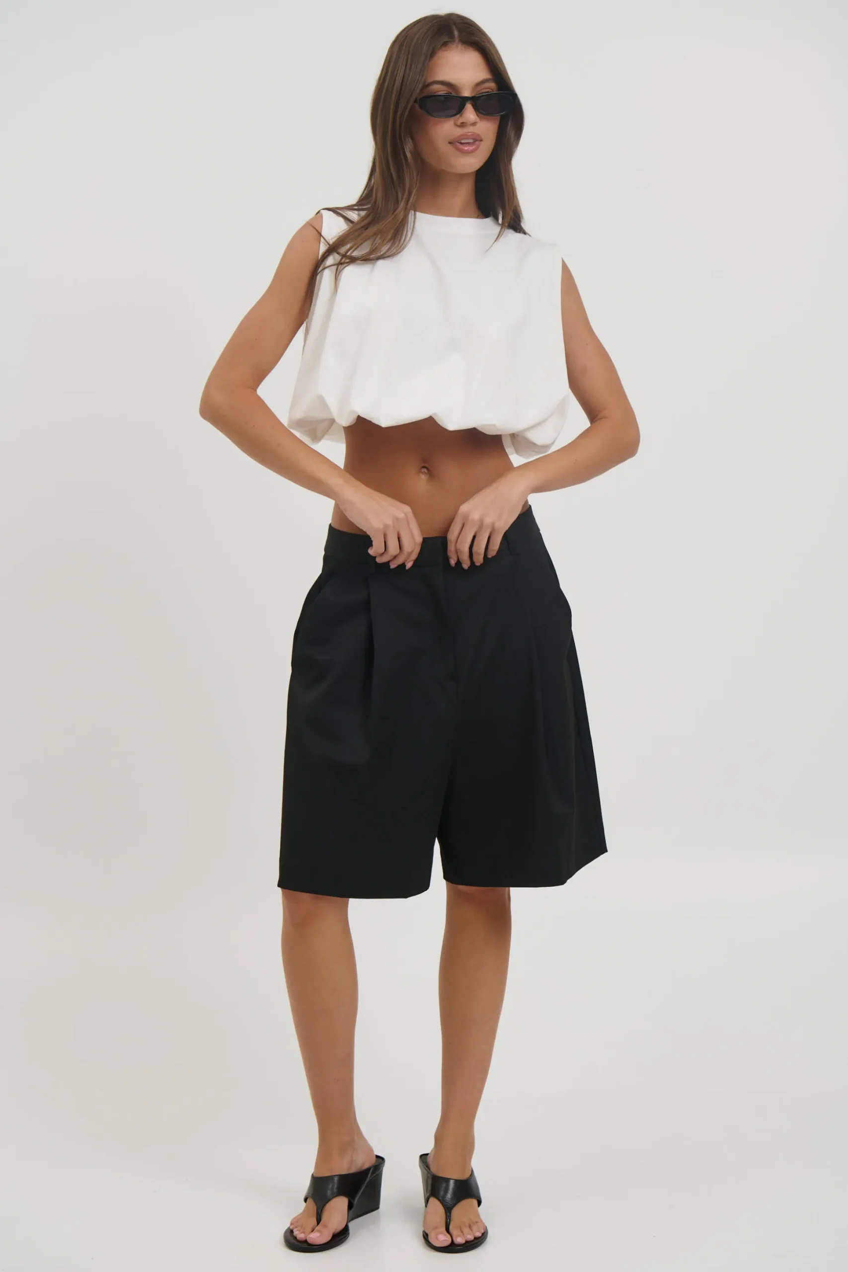 Meet the Emily Bubble Hem Top, featuring a relaxed, boxy silhouette with a gathered elastic hemline for a voluminous shape. Designed with a high crew neckline and wide sleeveless cut for a clean, structured look.