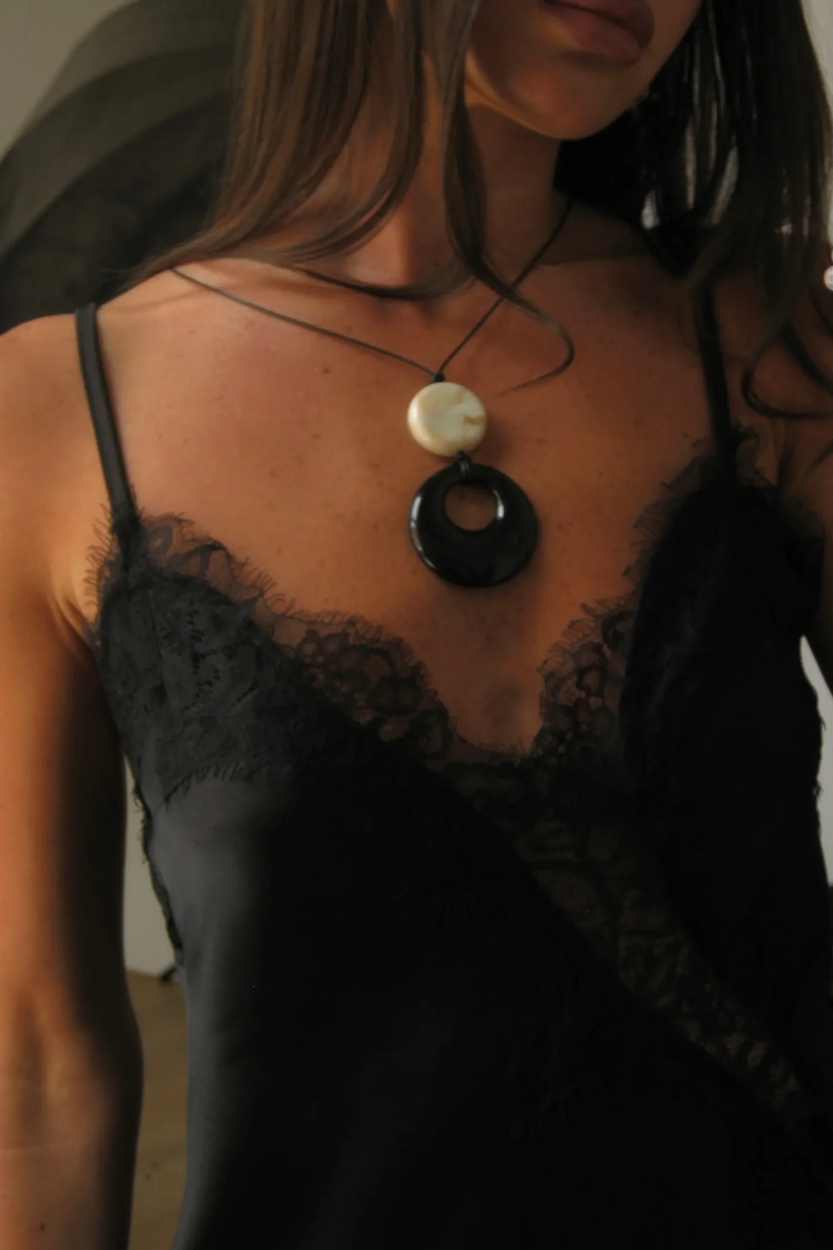 The Etta Necklace, features a striking two-tone design. A smooth, marbled cream disc sits above a bold, high-shine black circular pendant, both suspended from a sleek adjustable cord.