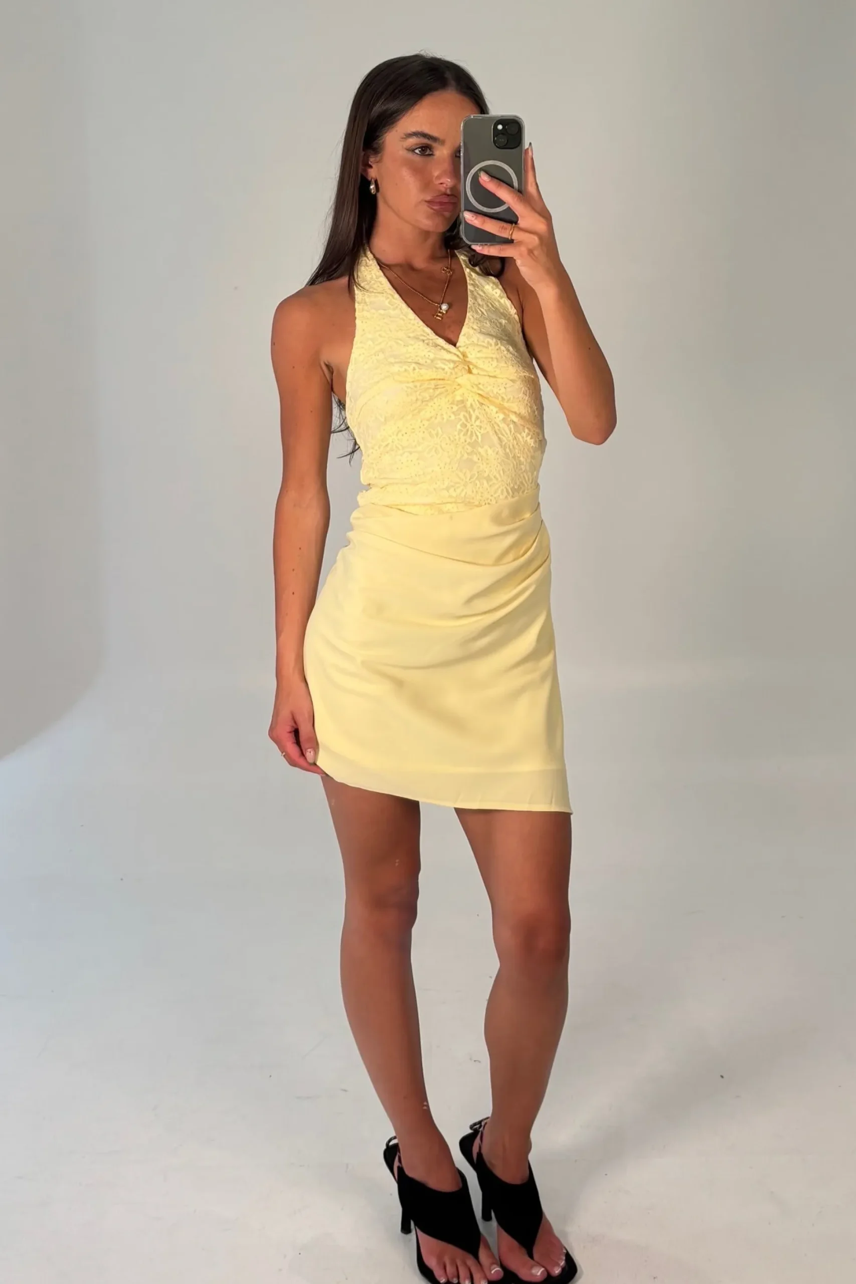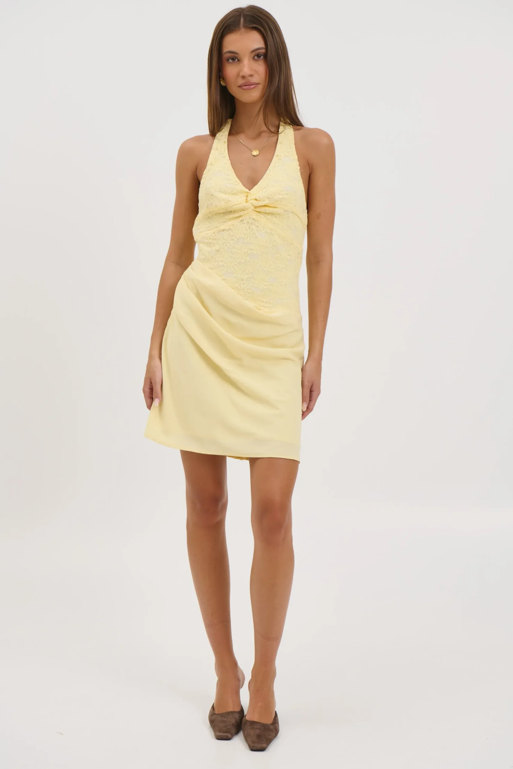 Meet the Eva Mini Dress, features a flattering halter neckline with a deep V-cut front and adjustable tie at the neck. The twisted bust detail creates soft shaping, while delicate lace adds texture and allure. Finished with a ruched wrap skirt overlay, the silhouette drapes effortlessly over the body for a fluid, feminine look that moves with you.
