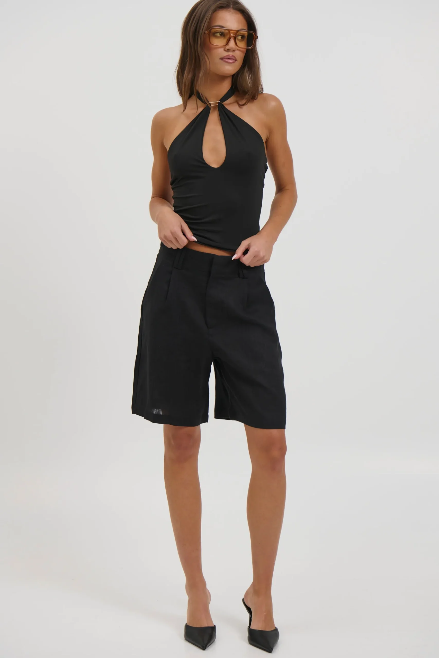 Meet the Janelle Top, Featuring a halter neck tie design, this top is elevated with a gold detail that creates a chic keyhole cut-out at the front. Crafted from a tight, stretchy material, it offers a flattering, body-hugging fit that’s perfect for both casual and dressy styling.
