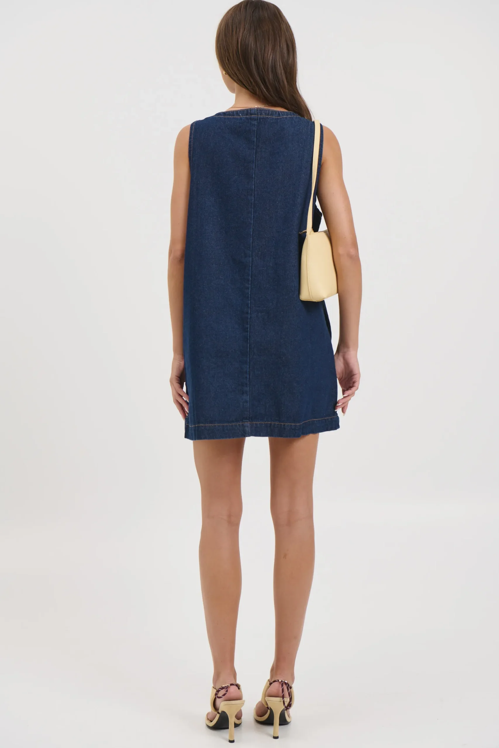 Meet the Jaymes Denim Dress, featuring a high scoop neckline and a sleeveless silhouette. Designed in a mini length, it includes functional side pockets and a full front button closure for a classic, easy-wear look.