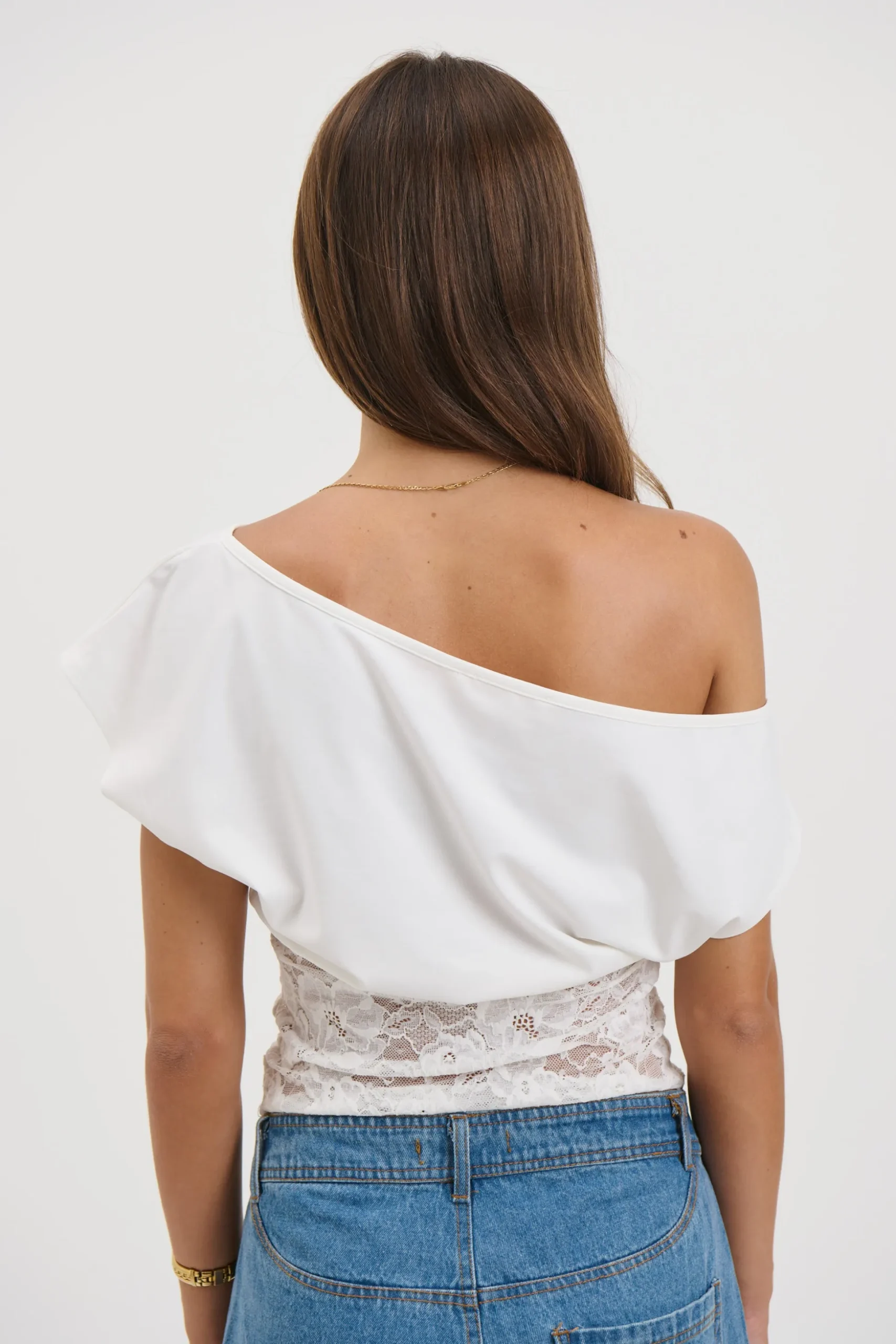 Meet the Kate Lace Top, Featuring a short sleeve silhouette with an off-the-shoulder neckline, this top balances soft structure with effortless femininity. Designed with a fitted sheer lace waist to define the figure, it falls into a relaxed upper body for an easy, flattering drape.