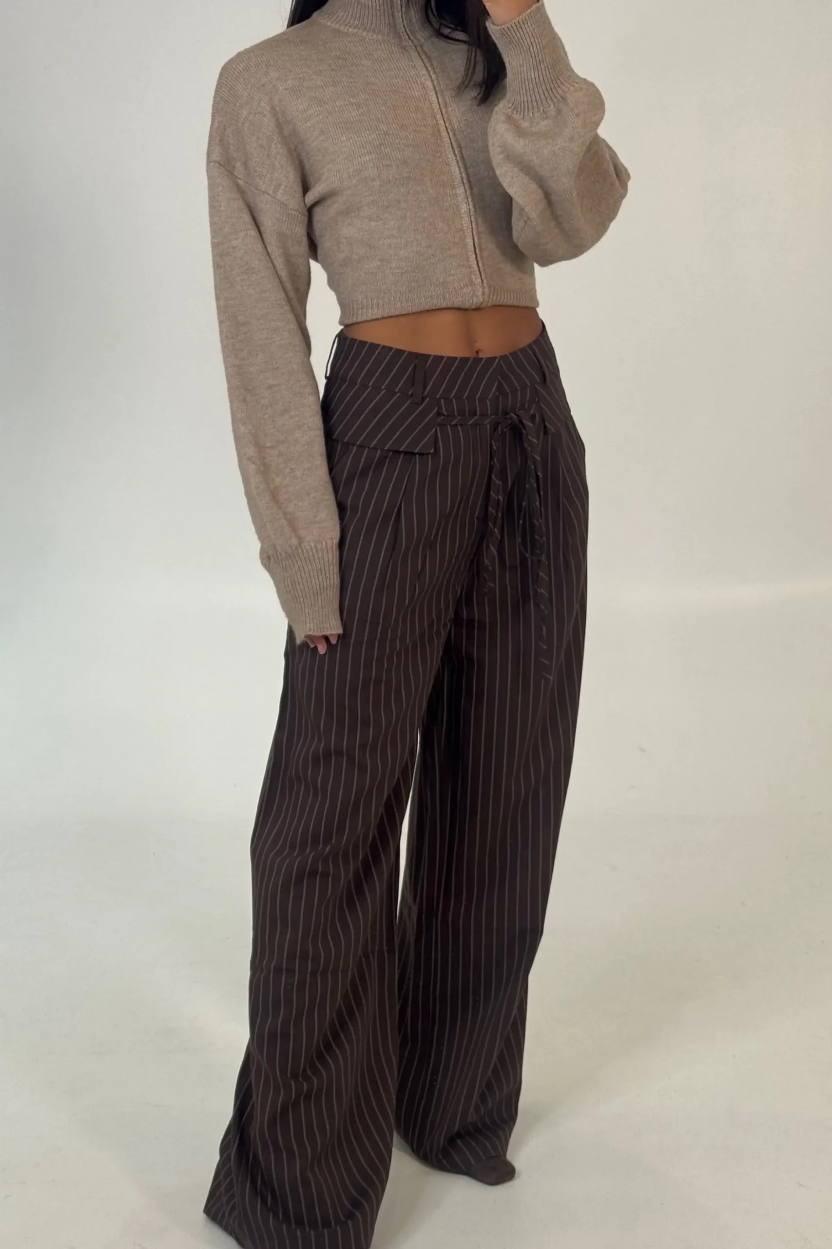 Meet the Klara Pinstripe Pants. Make a statement in these pinstripe pants, featuring a relaxed flared leg that brings effortless sophistication to your look. Designed with a secure zipper and clasp closure, they’re finished with a unique waistband collar detailing that adds a tailored, fashion-forward twist. Perfect for elevating both office and off-duty outfits.