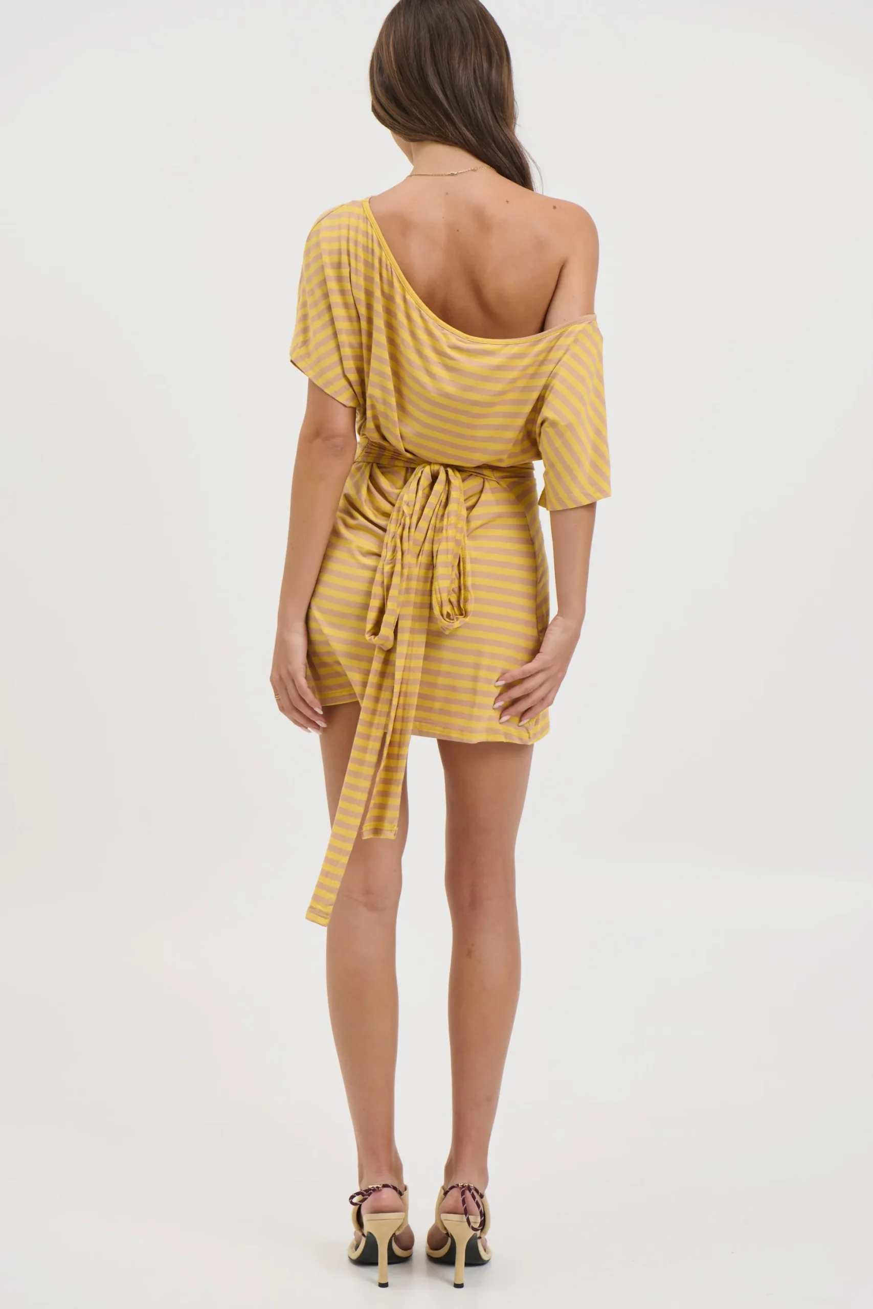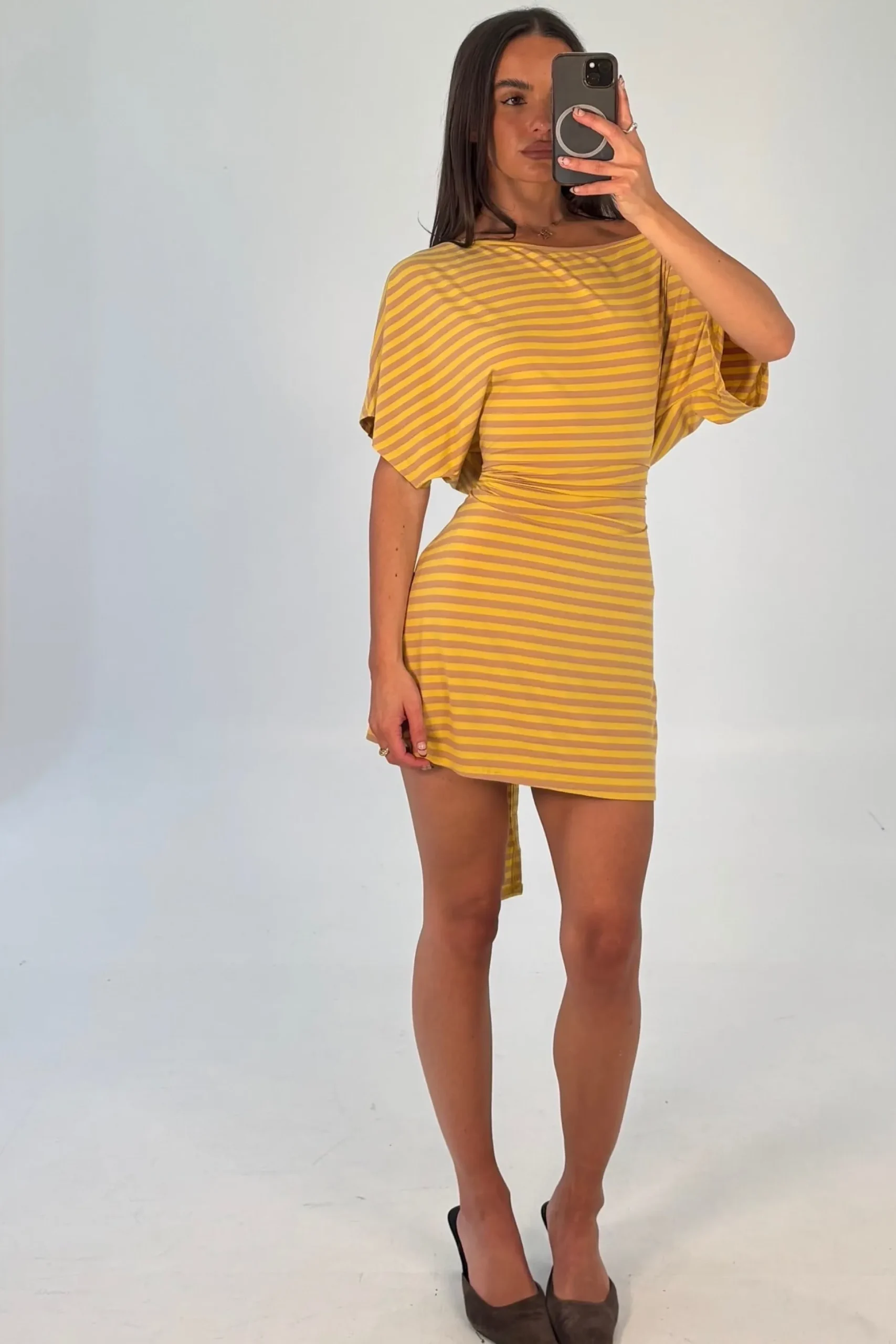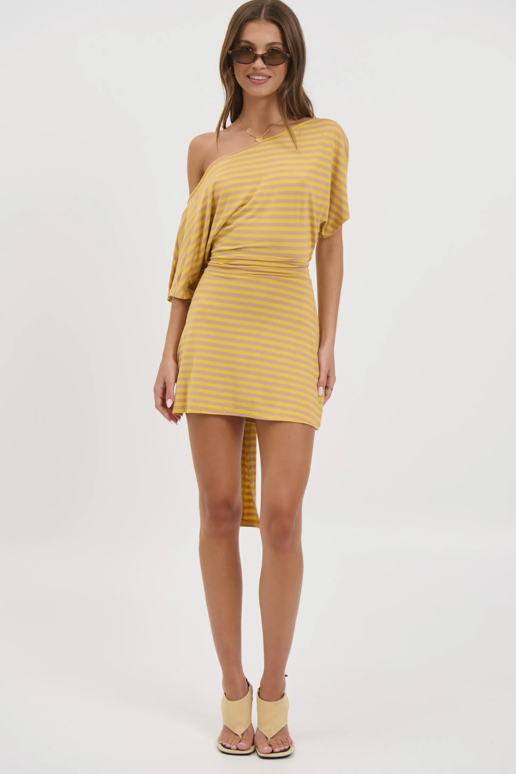 Meet the Lana Mini Dress, The oversized tee-style sleeves offer a casual, effortless vibe, while the fitted waist cinches in for a flattering silhouette. An asymmetric off-the-shoulder neckline adds a touch of modern edge, making this dress perfect for day-to-night styling.