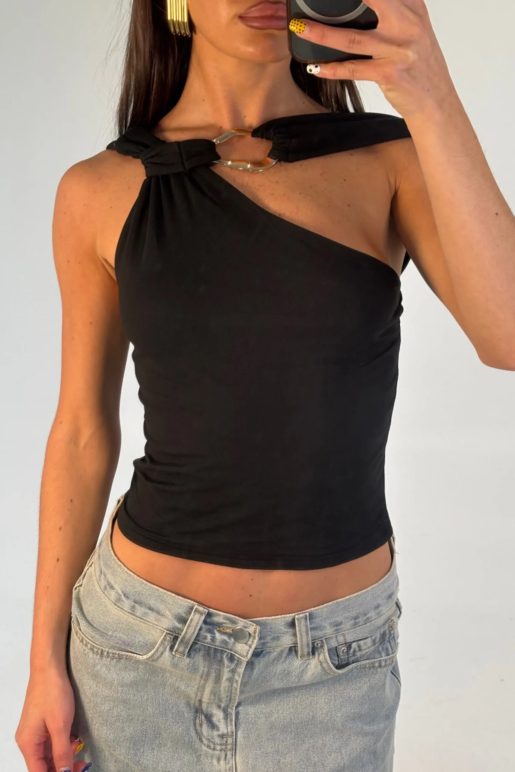 Meet the Leon Top, Featuring stretchy, fitting material, this women’s top hugs your silhouette for a sleek and flattering look. Designed with a stylish shoulder strap, it adds a modern asymmetrical edge, while the gold metal detail elevates the piece with a touch of luxe sophistication.