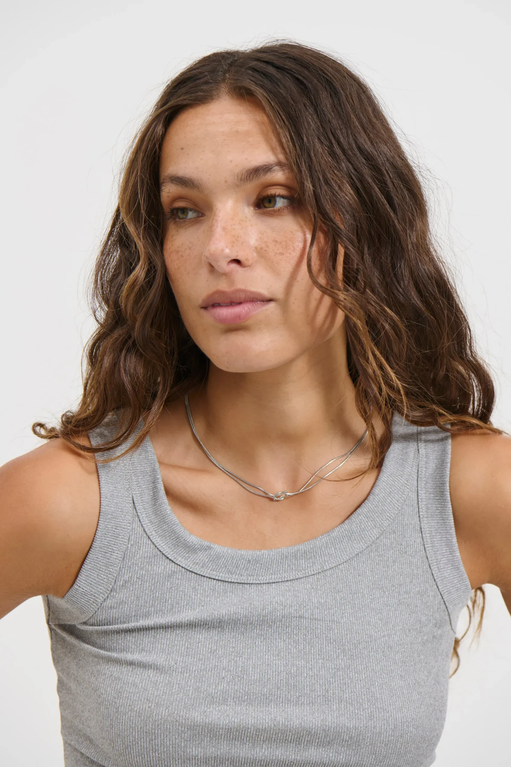 The Lou Necklace features a 38cm+5cm durable stainless steel snake chain, adorned with intricate knot detailing and secured with a clasp closure.