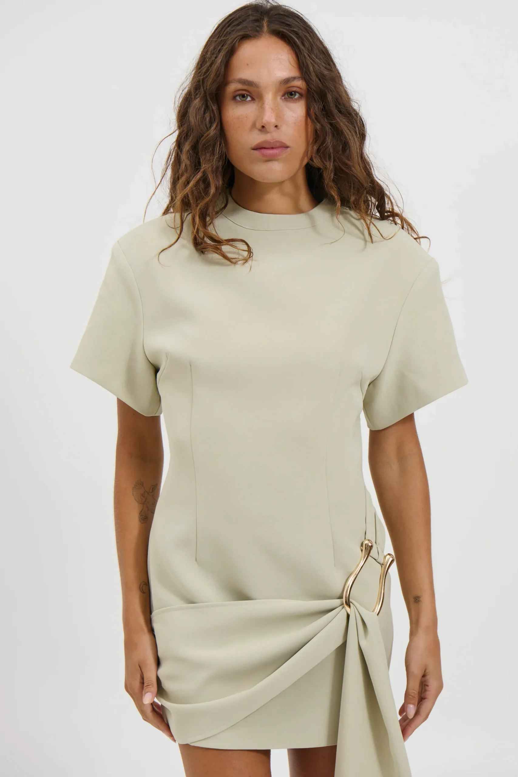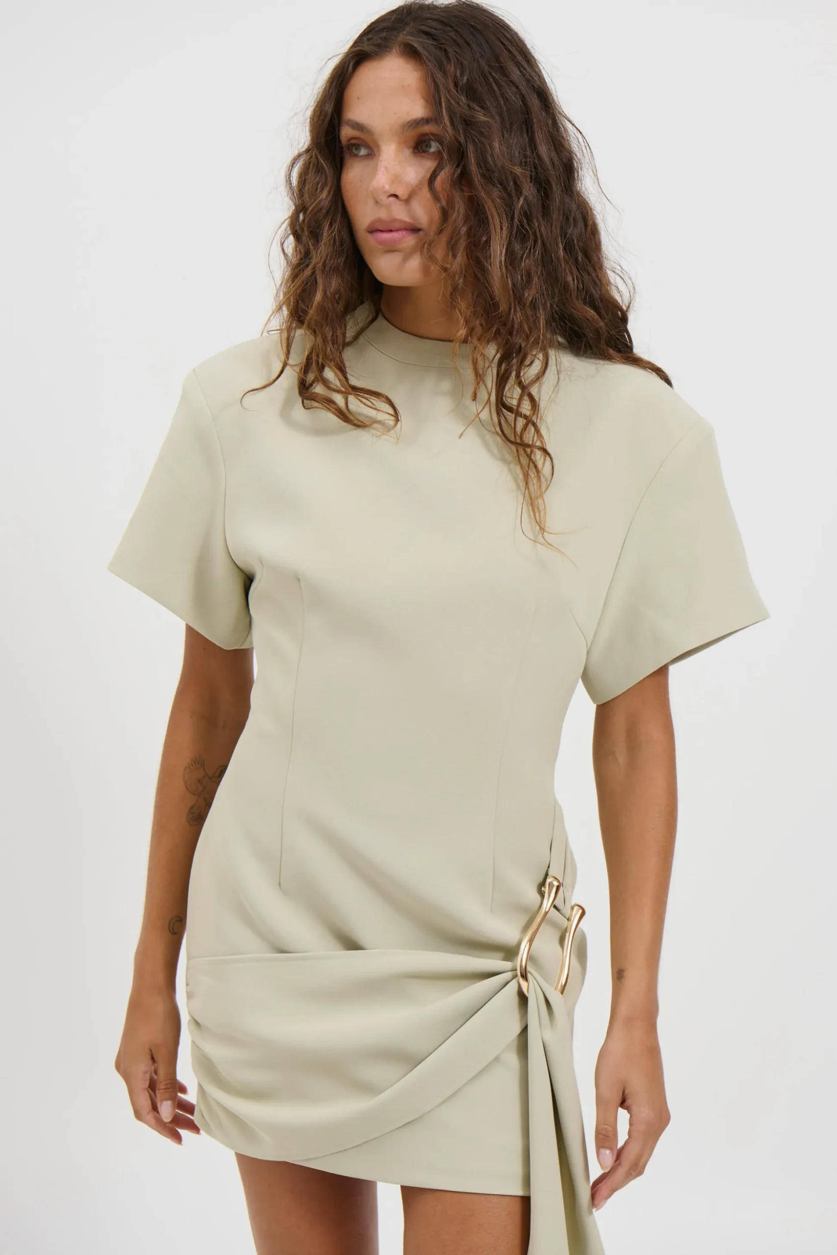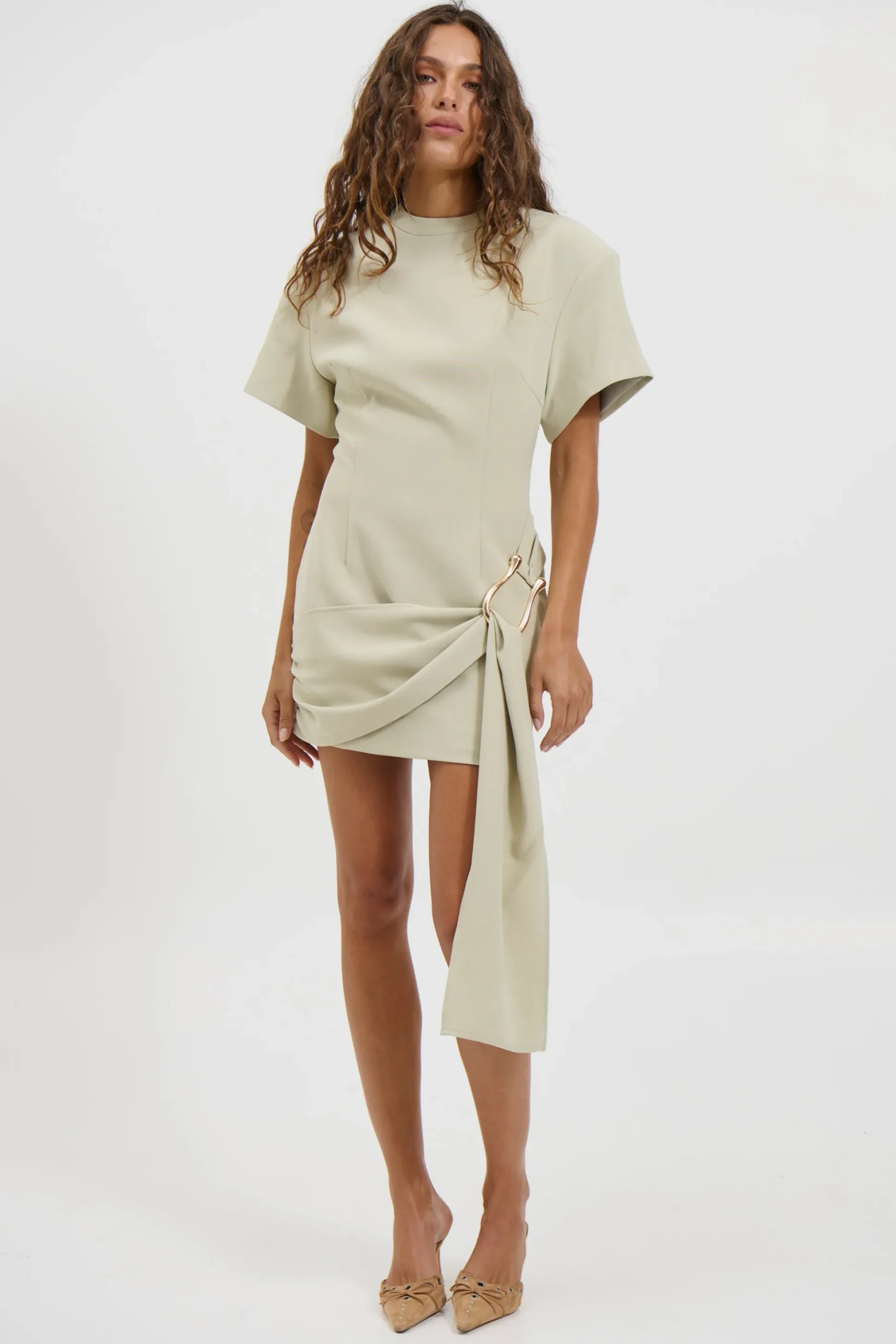 Meet the Martini Mini Dress, featuring exaggerated short sleeves for a bold, structured look. The draped belt cinches the waist beautifully, while gold hardware adds a touch of luxe. Finished with an invisible zip closure for a seamless fit, this dress is perfect for elevated occasions.