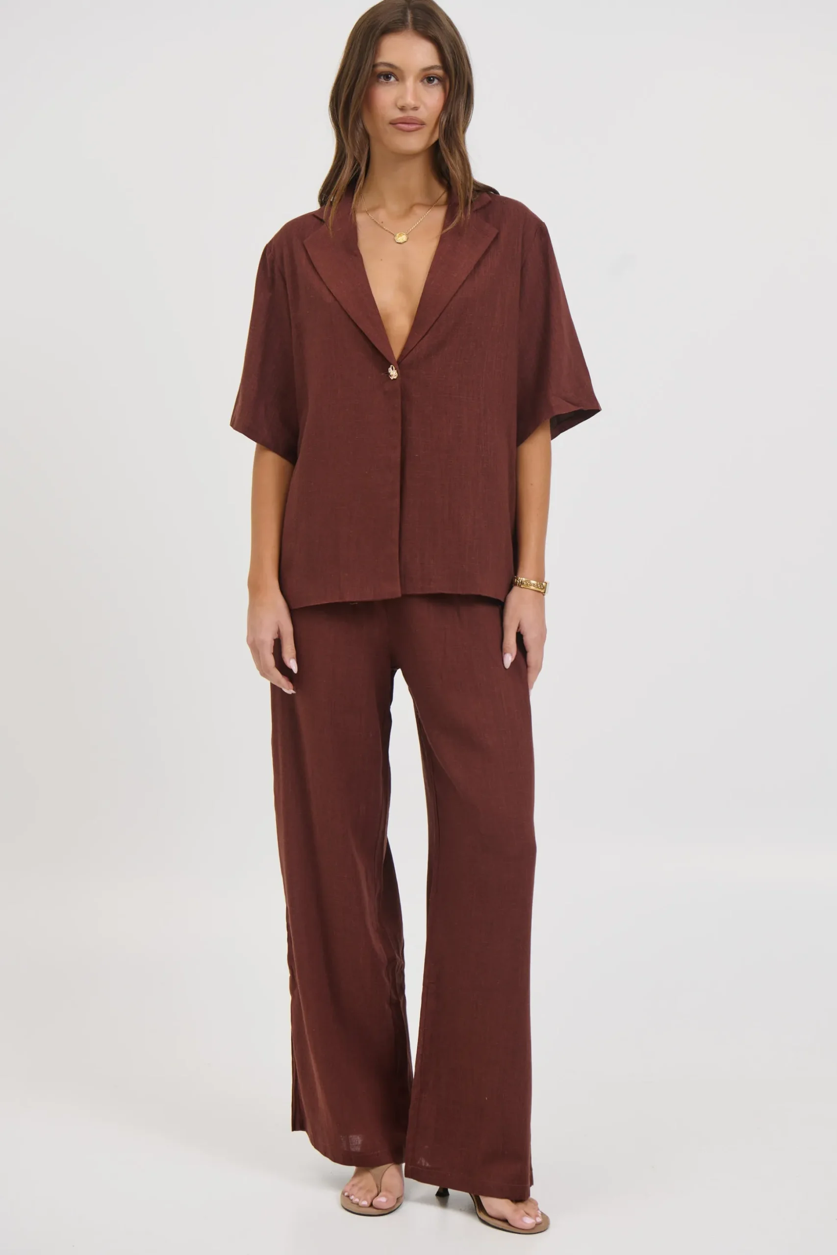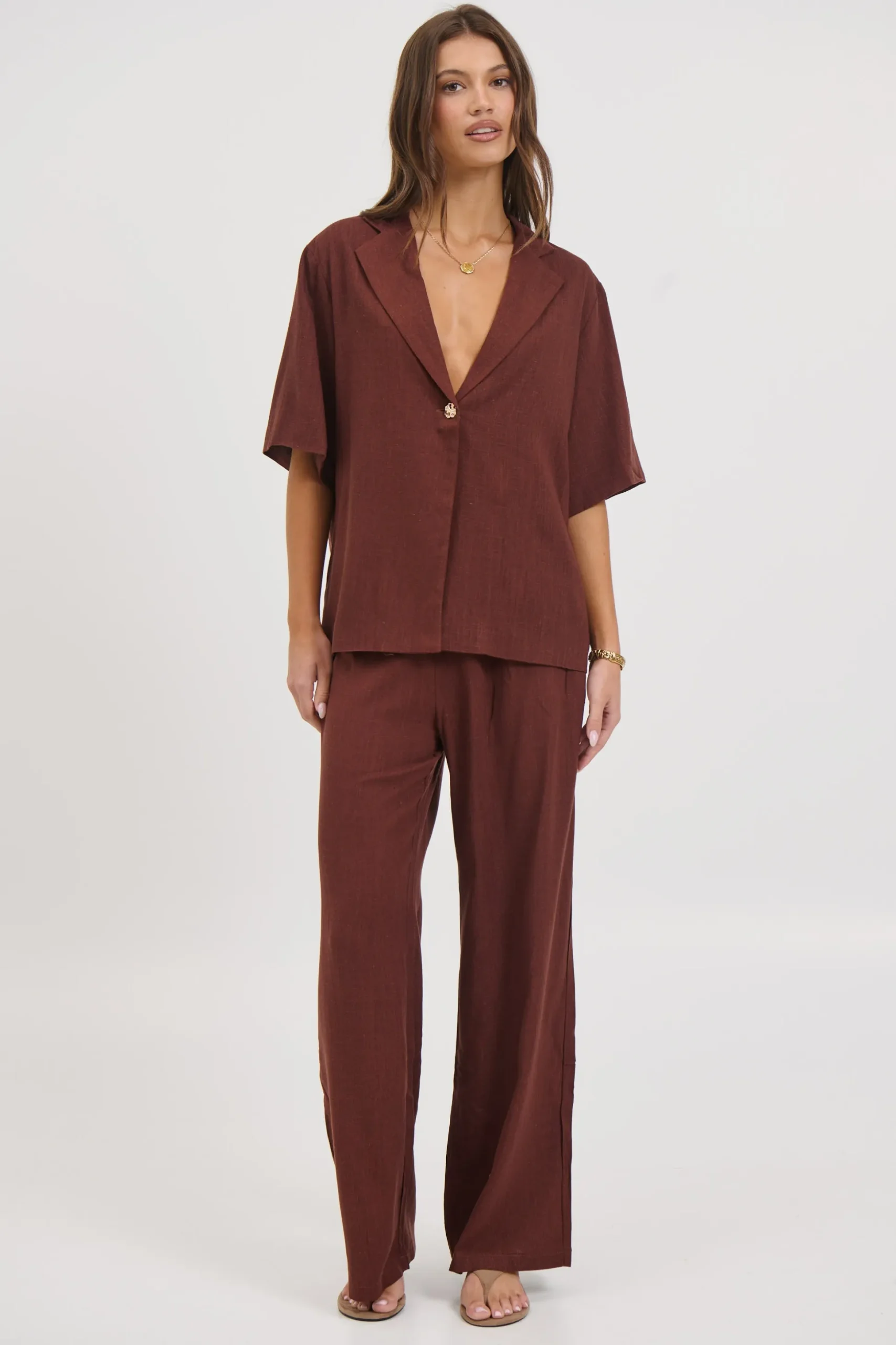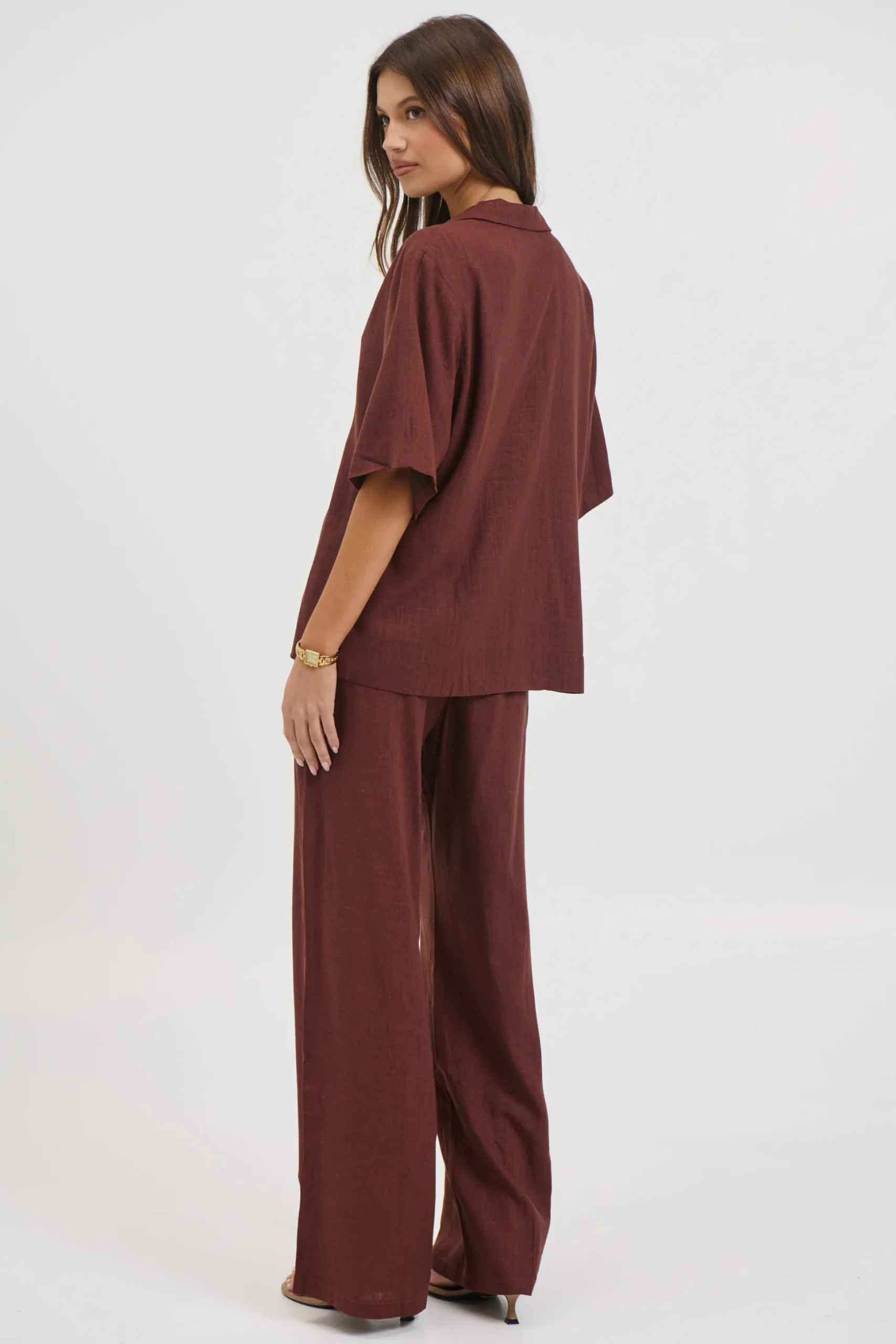 Meet the Meika Set, This effortlessly chic women’s set features relaxed elasticated waistband pants paired with a matching button-down short sleeve shirt. The collared top is finished with gleaming gold buttons for a polished touch, balancing casual comfort with elevated style.