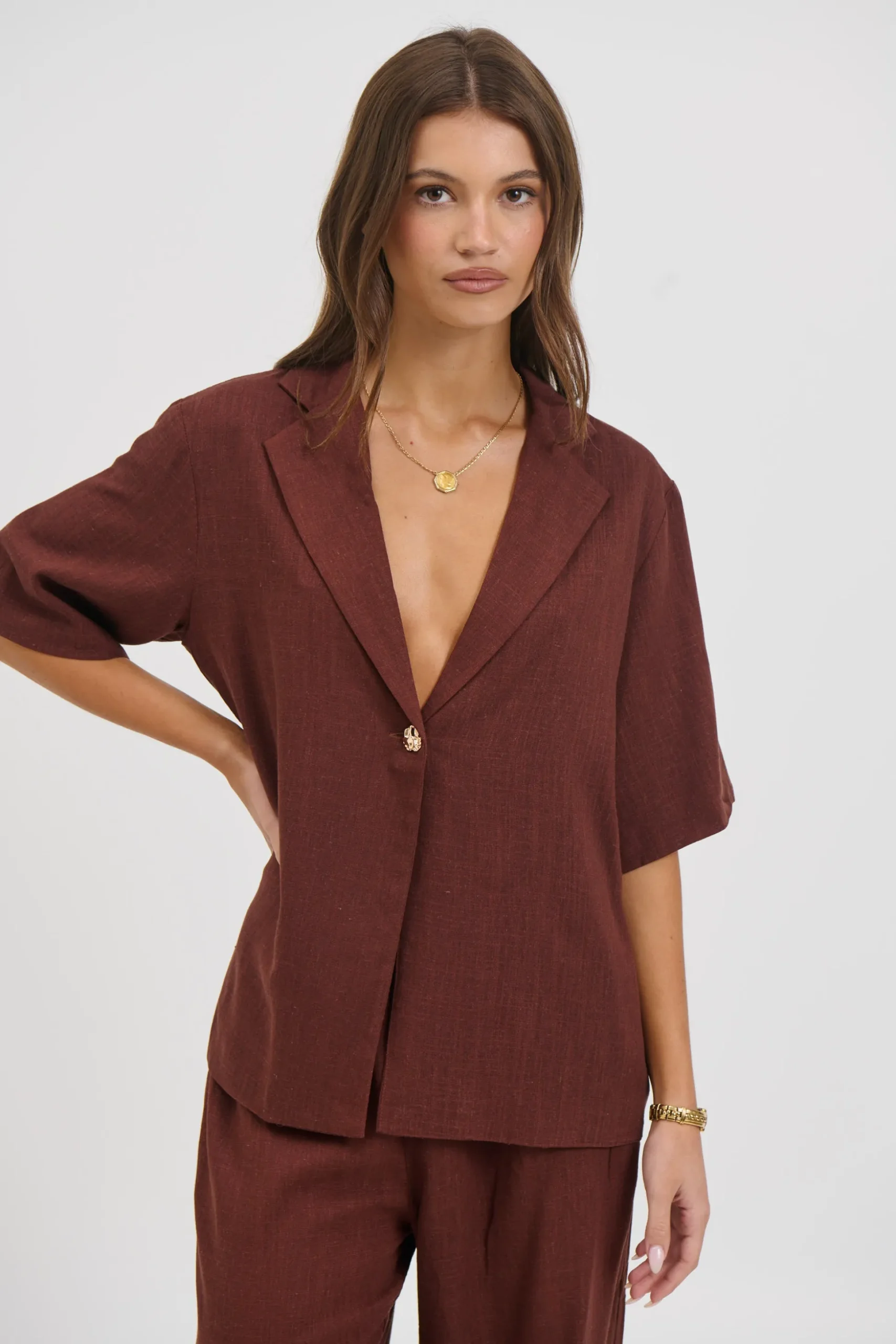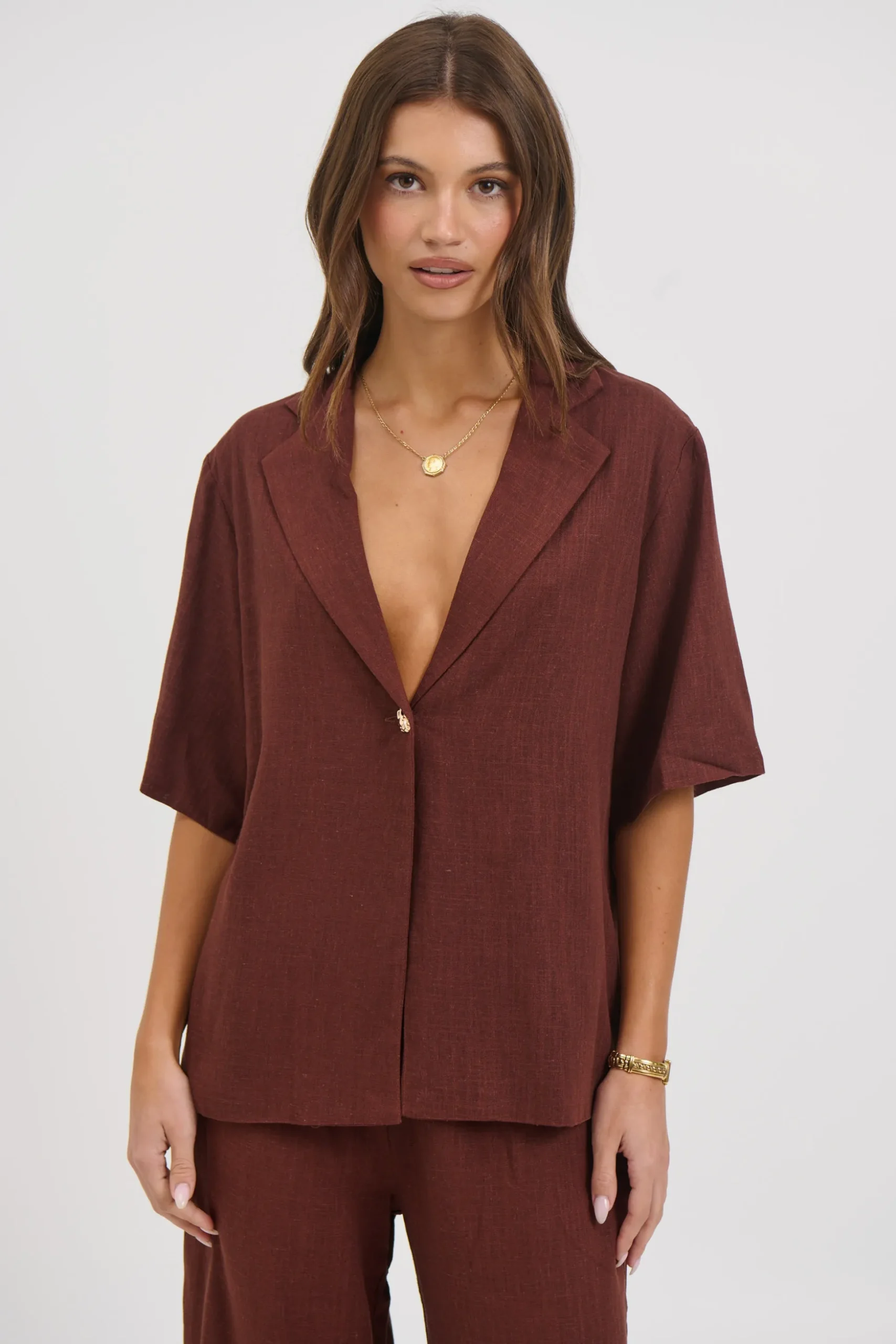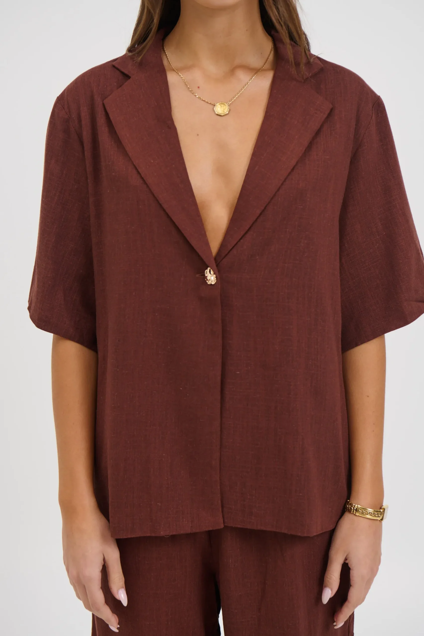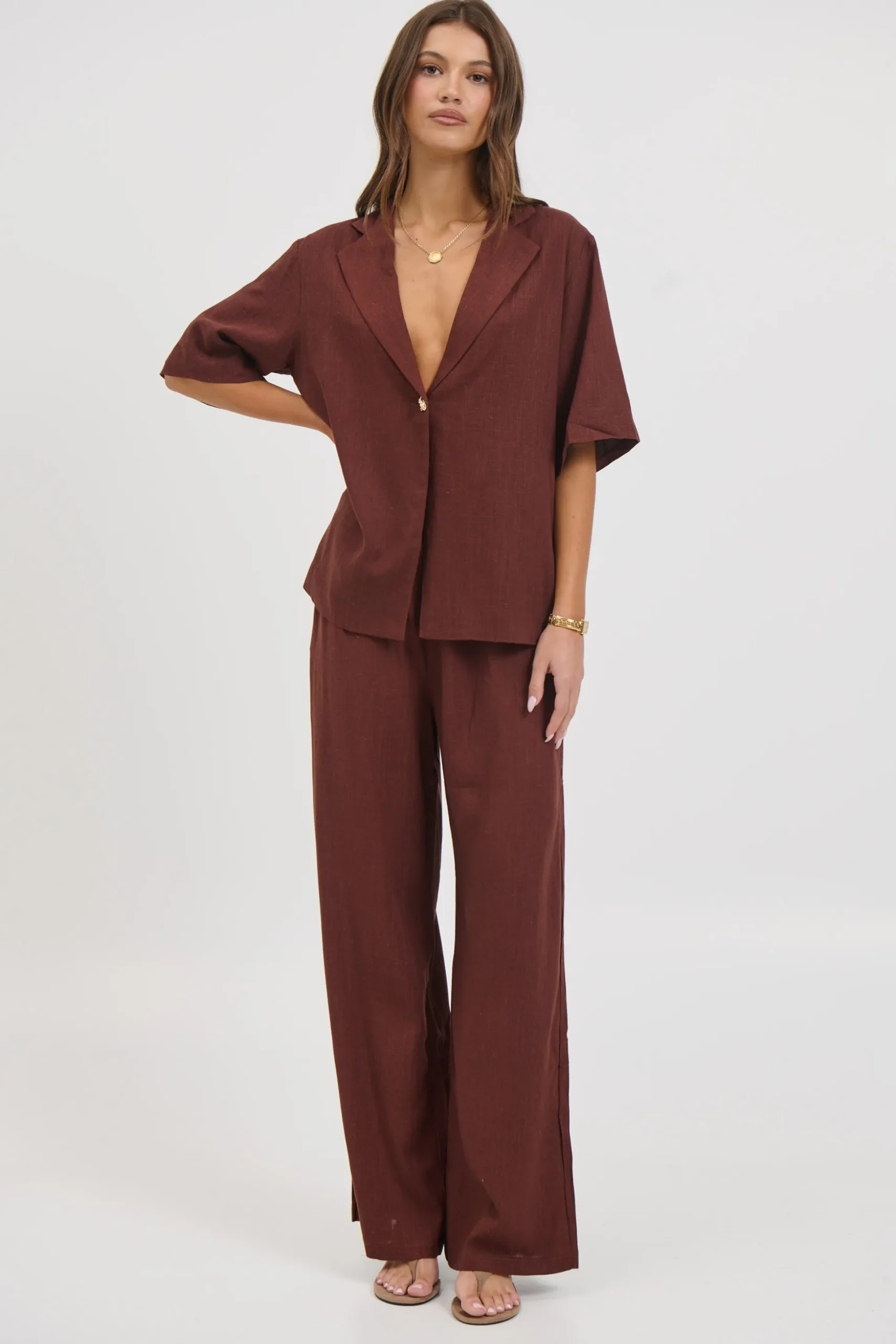 Meet the Meika Set, This effortlessly chic women’s set features relaxed elasticated waistband pants paired with a matching button-down short sleeve shirt. The collared top is finished with gleaming gold buttons for a polished touch, balancing casual comfort with elevated style.