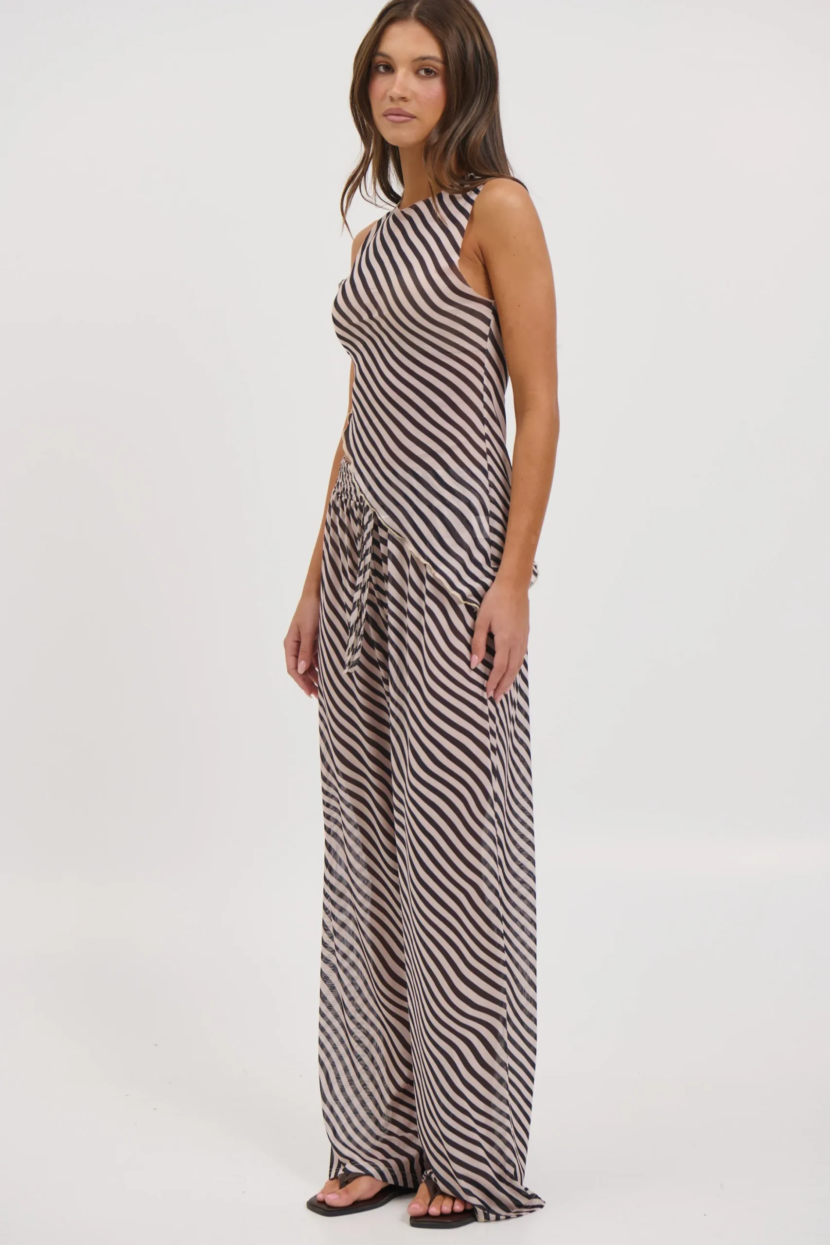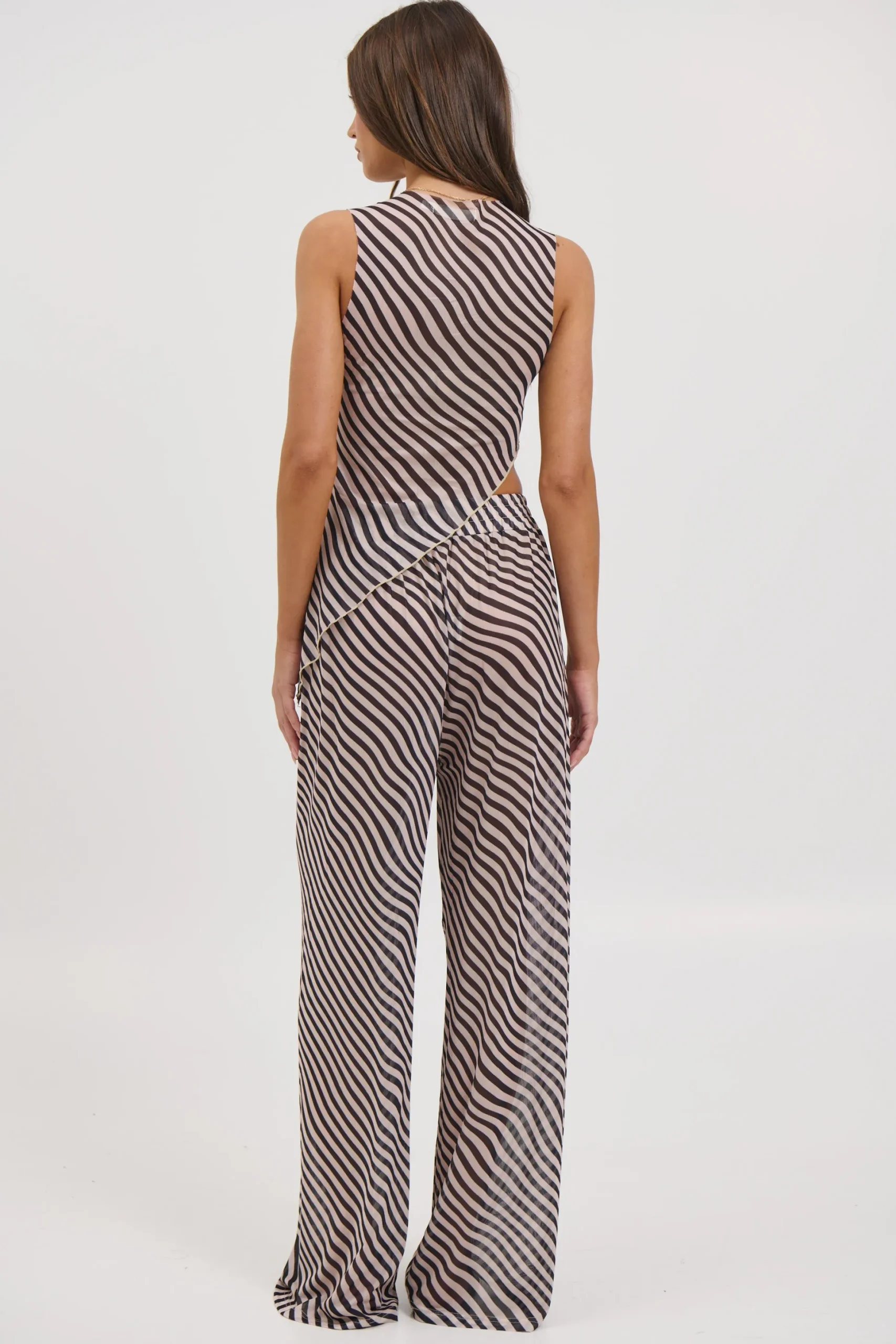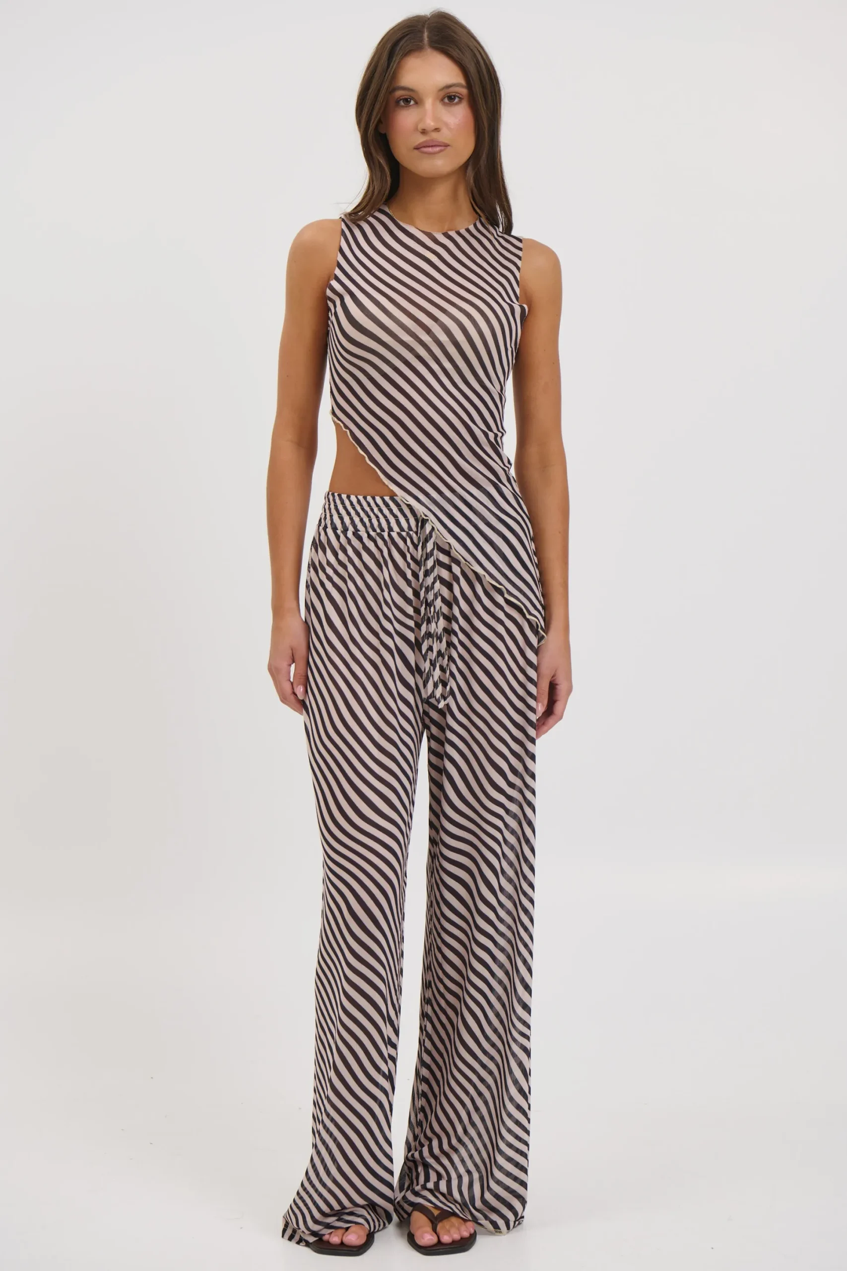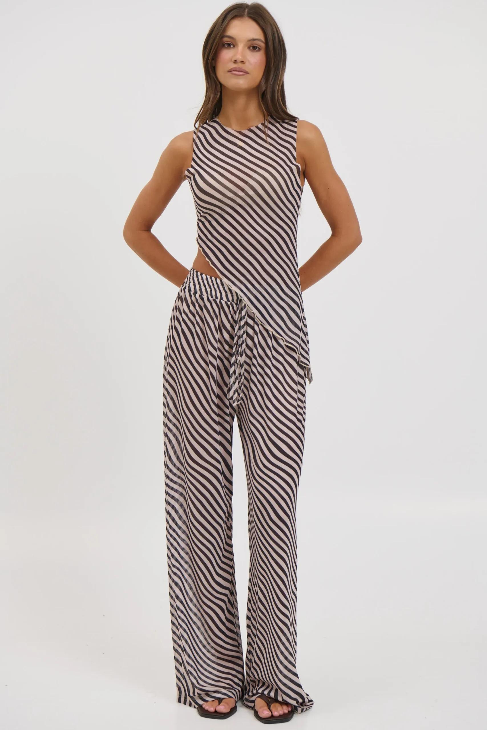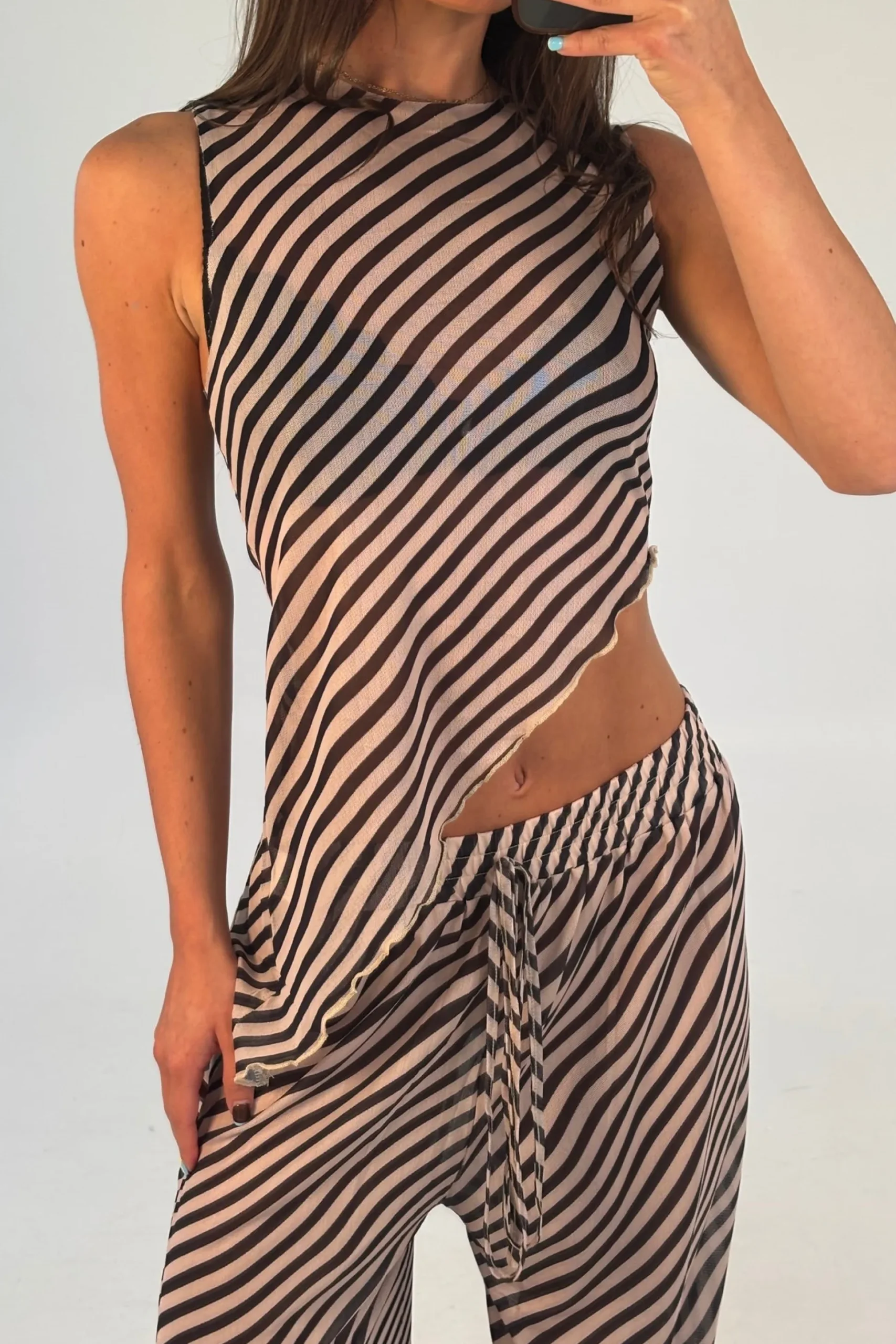 Meet the Mia Sheer Set, Featuring a matching set designed in a striped mesh material, this look includes straight-leg pants with an elasticated drawstring waist and full lining for comfort. The coordinating top features a sheer, asymmetric silhouette for an effortlessly modern and elevated feel.