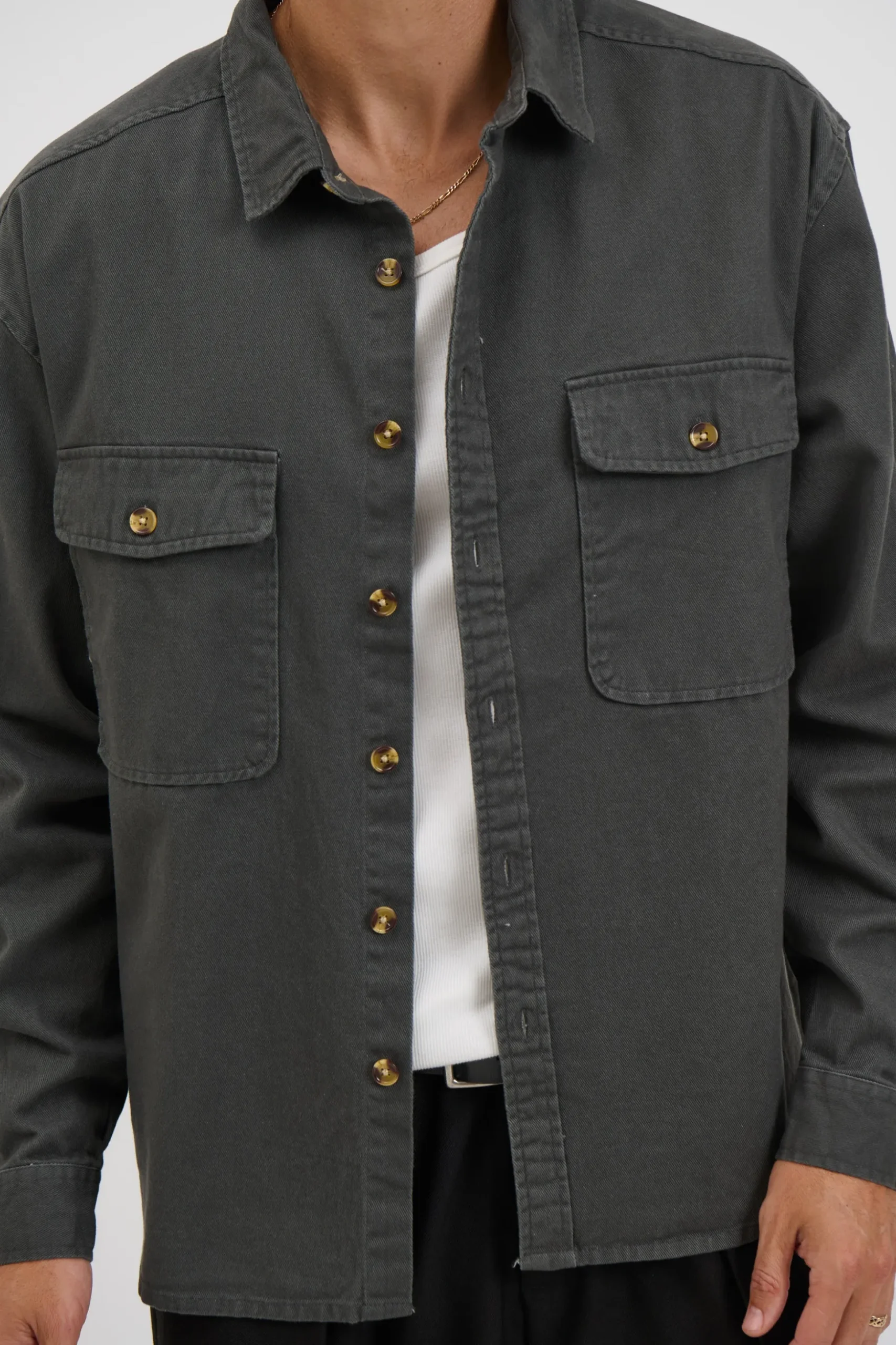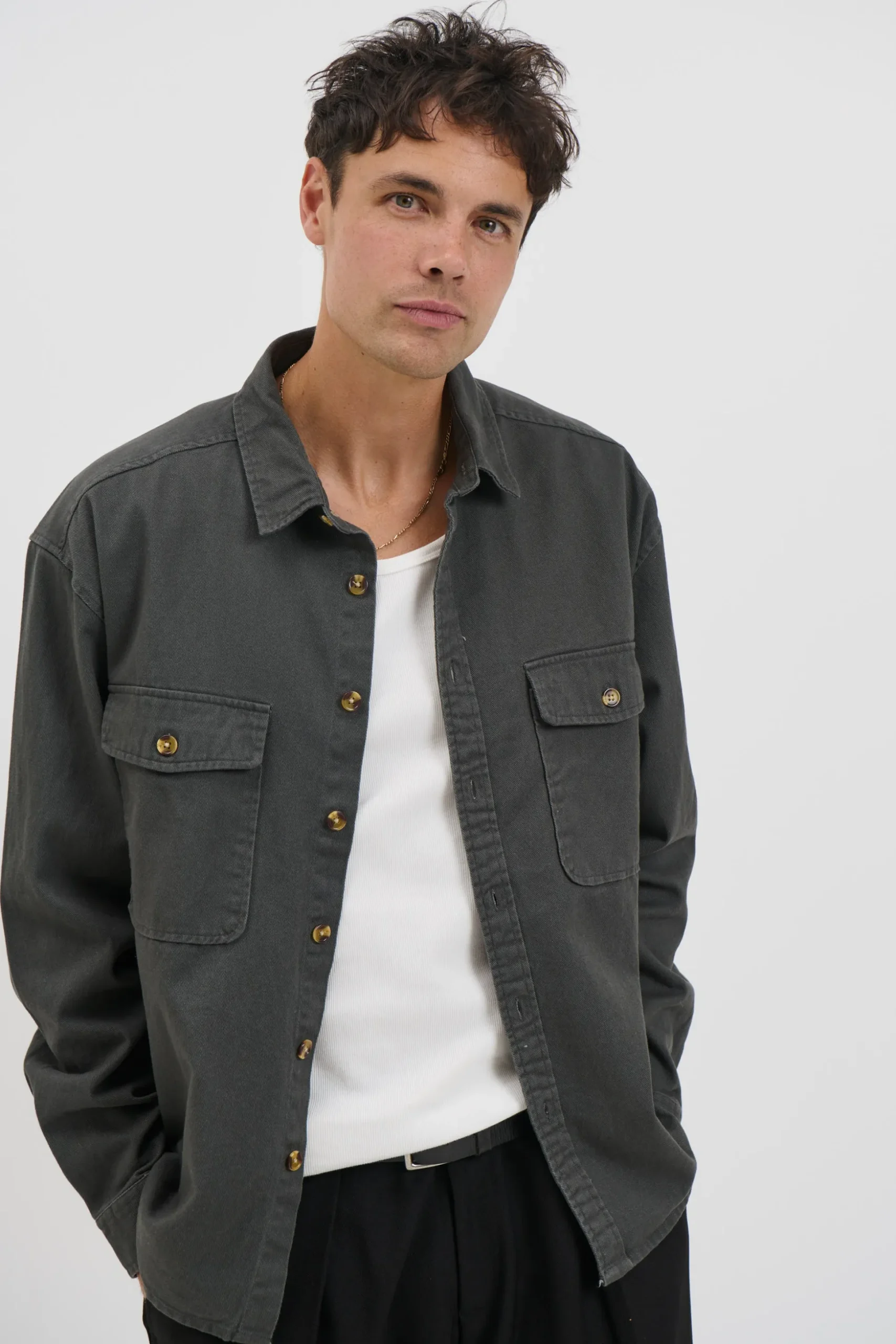 The Mike Cotton Drill Shacket combines the best of a shirt and jacket with a slightly oversized fit for a relaxed, on-trend look. It features a front tortoise shell button closure and functional front pockets, adding a touch of sophistication and practicality.