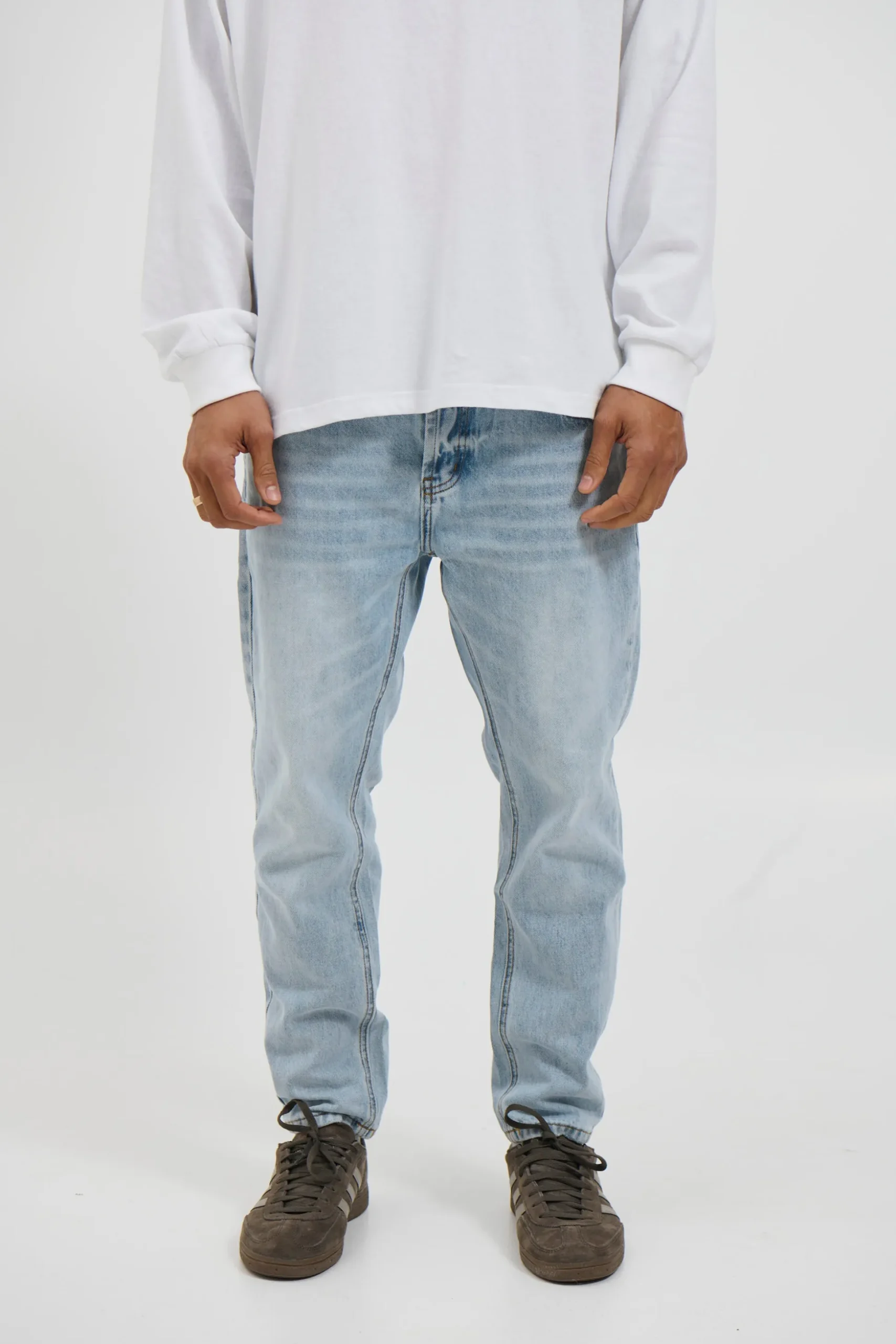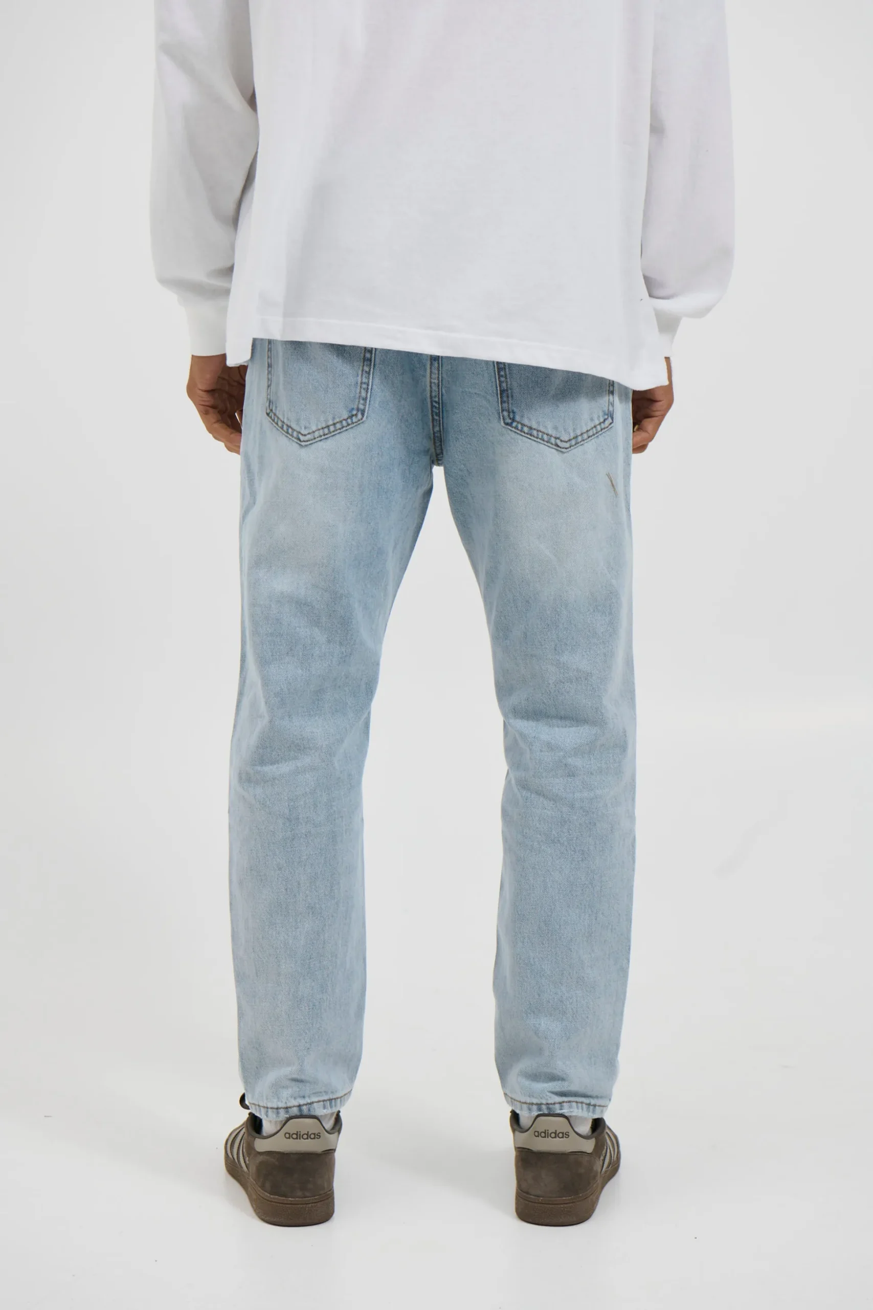 The Miles Straight Denim in Light Blue offers a comfortable relaxed silhouette with a classic straight leg design. This versatile piece features functional double pockets at both front and back, complemented by belt loops and a traditional button fly closure. Wear with cuffs rolled up or down for different styling options.