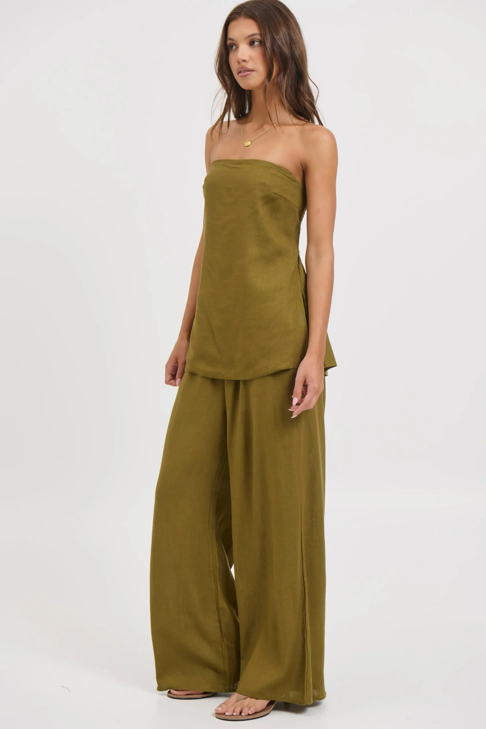 Meet the Nora Set, includes a strapless top with side splits and an elasticated back panel for a comfortable fit. Paired with wide-leg pants featuring an elasticated waistband, side pockets, and an unlined finish, this effortless duo is perfect for relaxed yet stylish dressing.