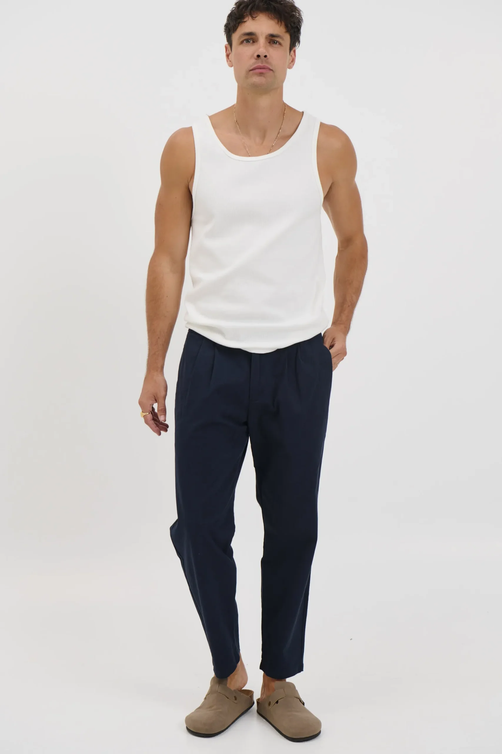 The NTH Cropped Pleat Pant features pleated cotton fabric and is designed with double front pockets, as well as a single button back pocket. It also includes belt loops for added functionality.